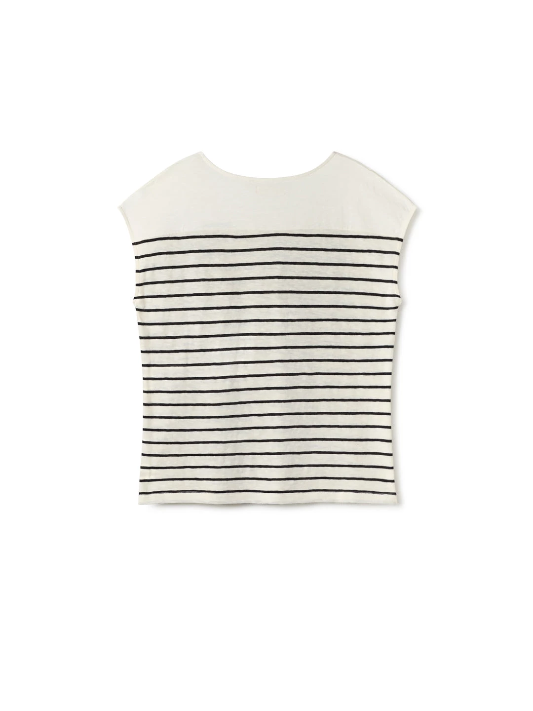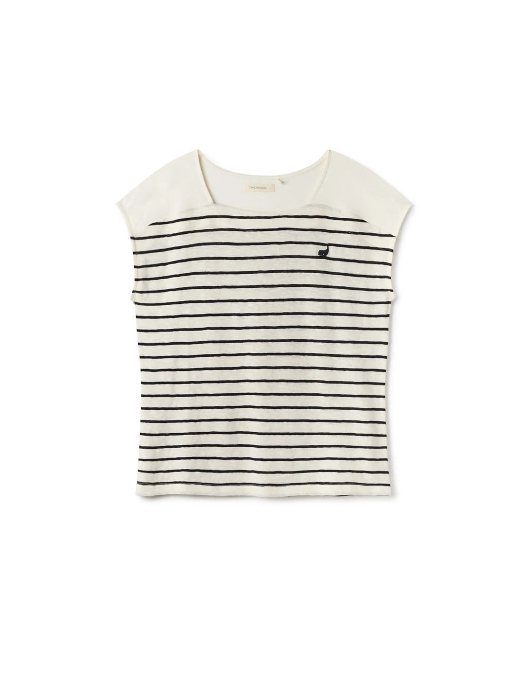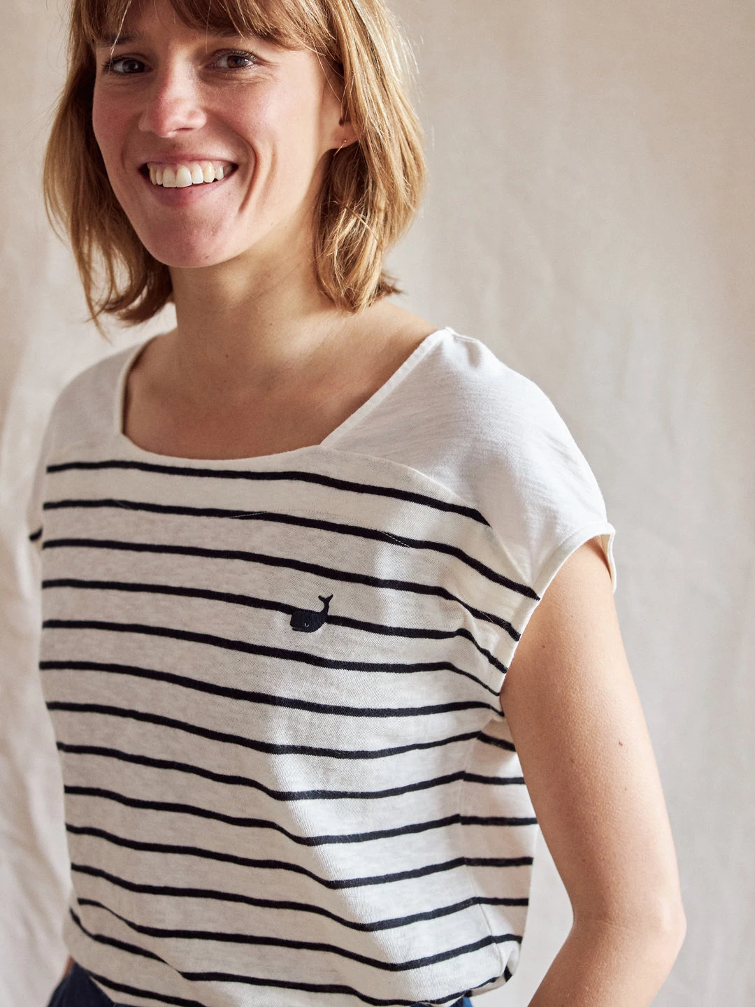 You know we love the ocean, hence the maritime style of the Romsdal top. In a soft to the touch slub fabric, short batwing sleeves, navy stripes and matching whale embroidery on the chest.Â