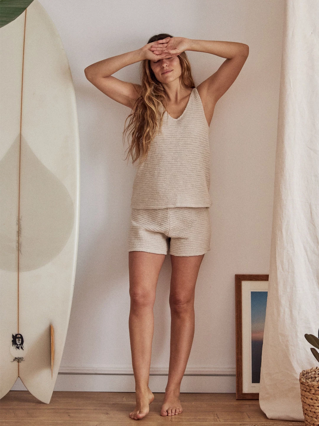 For the warmer weather, here’s the eco-friendly Runde shorts. Designed in a light fabric and natural soft colour with side pockets.Â