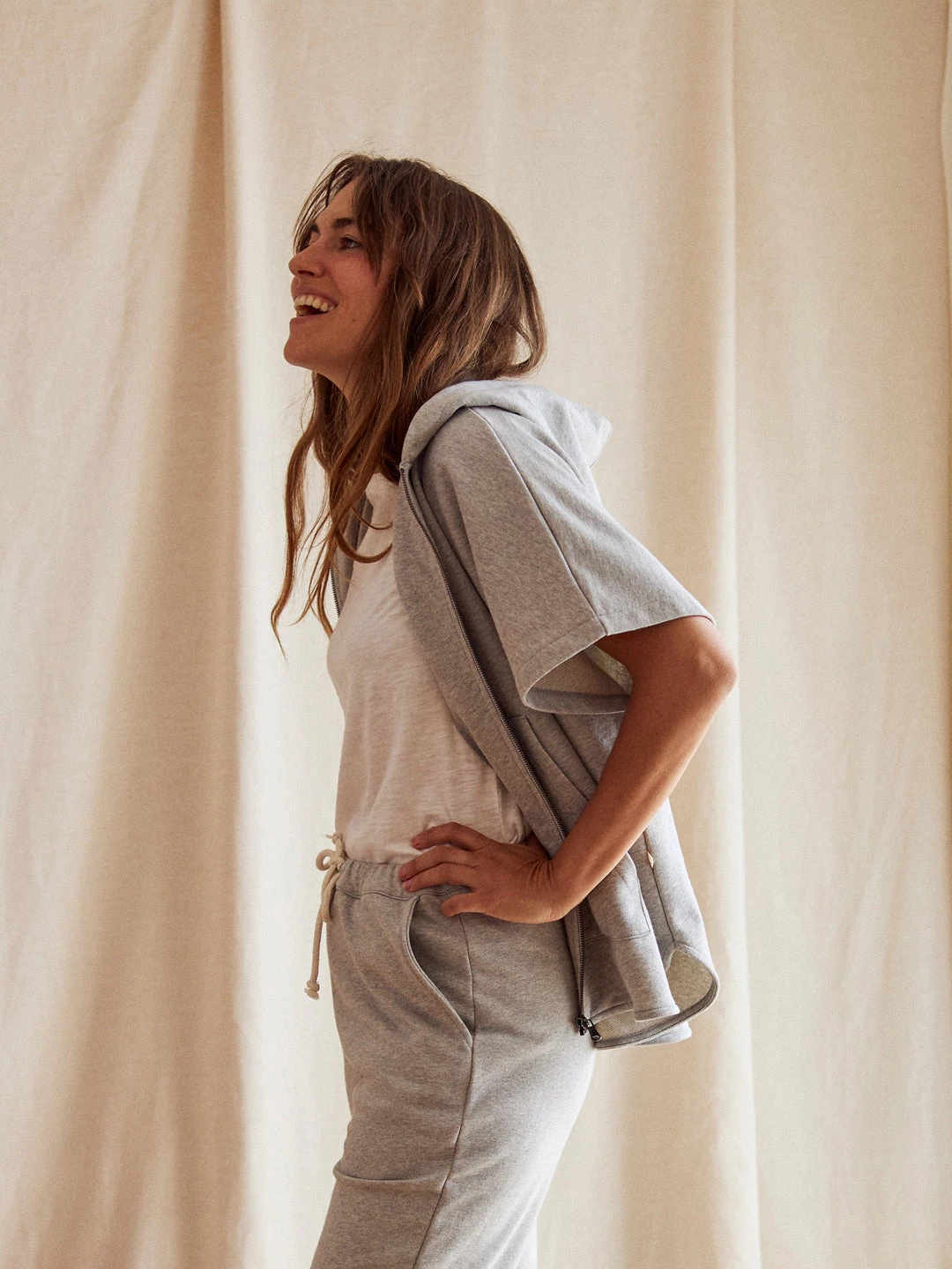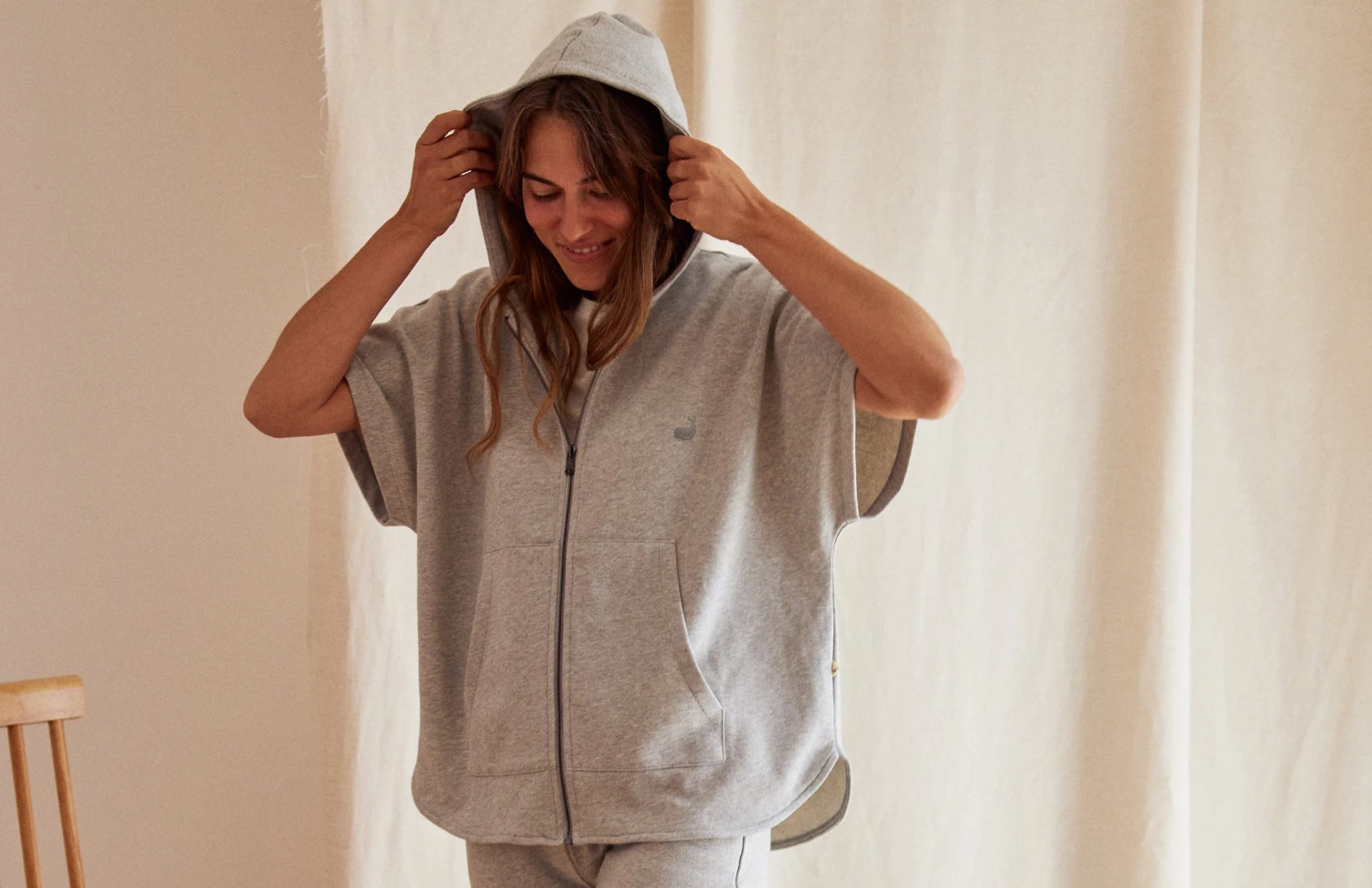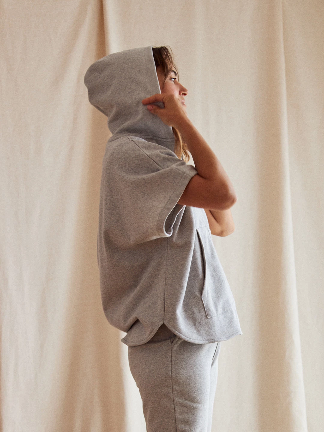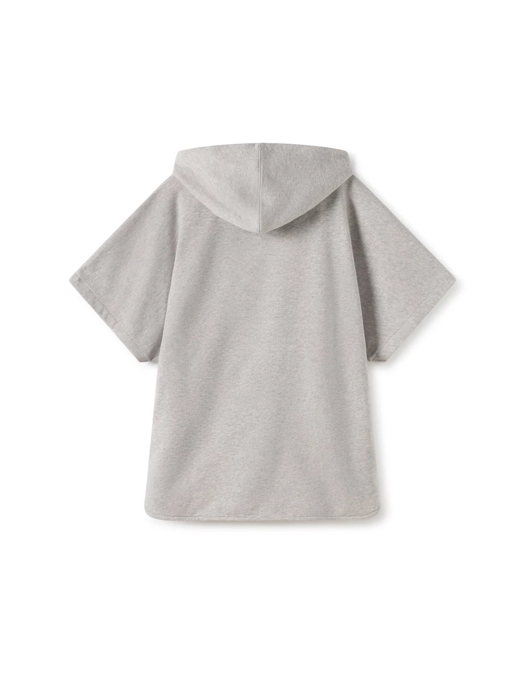 The Agatonisi is our new short-sleeve sweatshirt. Designed with batwing sleeves, a hood and a pocket on the chest divided by a frontal zipper. Also features navy blue whale embroidery, a fairly oversized fit and hip-length cut.