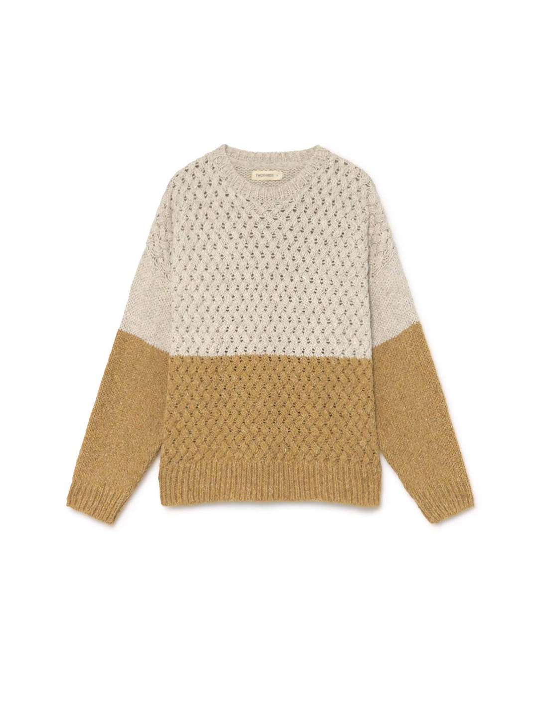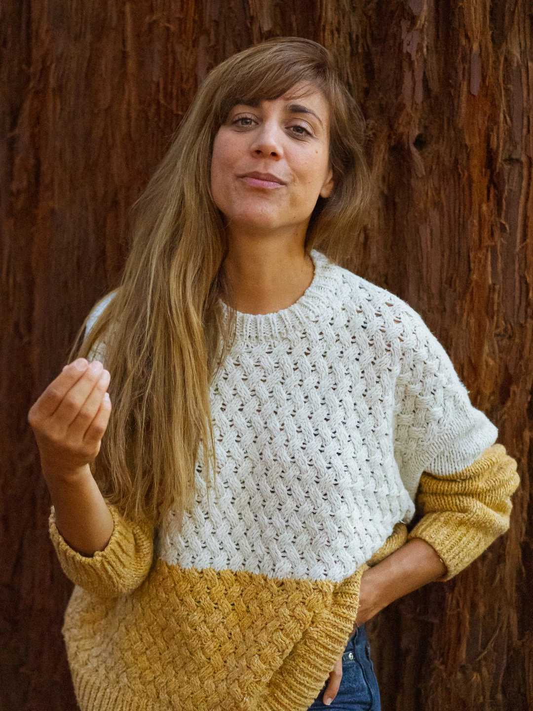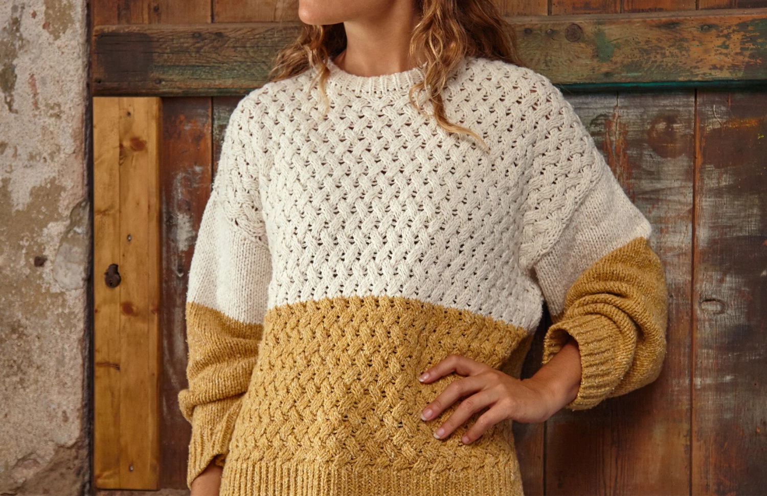 We present the Apataki: our big block-colour design that is supported by a thick woven cross pattern in the front to spice up this unique knit. A real statement piece for your sustainable wardrobe, designed in a fairly oversized fit and cut a bit short.