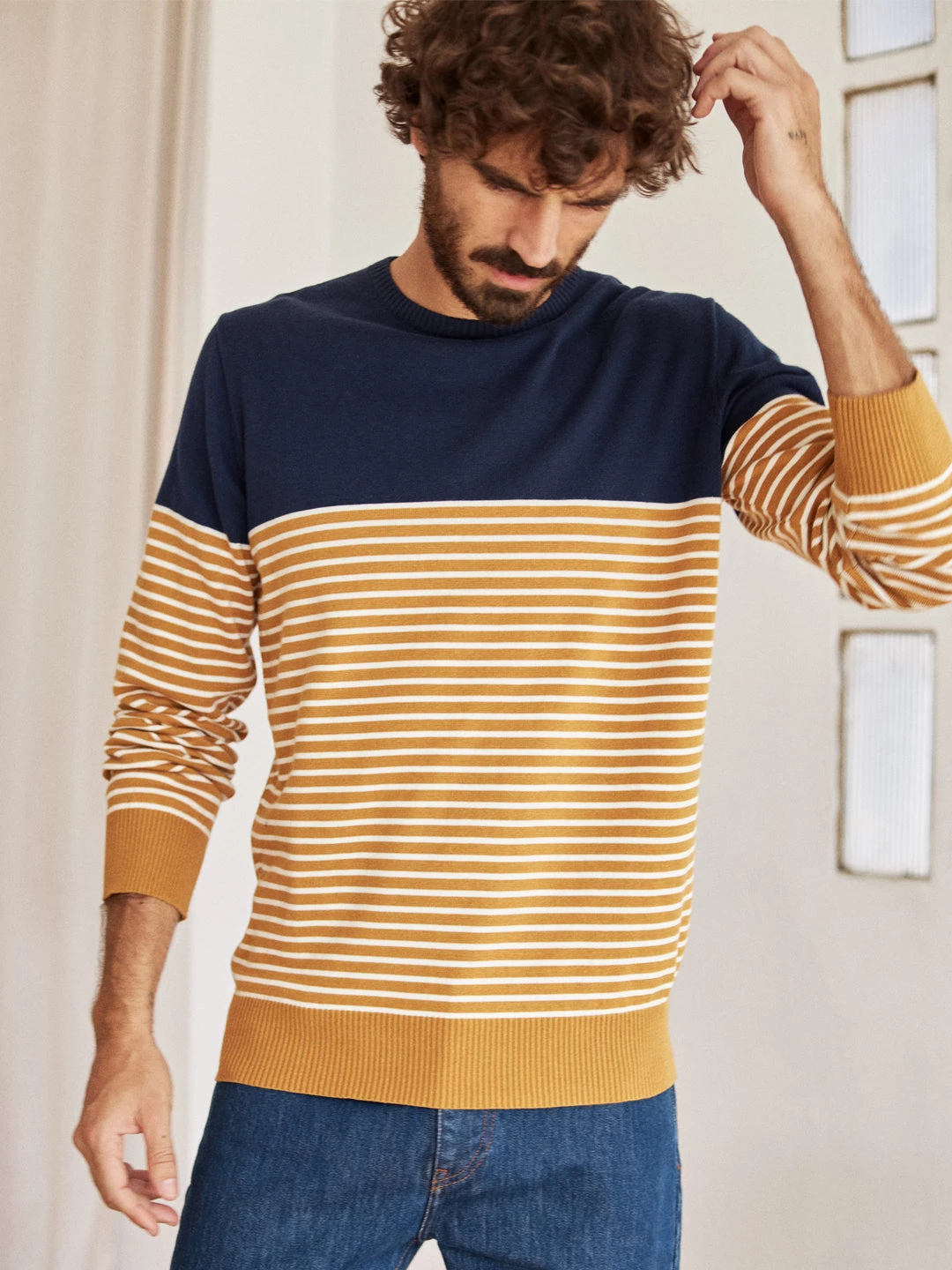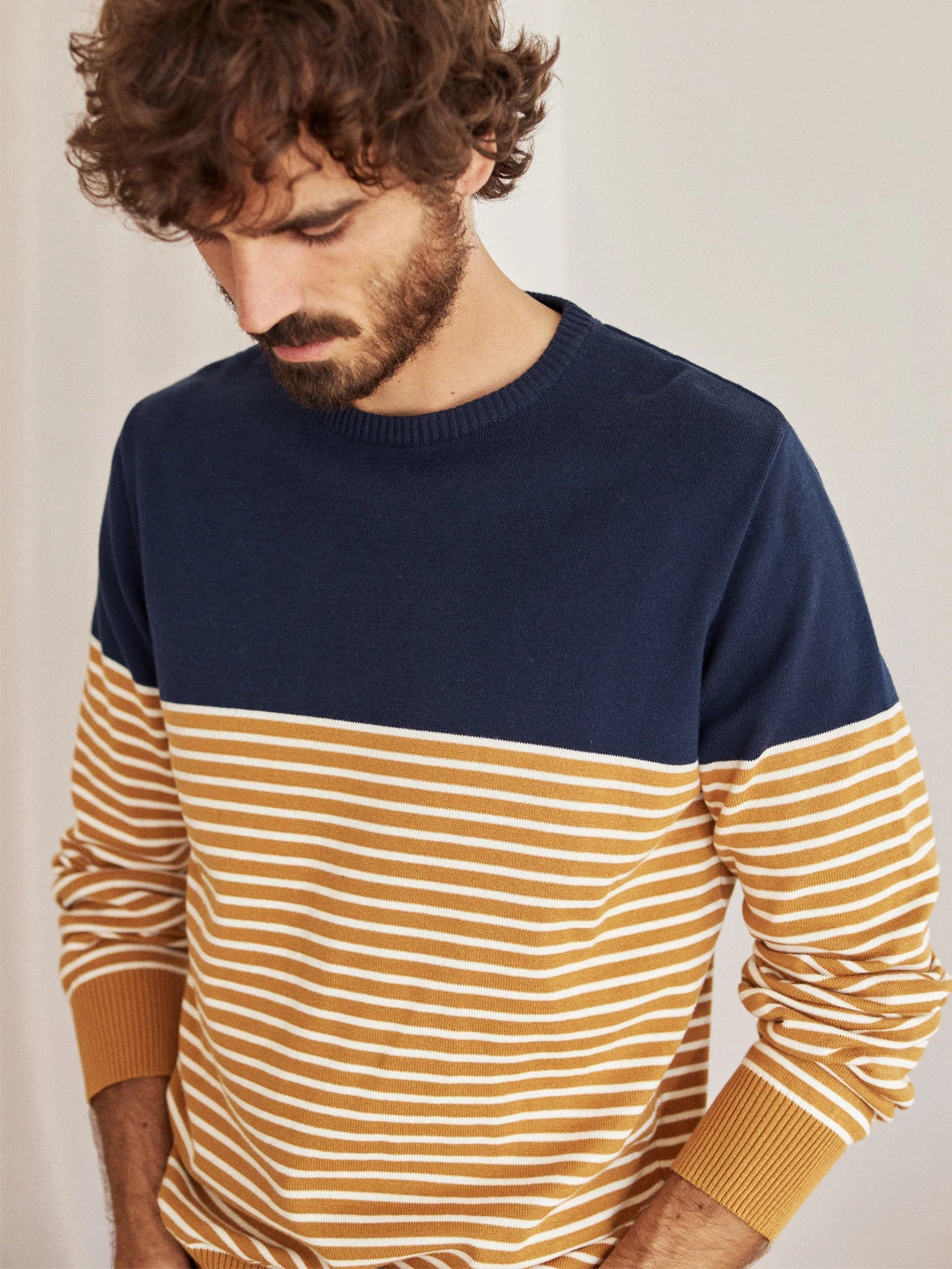 As you know, the ocean is our biggest inspiration so we are proud to present the Delos knit to you. The navy blue reminds us of the beauty of the ocean and the light brown of the sand. Designed in a regular fit and hip-length cut.