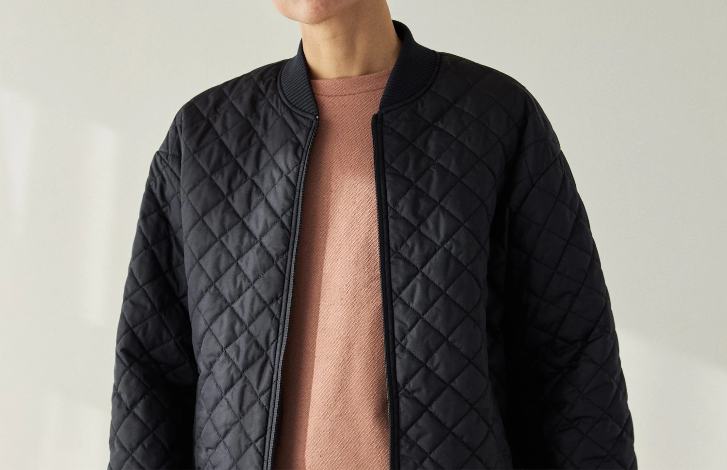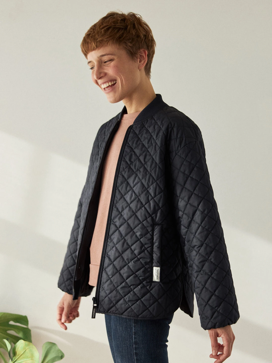 The Dolin windbreaker jacket is made entirely from recycled plastics, protecting the environment while creating a beautiful garment. Designed with a thin padding, a ribbed neckline, bottom side openings, gathered cuffs and 3 pockets in total – one on the inside. The jacket comes in a regular fit and hip-length cut.
