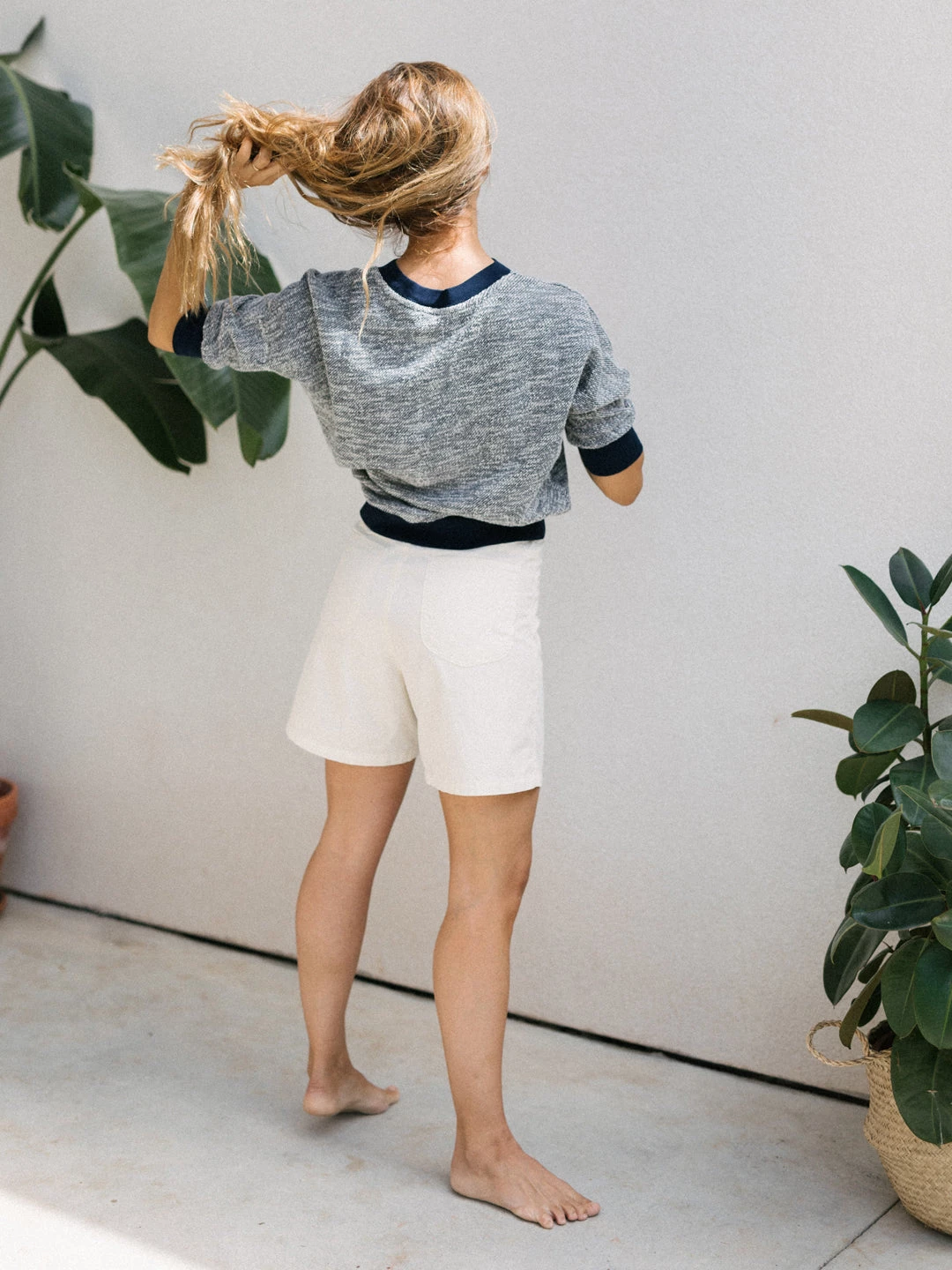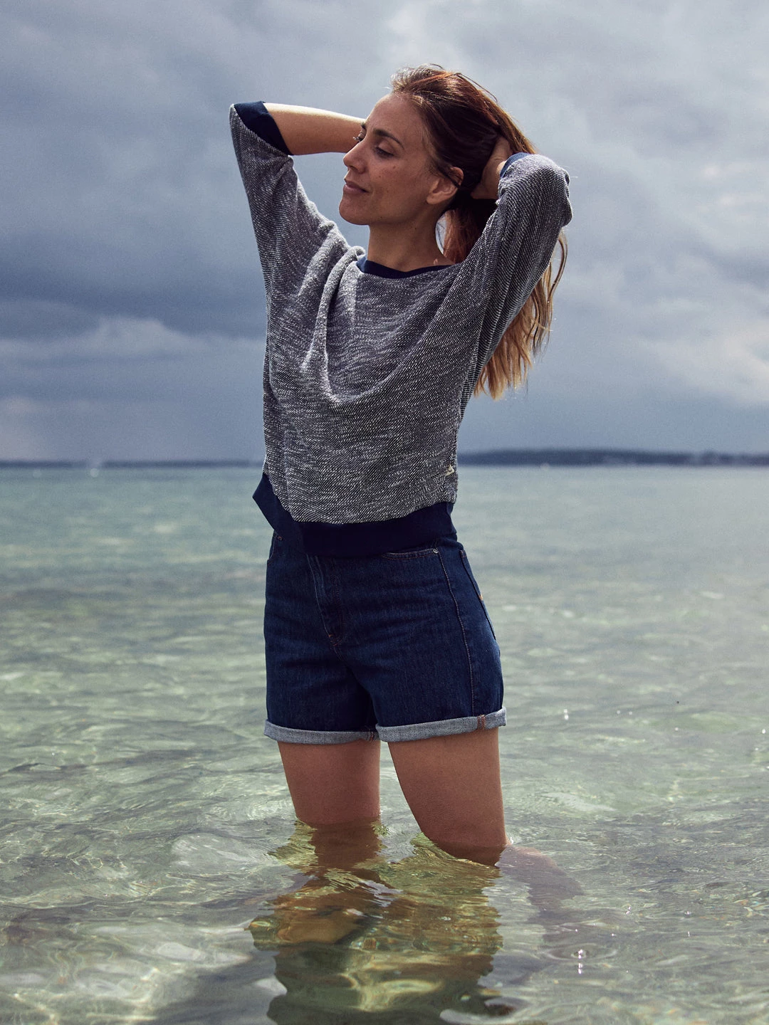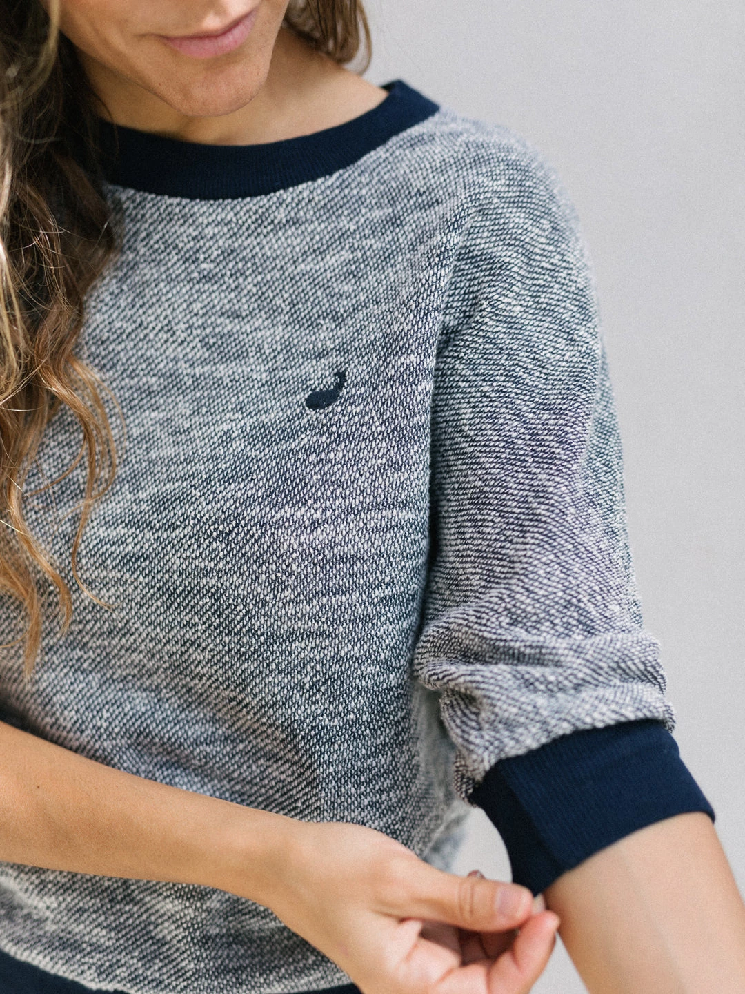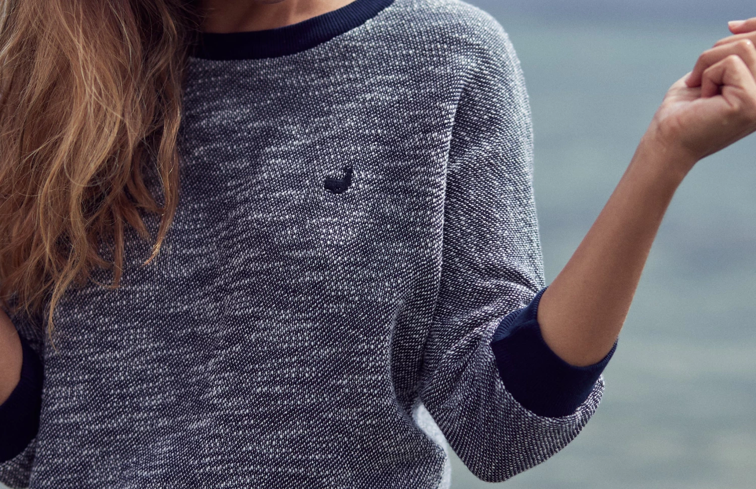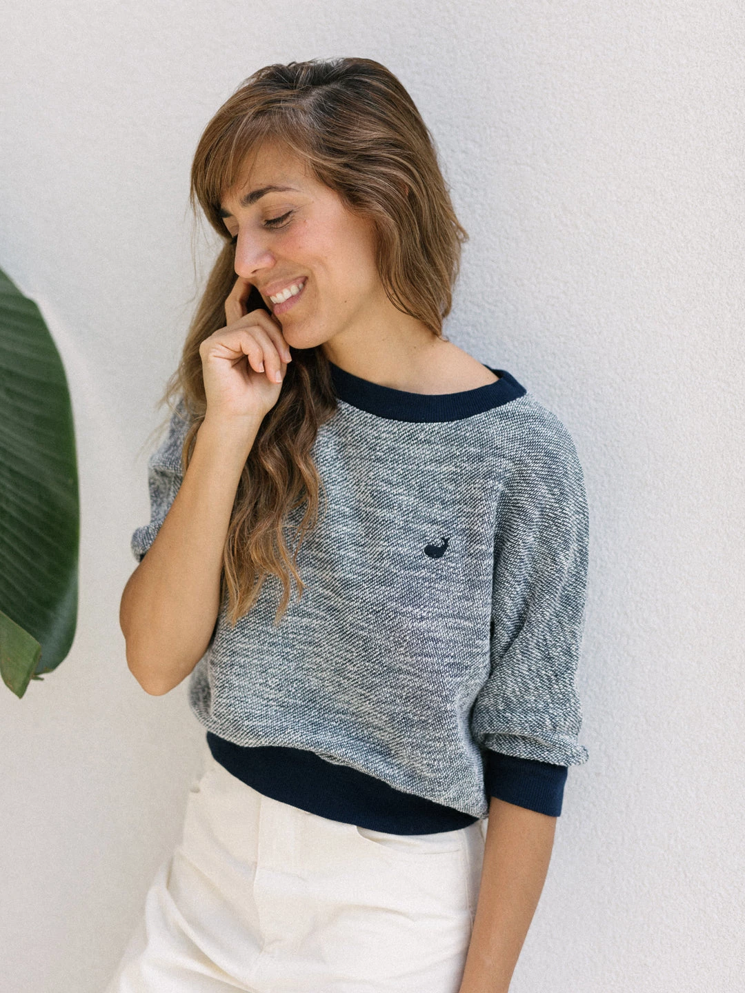 We love our Faial sweatshirt as it reminds us of the ocean! Bold cuffs and a dappled dye offer shades of sea-style. It has an oversized look thanks to its ¾ batwing sleeves, which also sets this sweat apart from others. Also featuring our iconic whale embroidery.