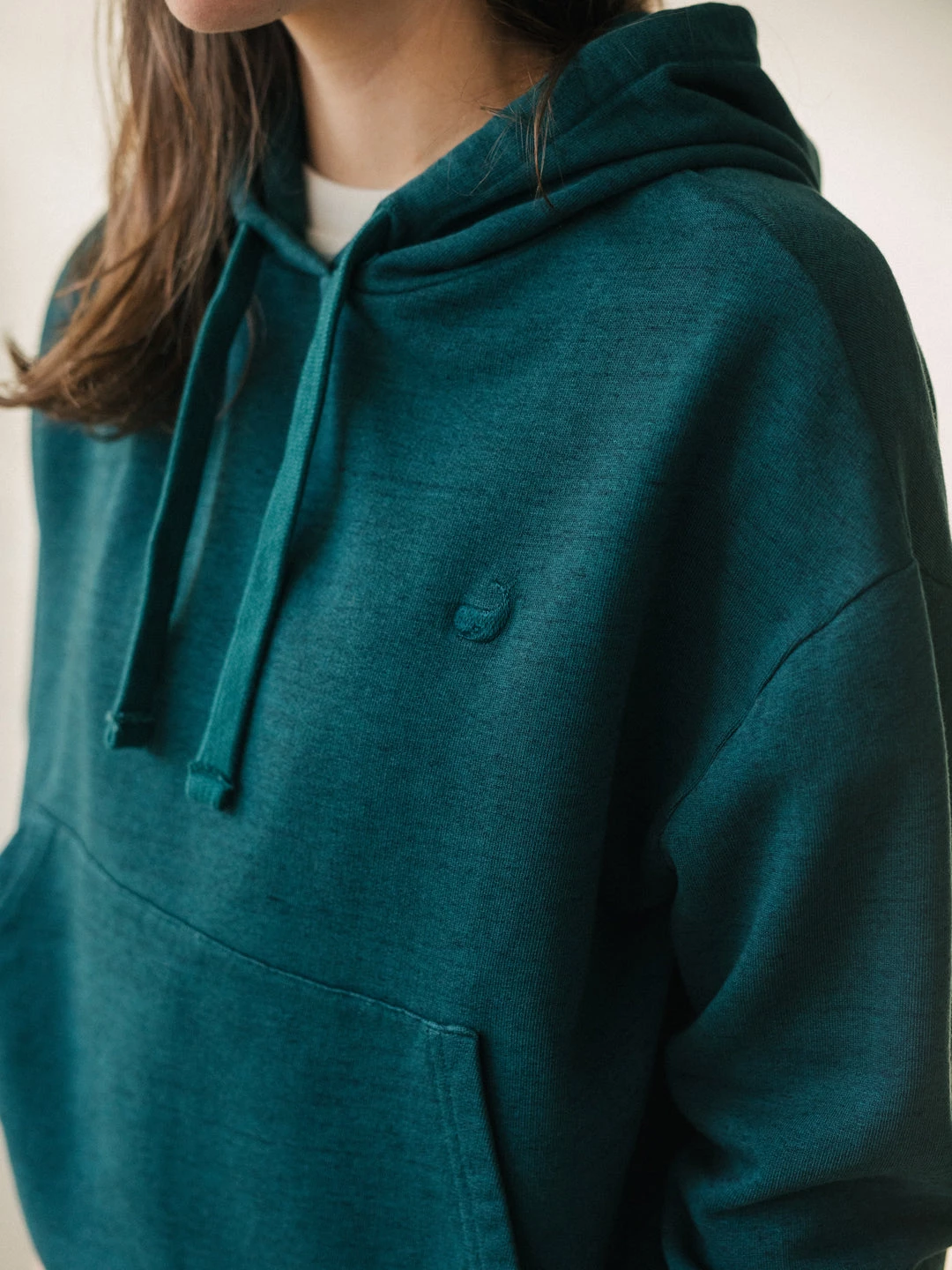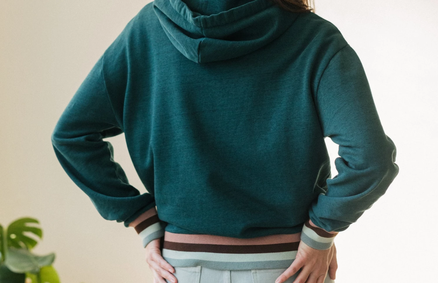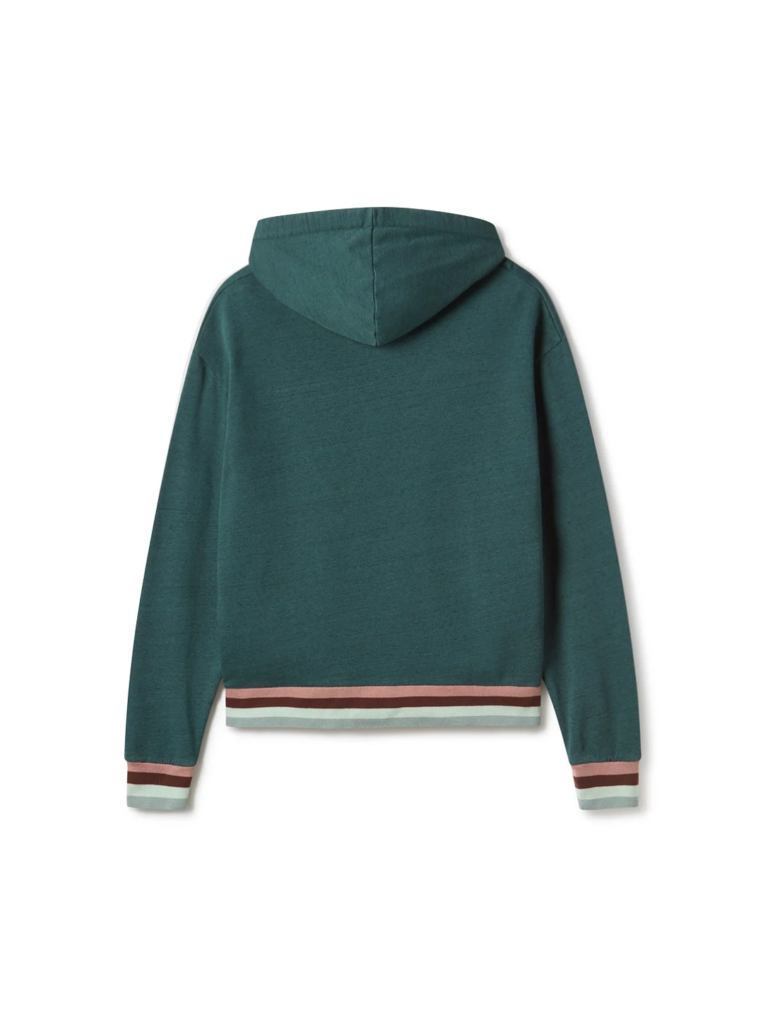 A soft green sweatshirt with retro vibes, the Linosa. Crafted in a simple design and featuring a multi-coloured ribbed base. It comes with a cosy hood, kangaroo pocket and iconic whale embroidery. The Linosa follows a regular fit and hip-length cut.