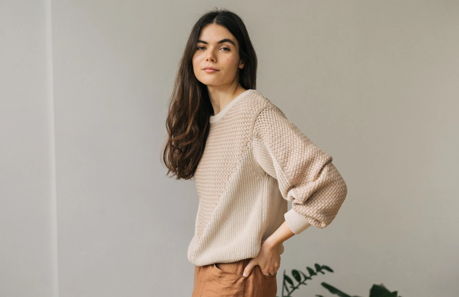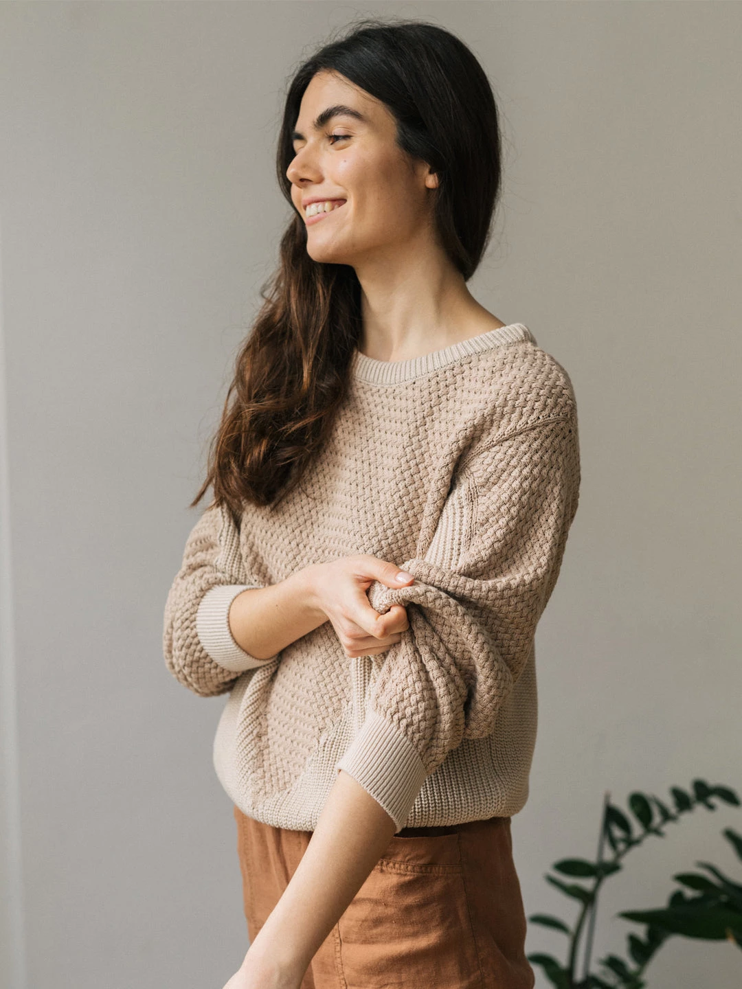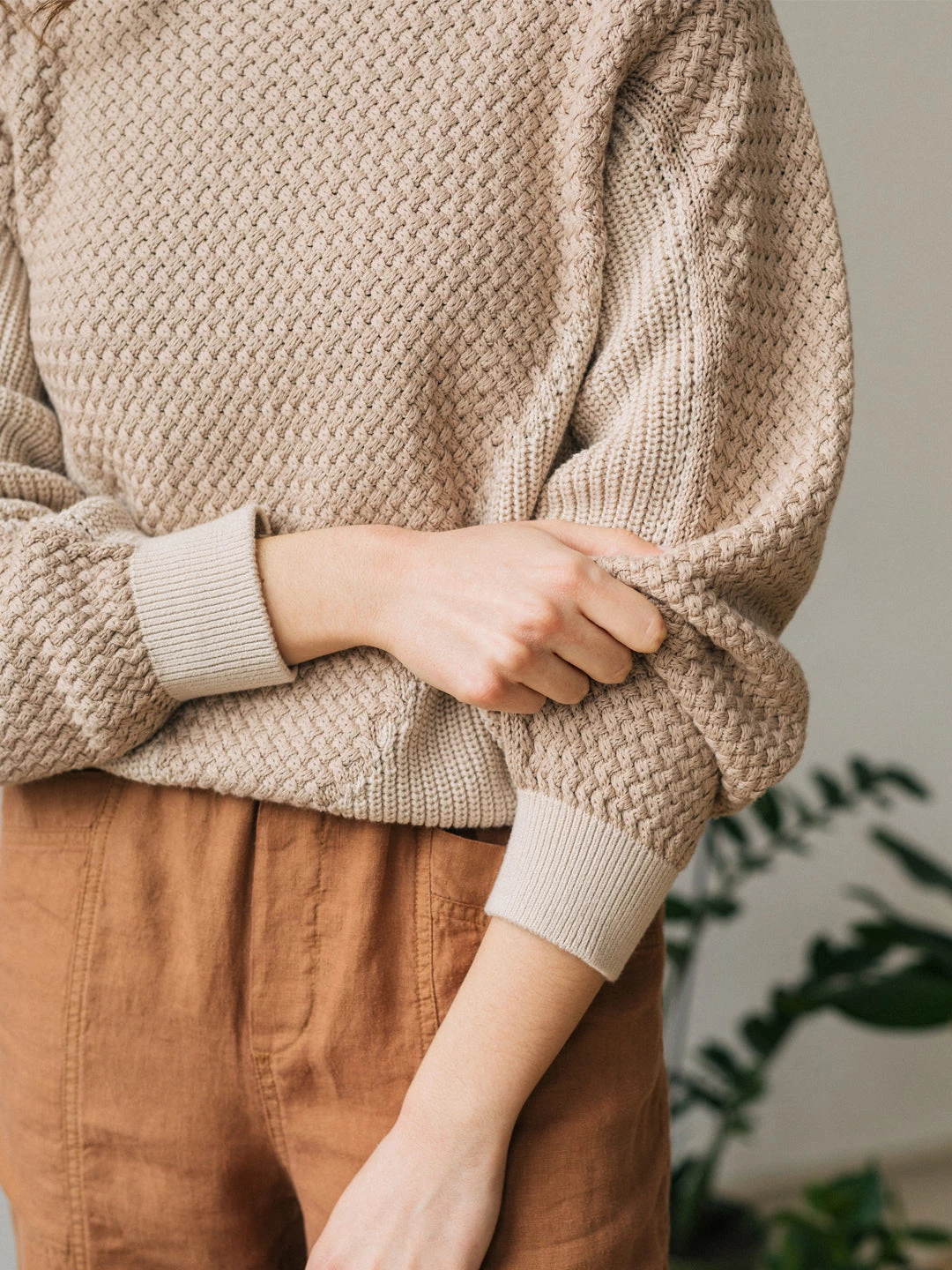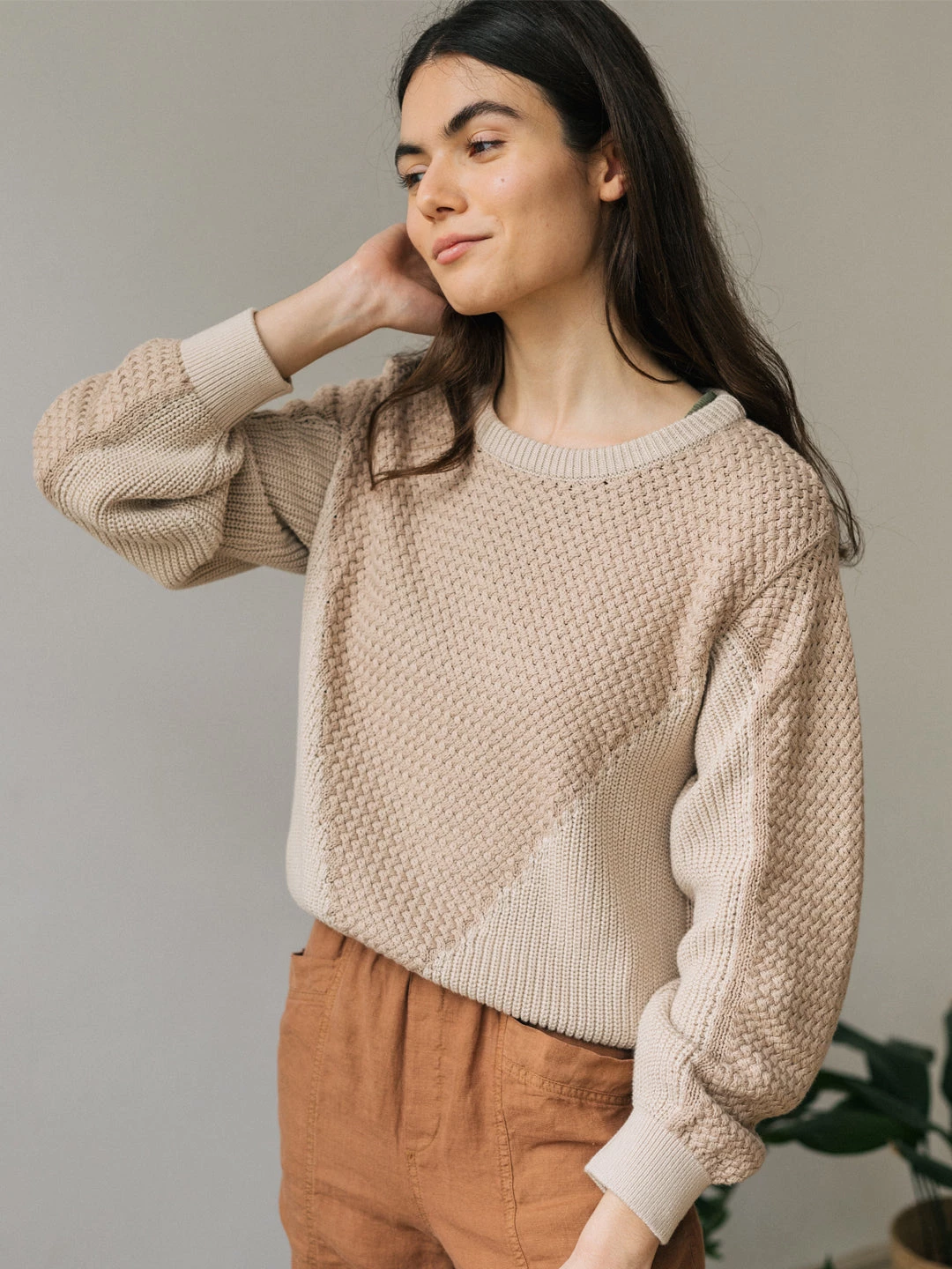 A beautifully woven knit with a criss-cross effect: meet the Marshall. It’s a soft garment with a triangular geometric design, dropped shoulders and a ribbed pesticide free fabric. It comes in a fairly loose fit and hip-length cut.Â