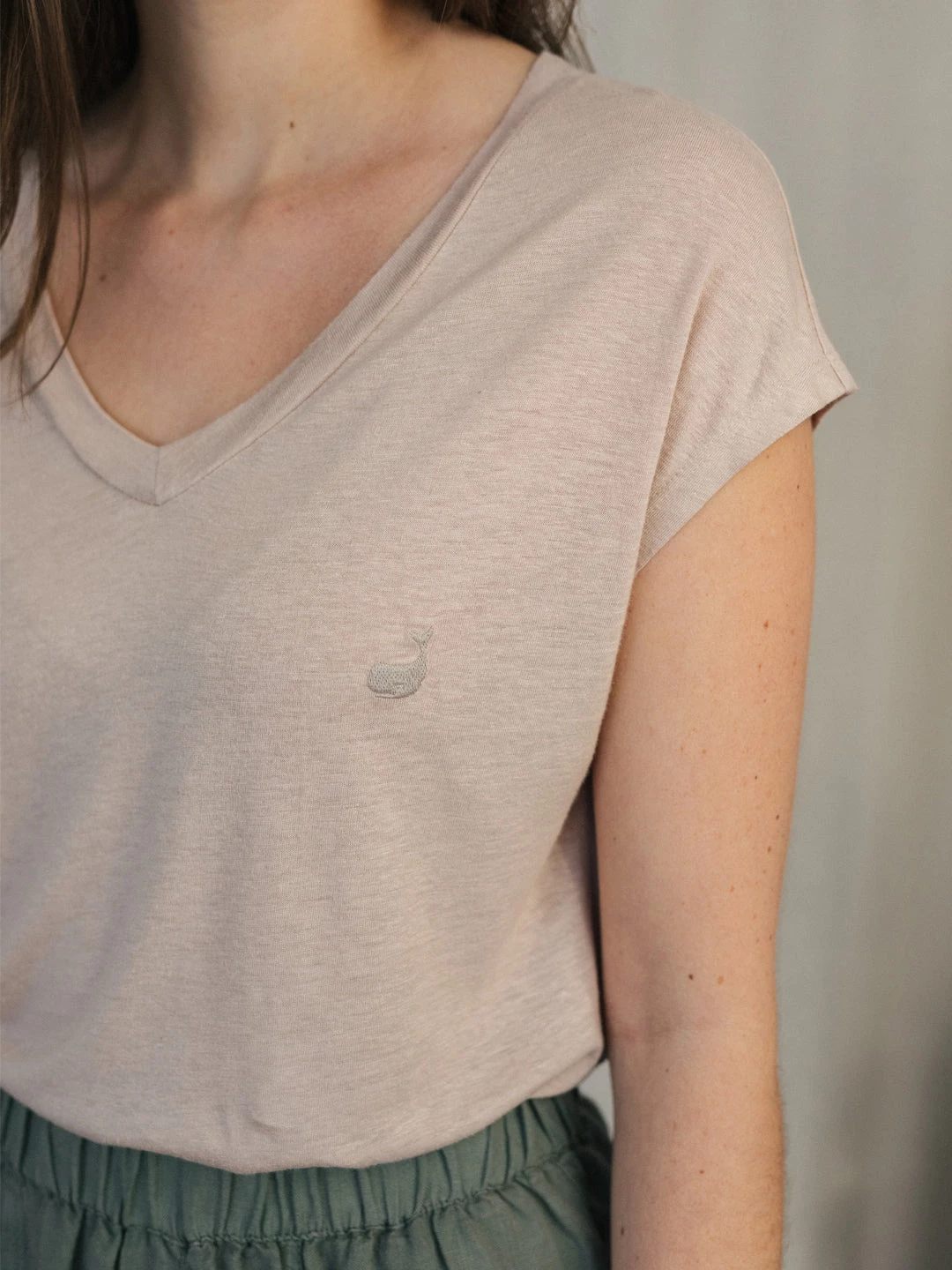 The Nomuka top is made sustainably to feel soft on your skin. It’s designed with a breathable eco-friendly fabric, v-neckline and short batwing sleeves – featuring our unmissable whale embroidery on the chest. The tee comes in a fairly loose fit and hip-length cut.Â