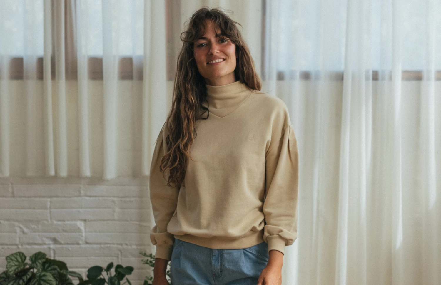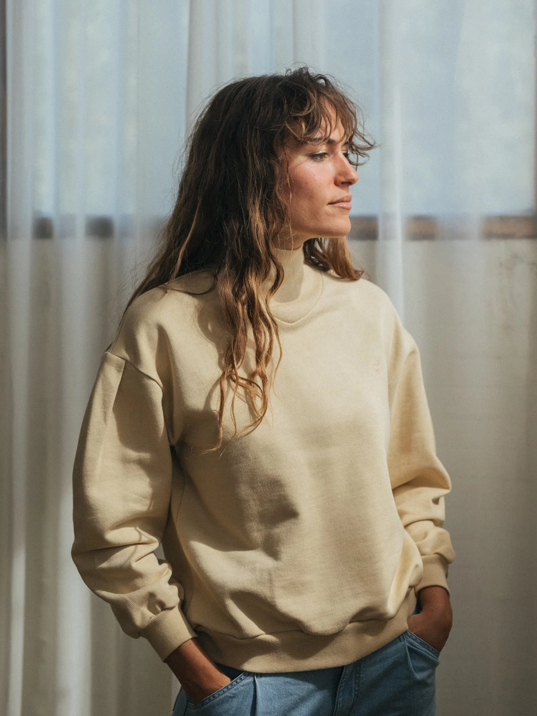 Easy to match and very versatile. The colour of this sweatshirt makes it great when creating a smooth and blended outfit. It looks wonderful with black trousers, as well as with your favourite denim jeans or one of our sustainable skirts.Â