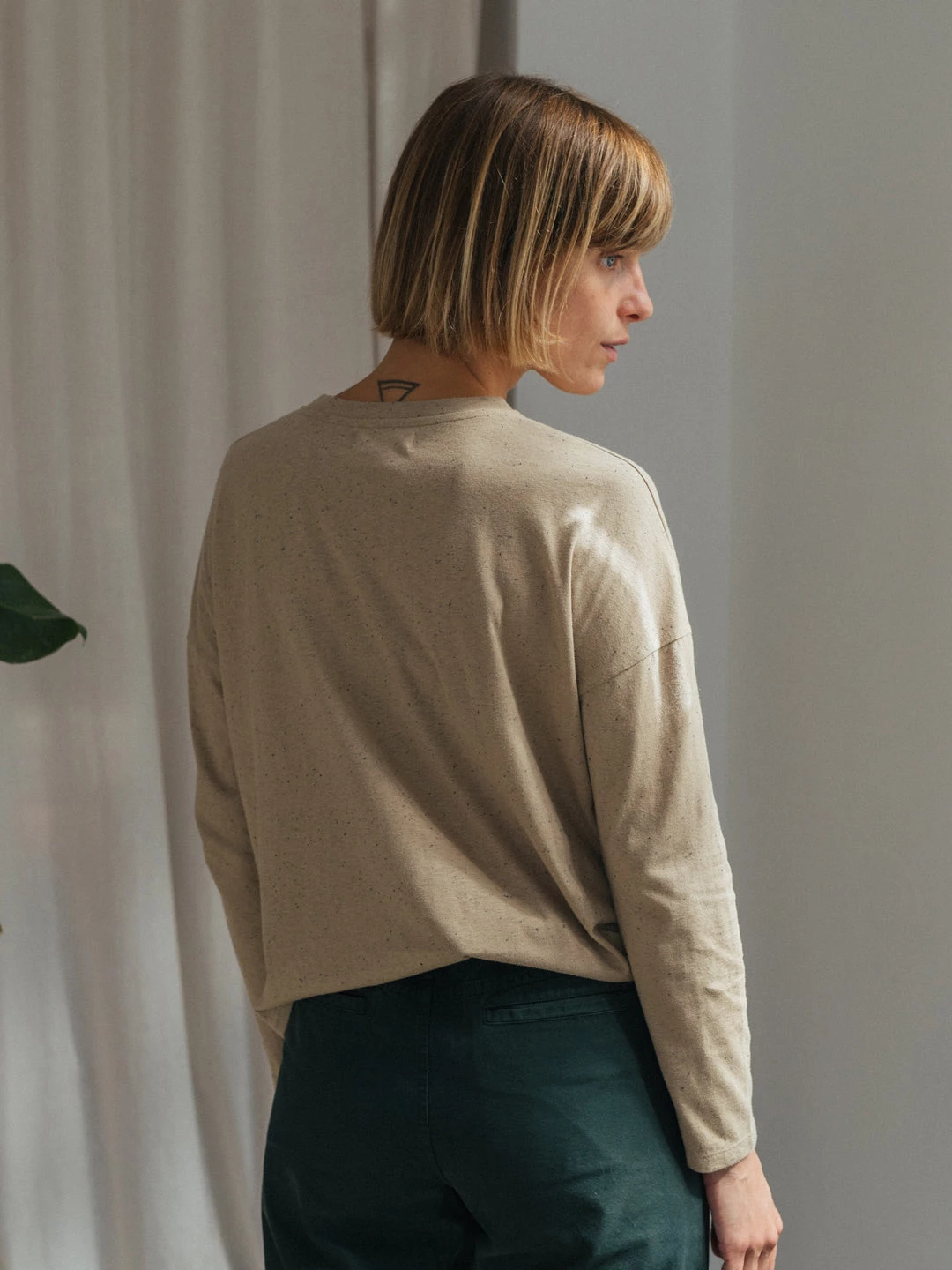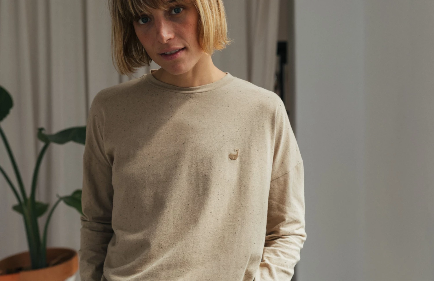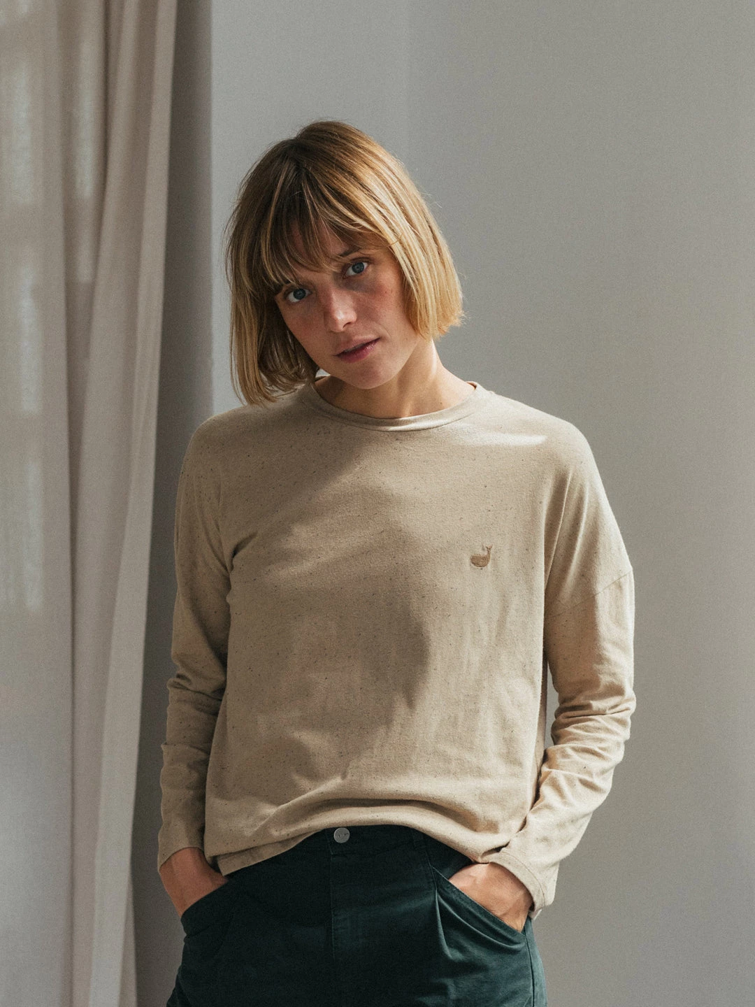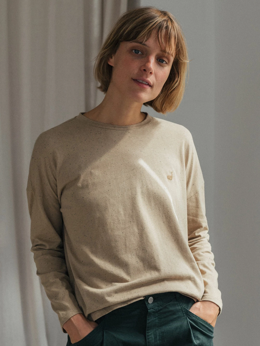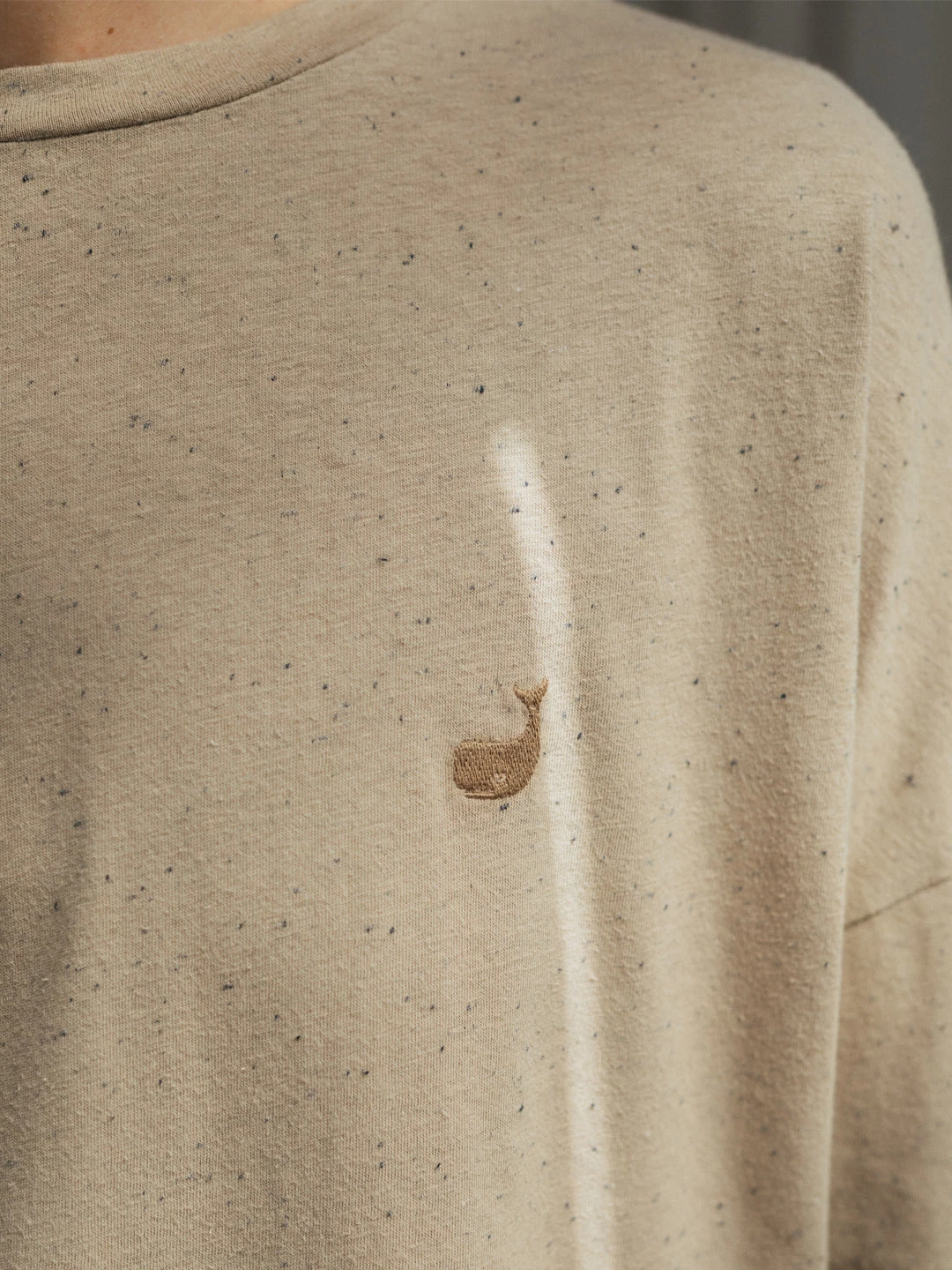 The Santa Cruz tee: boxy fit, super comfortable and soft to the touch. Designed with dropped shoulders and raw edges to complete the comfy style. Featuring whale embroidery on the chest and beautiful neps all over the top.Â