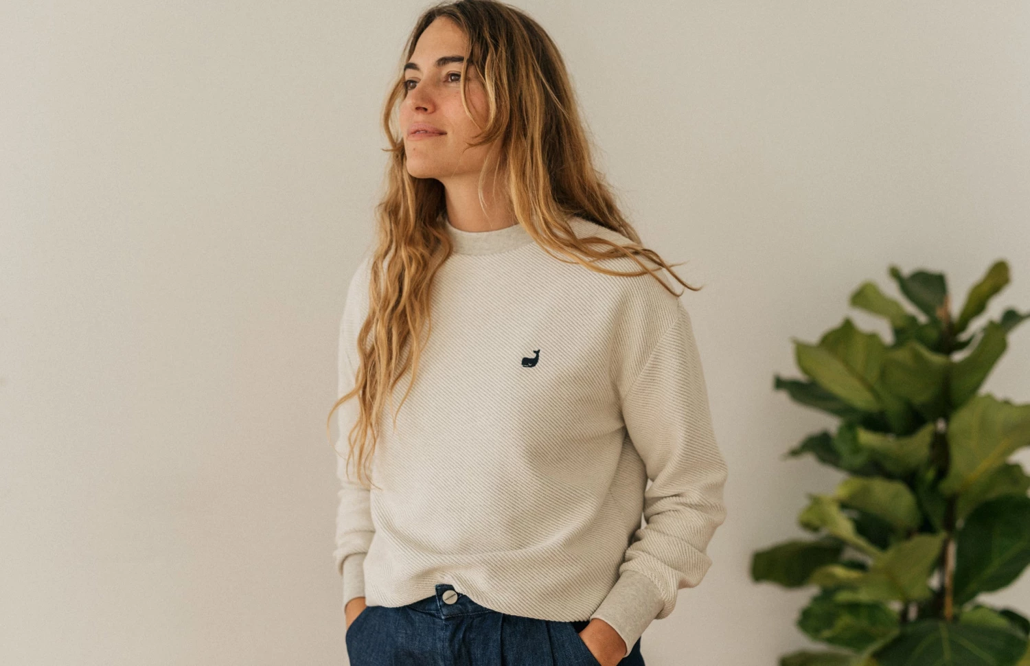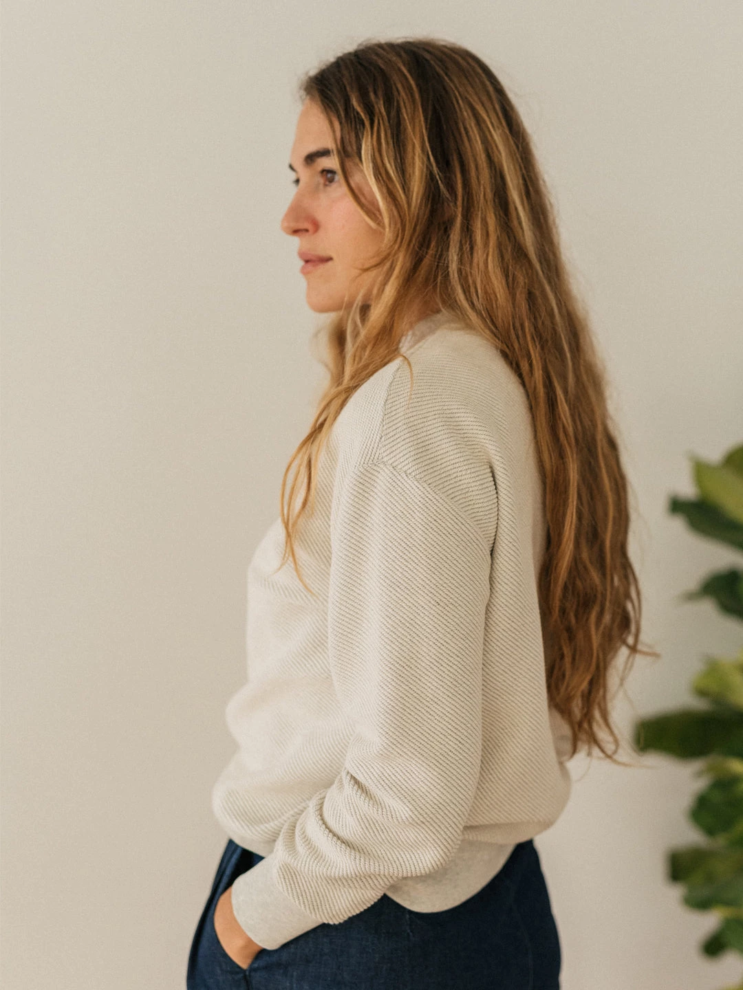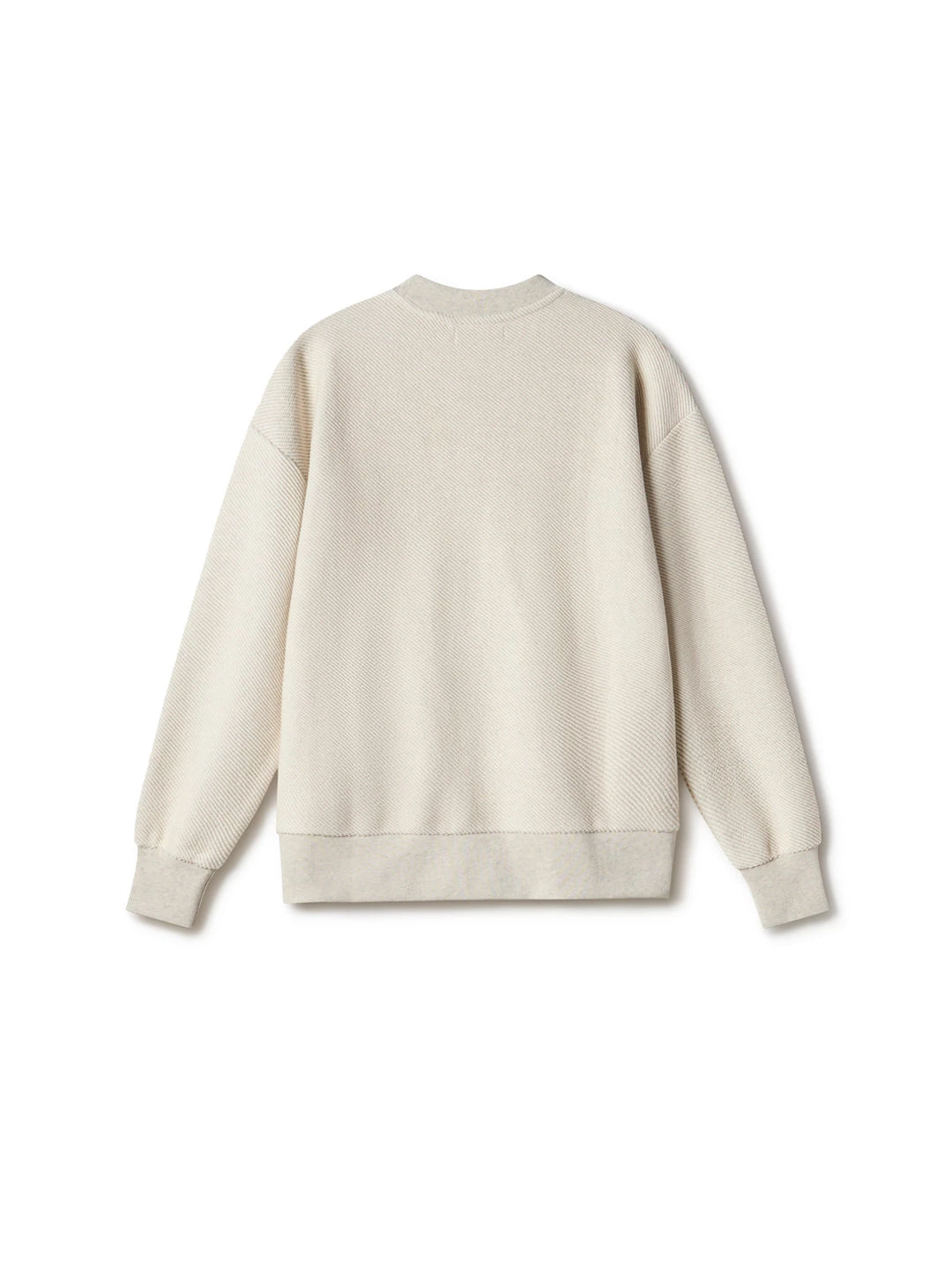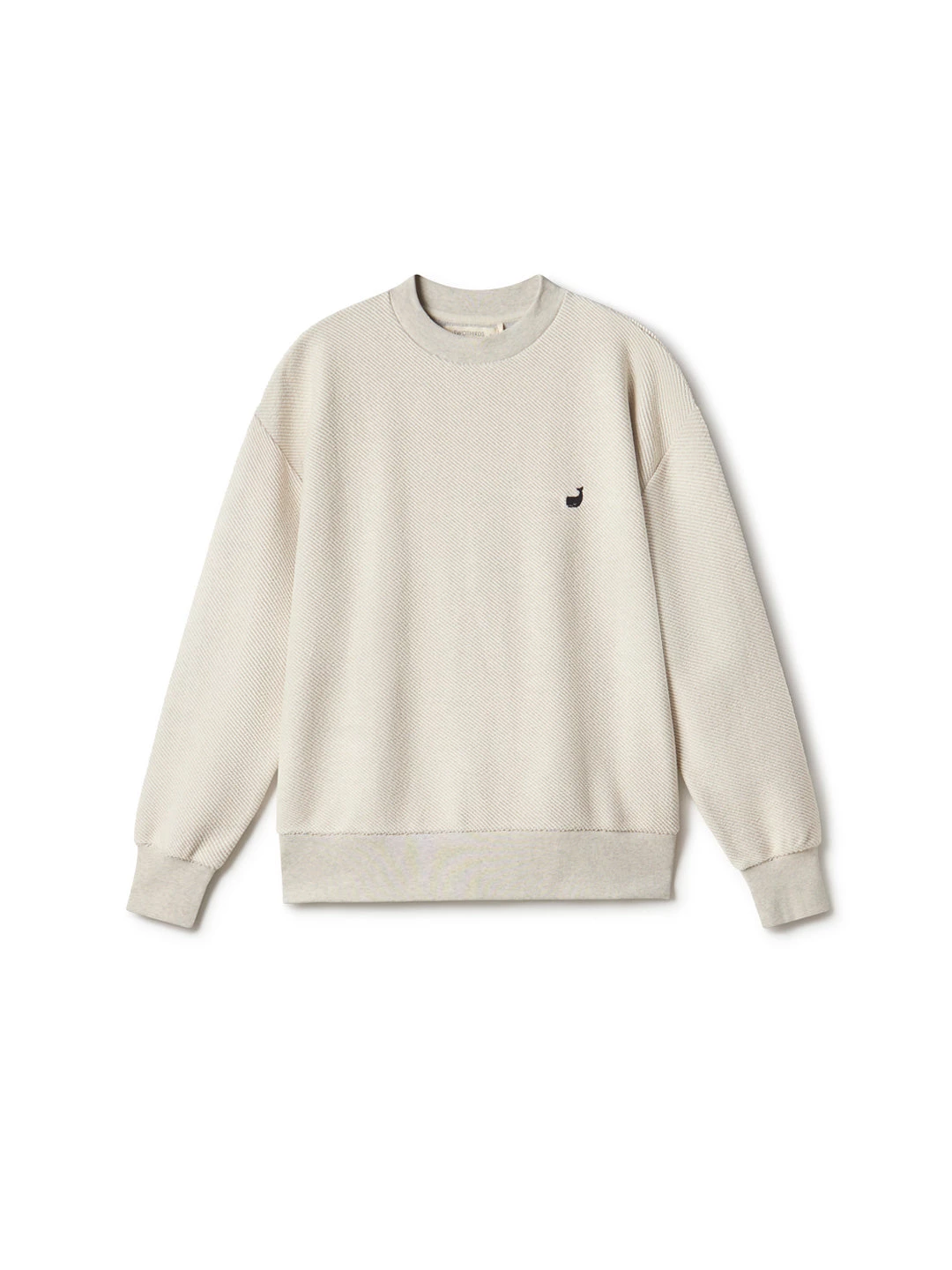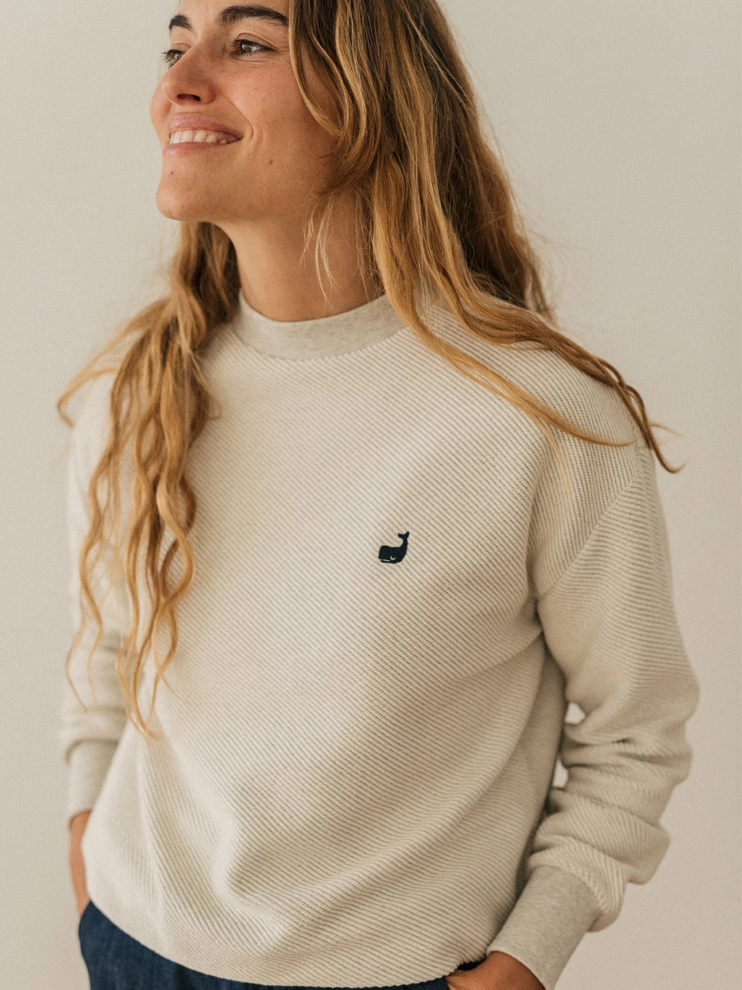 A beautifully soft jumper in a plain neutral colour, here’s the Sula sweatshirt. Designed in a fleece fabric with diagonal pattern, dropped shoulders and whale embroidery on the chest. It comes in a fairly loose fit and hip-length cut.