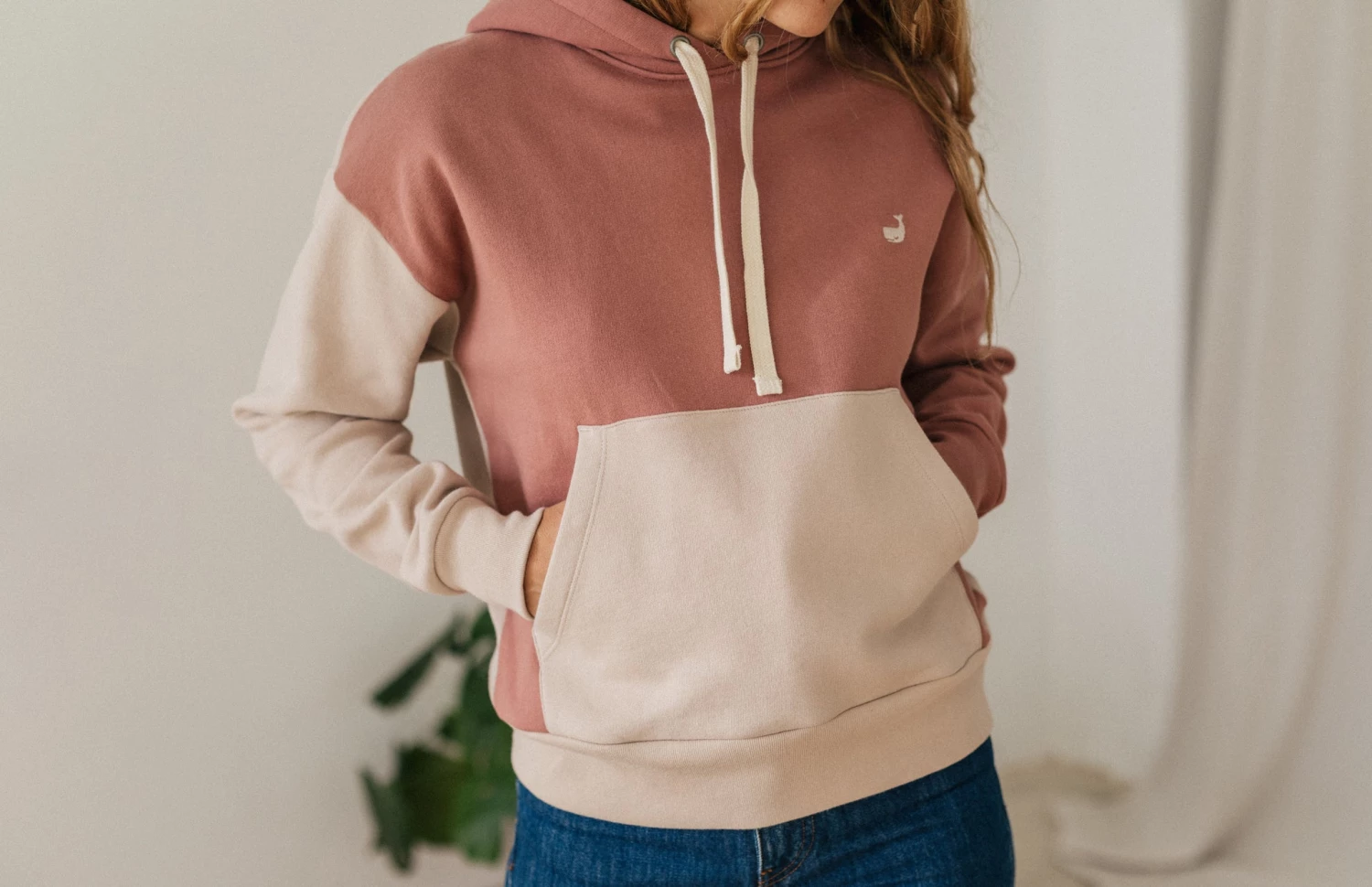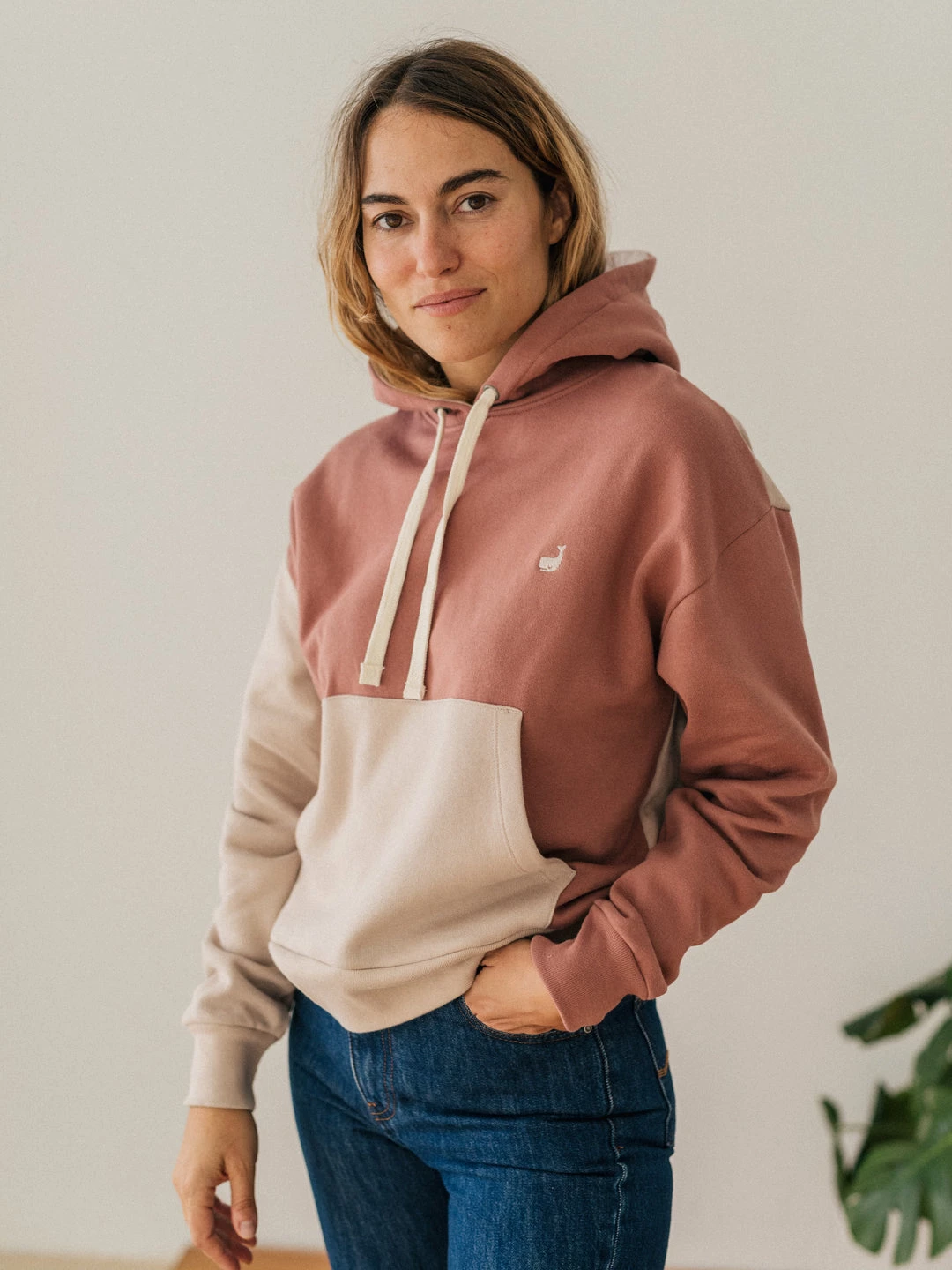 We combined darker and lighter matching tones to create this beautiful hoodie, with distinctive sleeve styling, featuring whale embroidery on the chest and a kangaroo pocket. It comes in a regular fit and hip-length cut.
