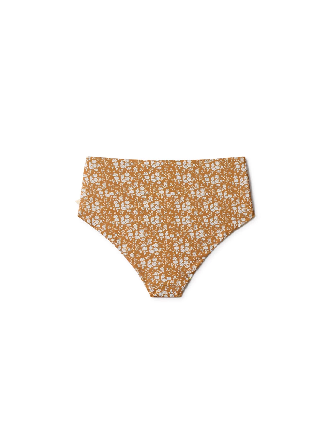 Delicate white flowers on an orange base, the Mavor bikini bottom. Designed with a wide elastic waistband that has a fairly high-waisted fit for extra coverage. Also features a small triangular label with our logo.