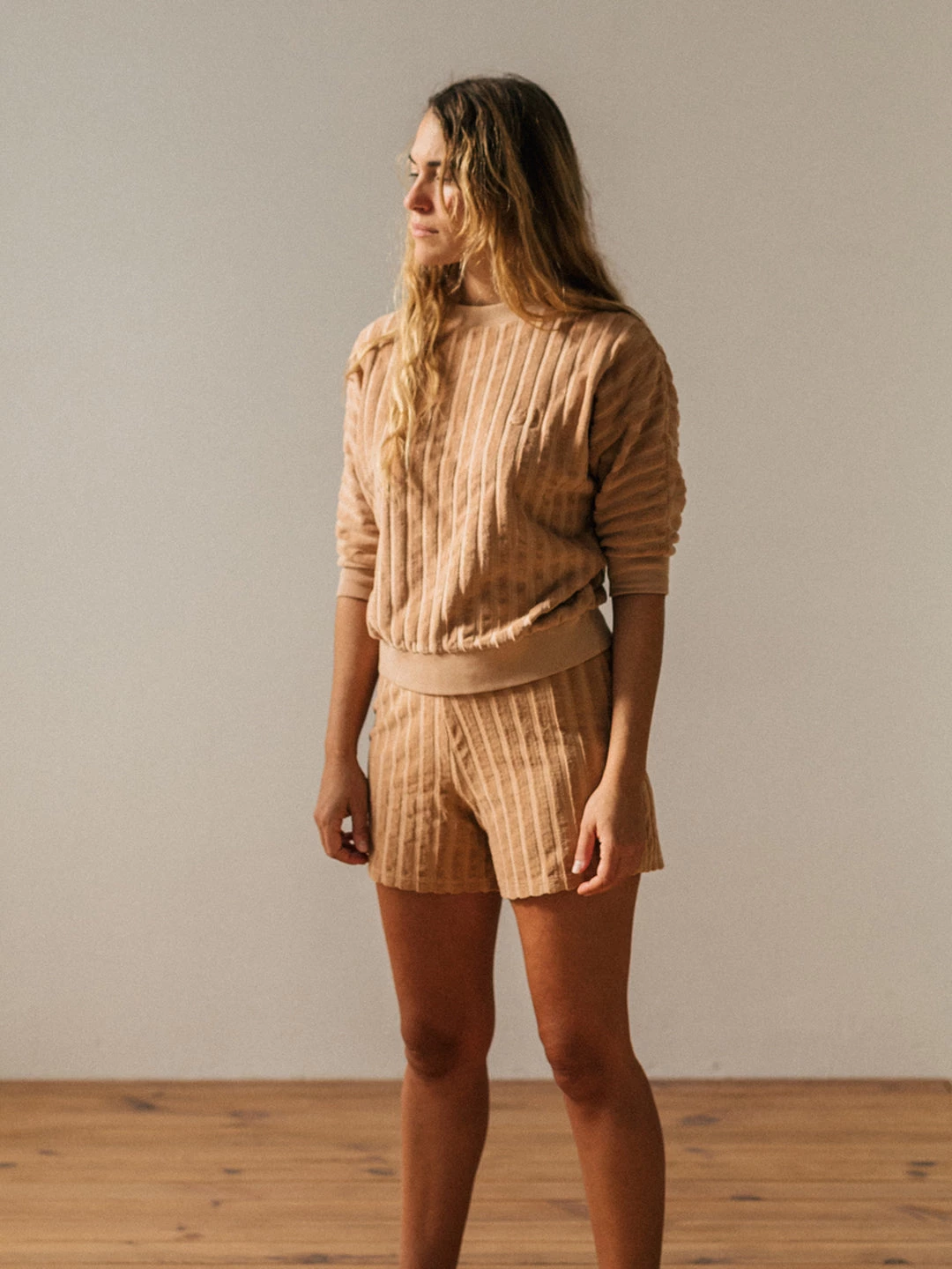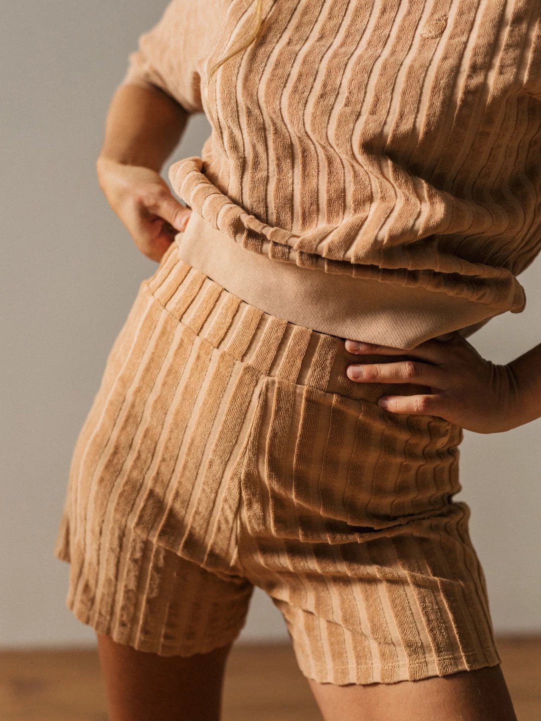 The Tarva shorts feel especially soft. In vertical stripes and an organic velvet fabric in a smooth pastel colour, with an elastic waistband – featuring whale embroidery on the top side. The shorts hang on the waist in a regular fit.