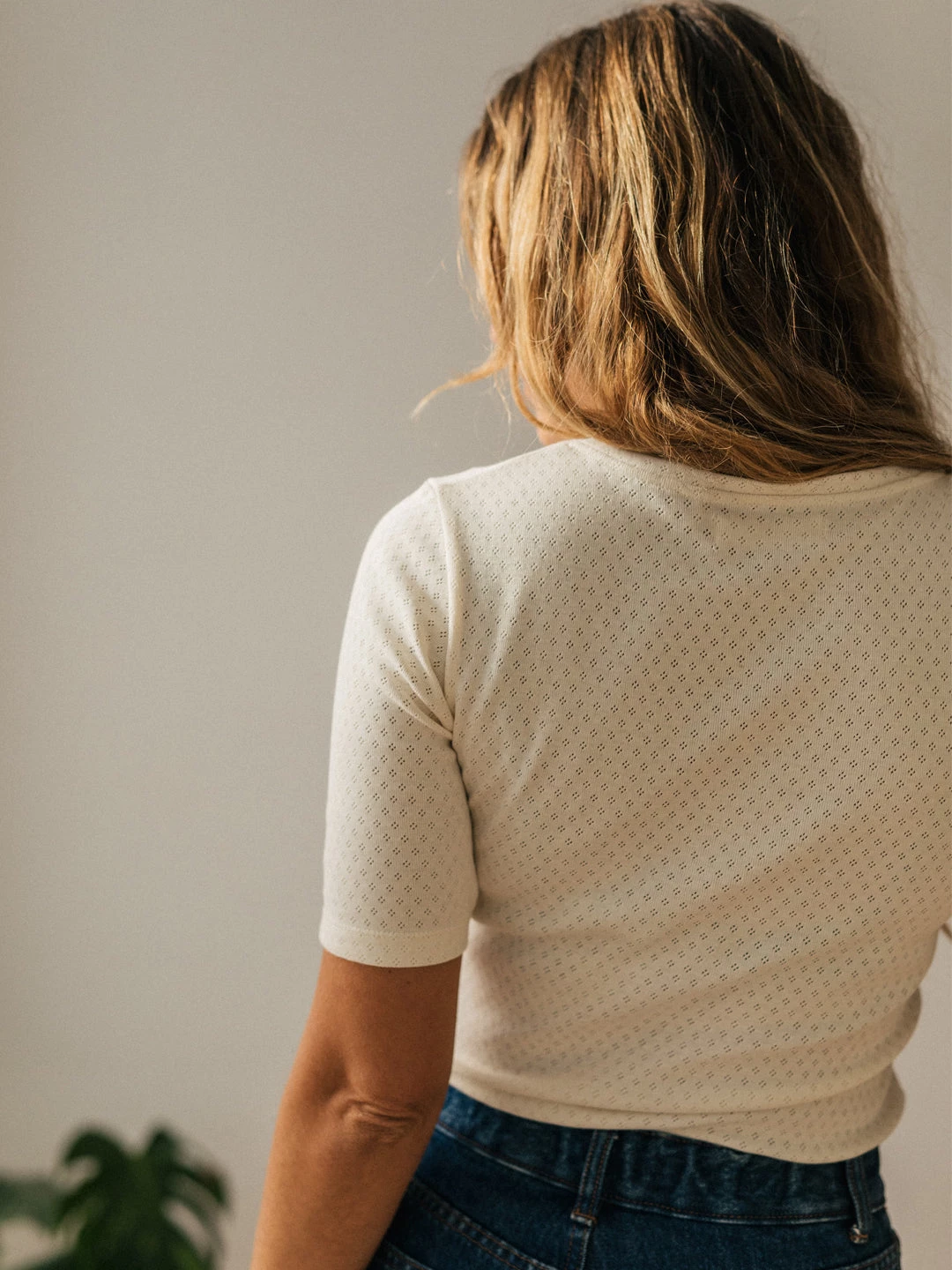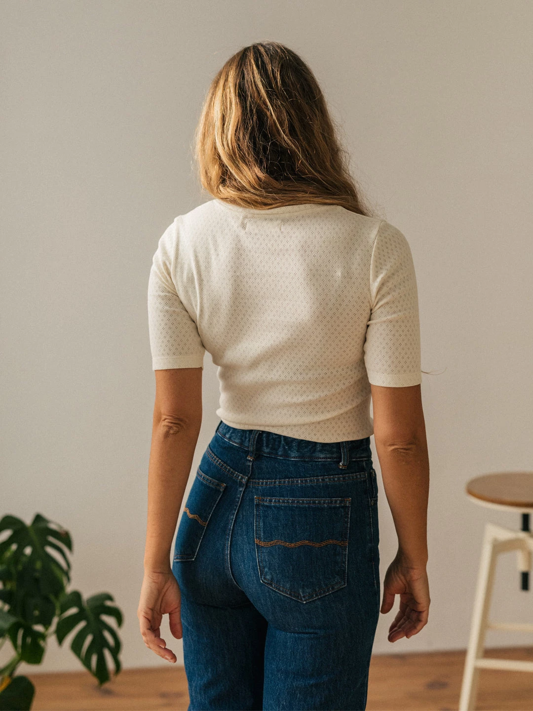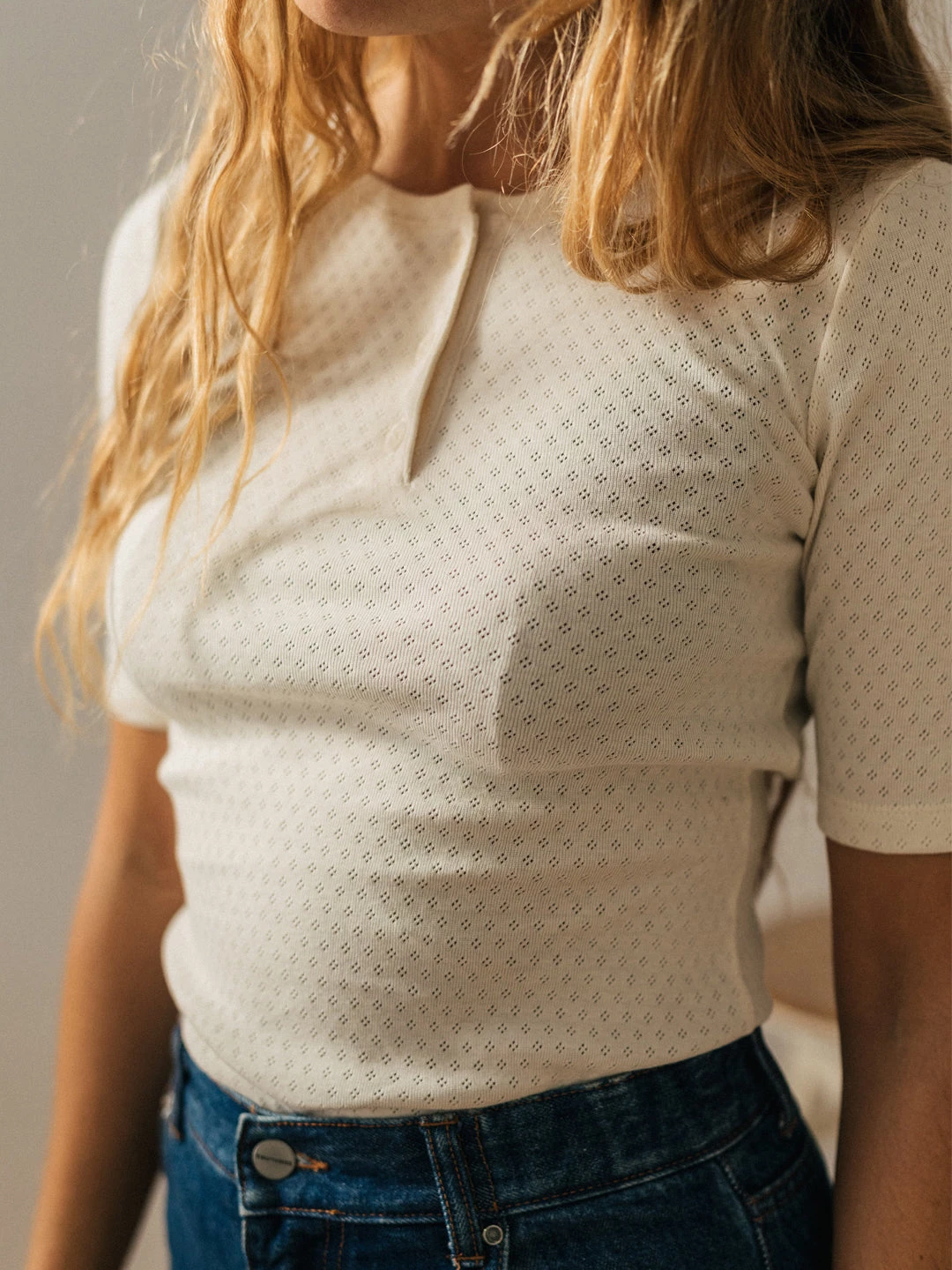 A thin, marvellously soft top with a subtle floral design. The Tautra has a feminine design, with naturally sourced corozo buttons on the neckline. It comes in a fairly slim fit and hip-length cut.