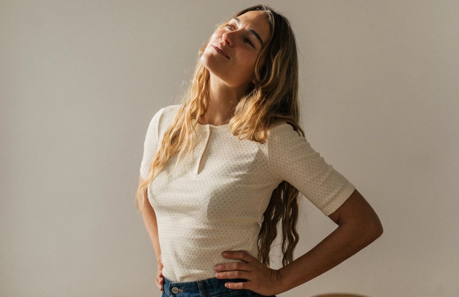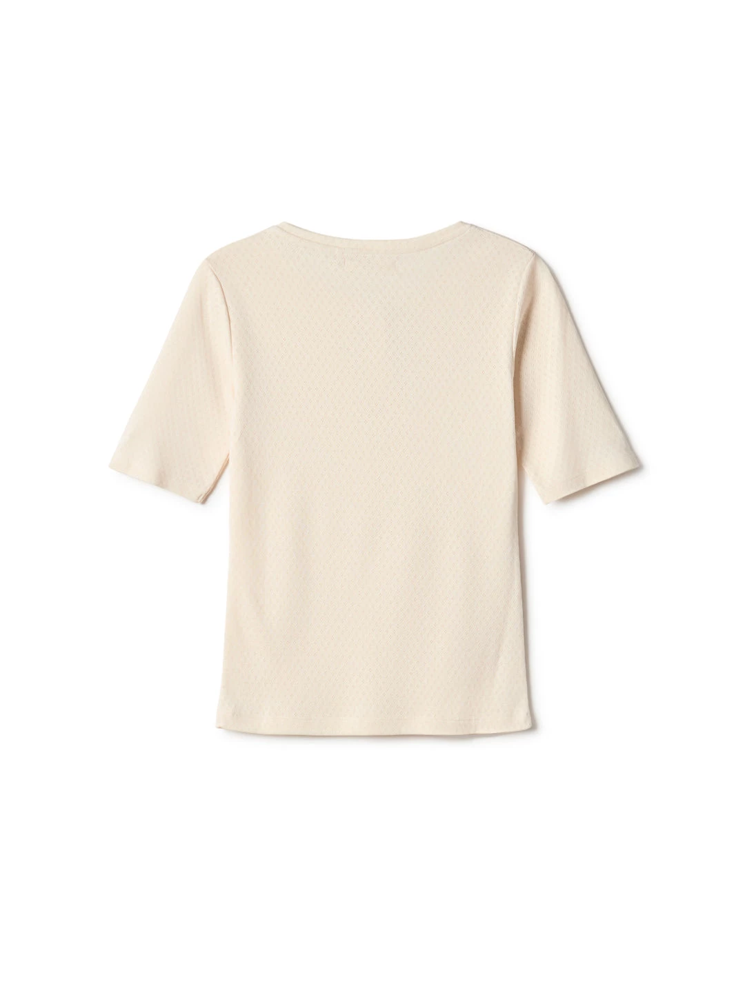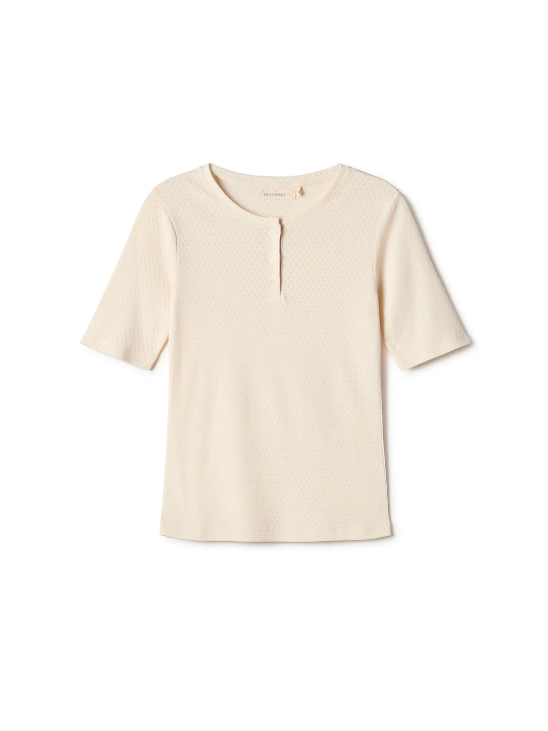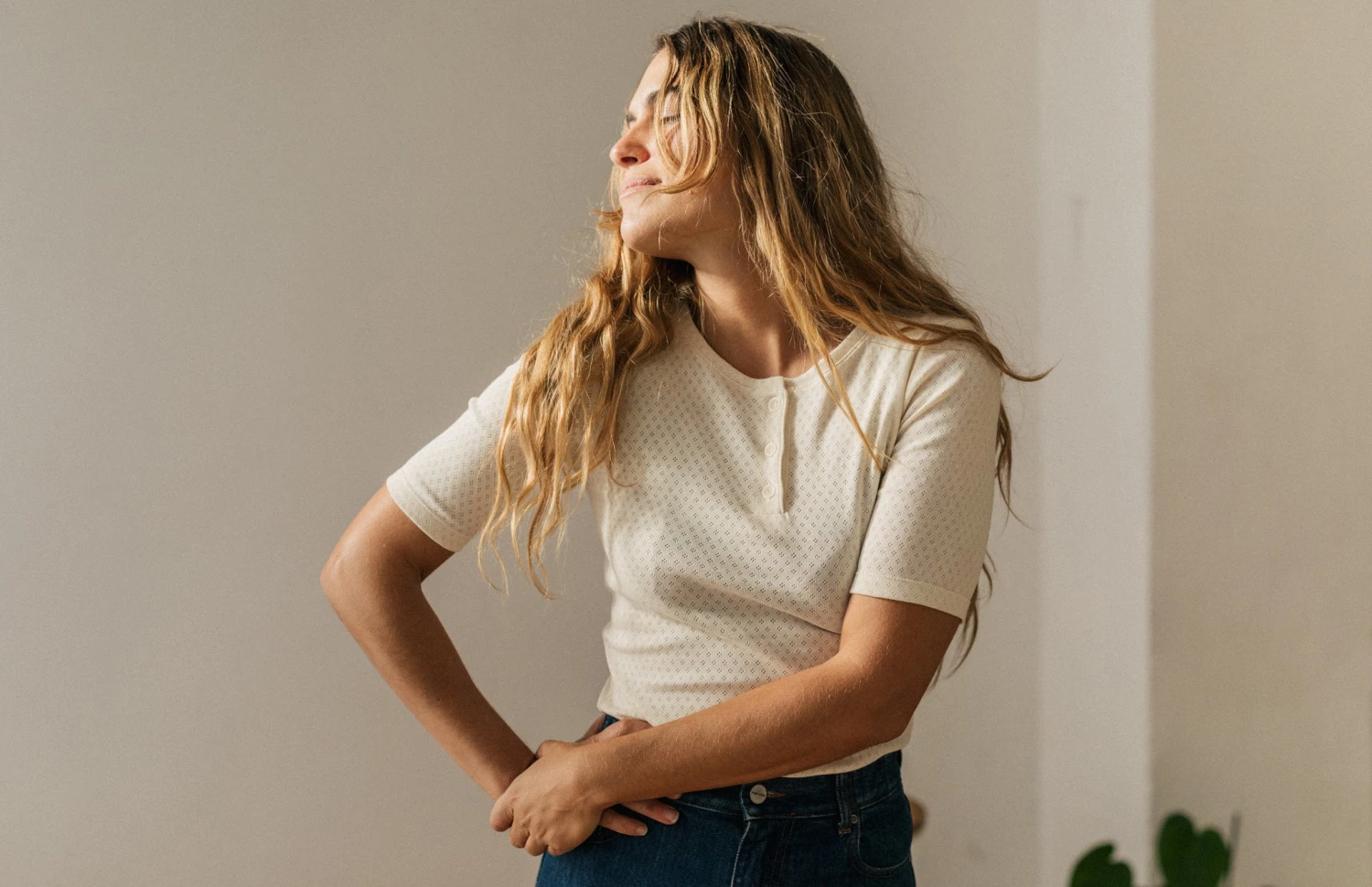A thin, marvellously soft top with a subtle floral design. The Tautra has a feminine design, with naturally sourced corozo buttons on the neckline. It comes in a fairly slim fit and hip-length cut.