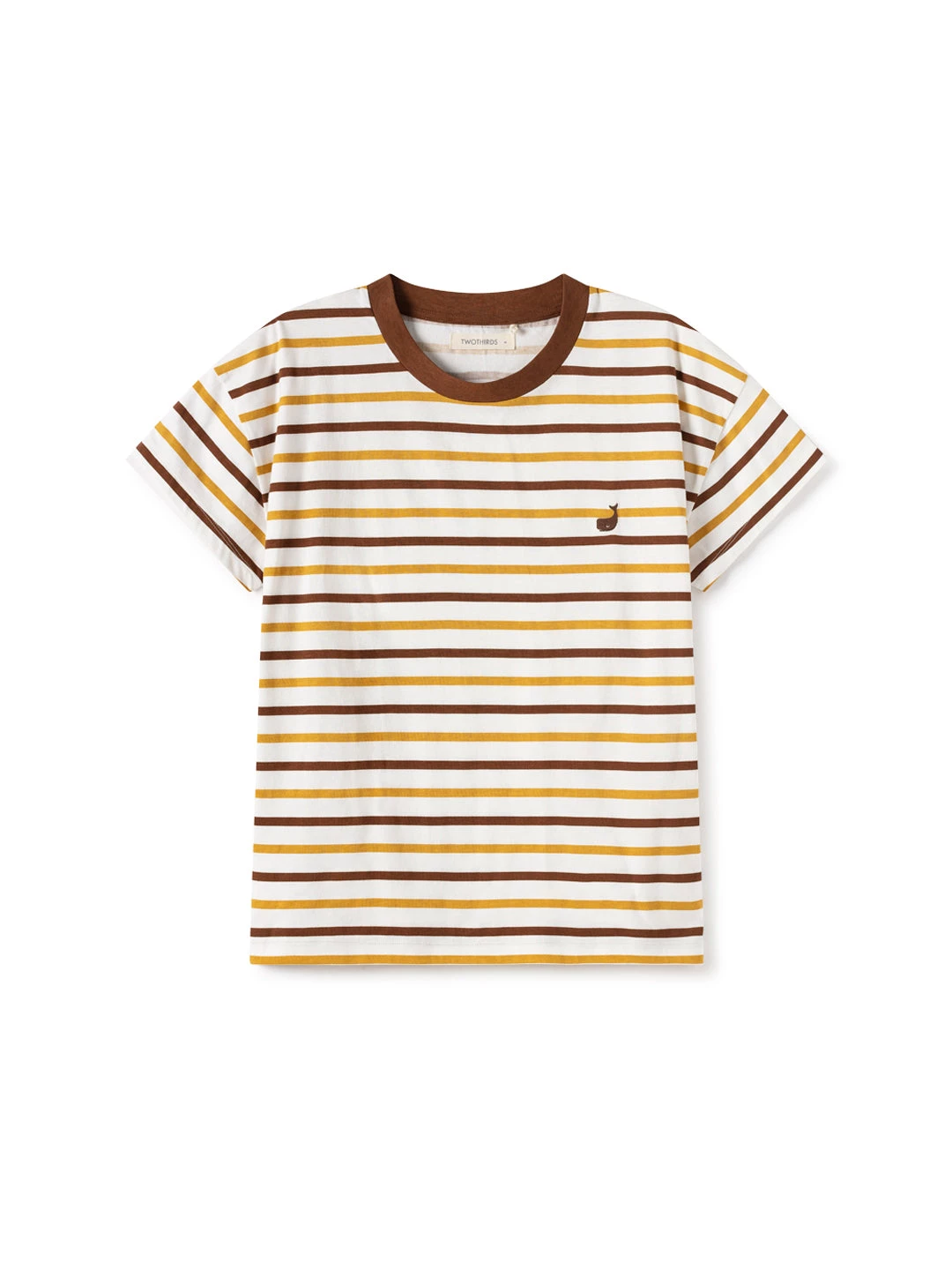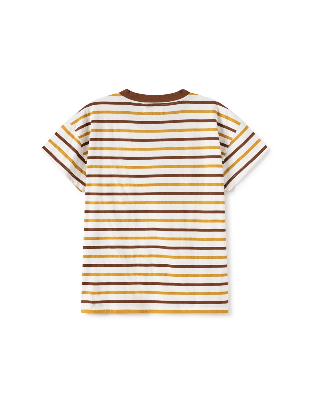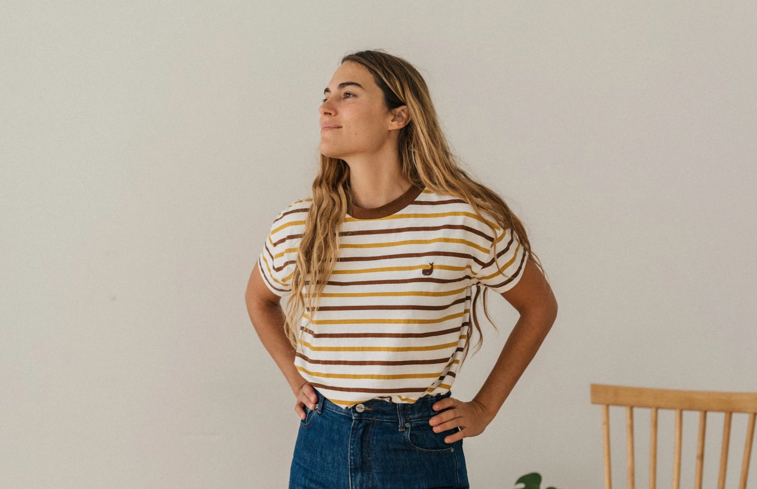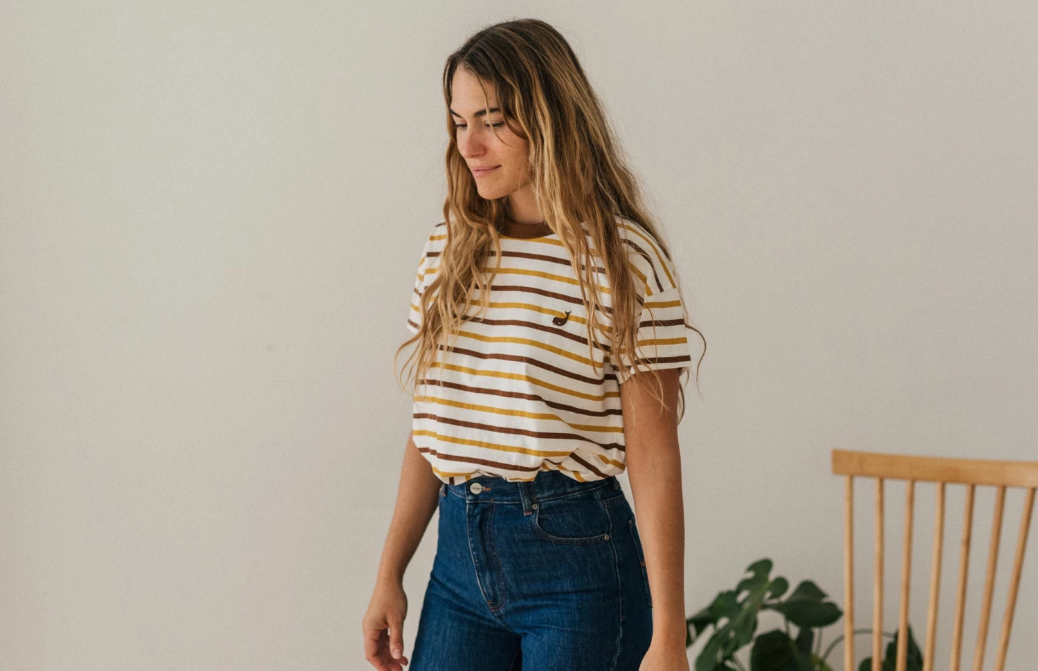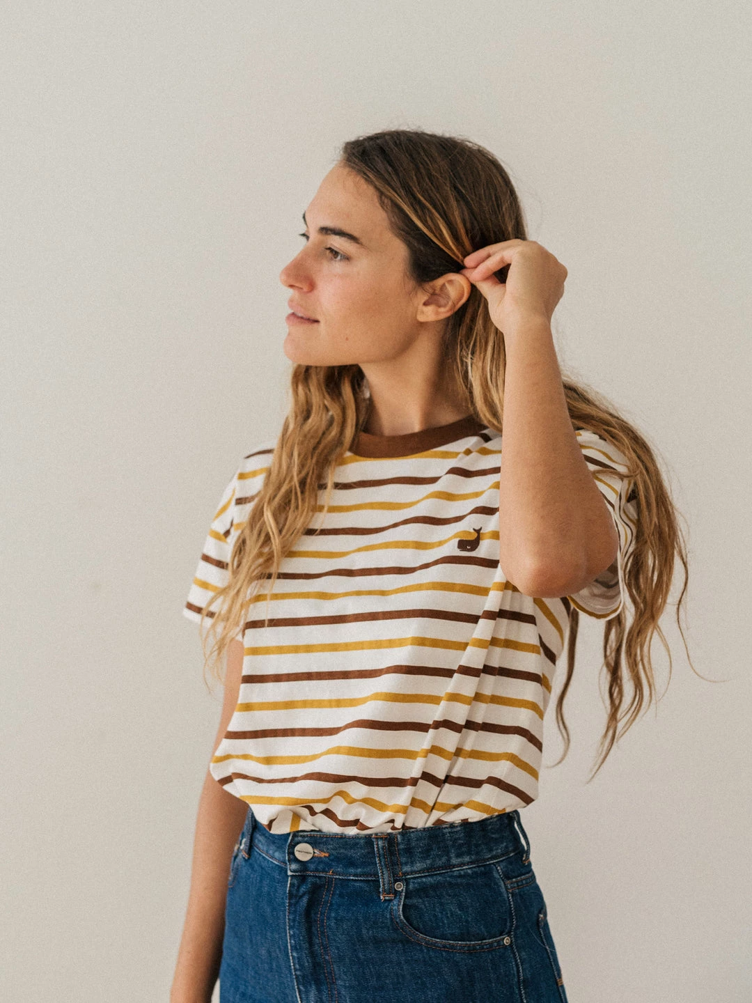 Here’s the Apiao tee, in a beautiful striped design. Earth colours really bring this top to life, while a ribbed neckline and raw edges give it a unique silhouette. The t-shirt is designed with a regular fit and hip-length cut.Â