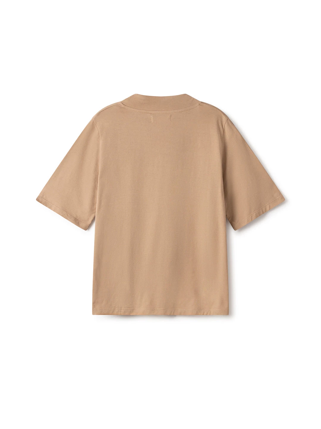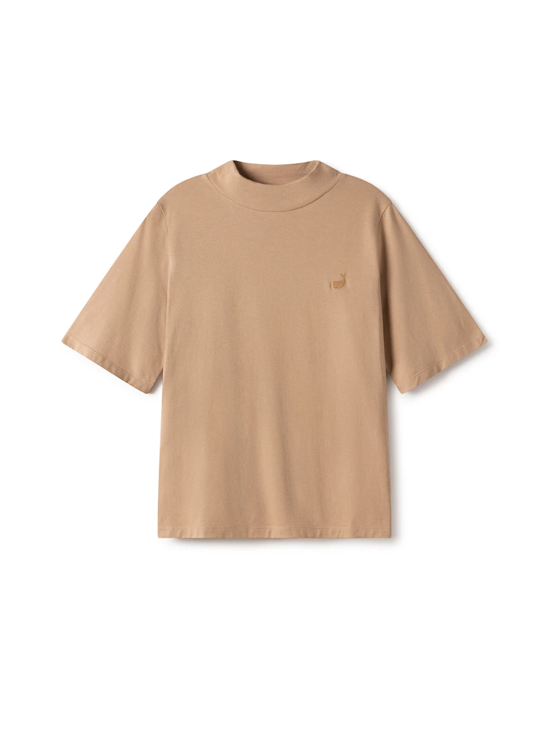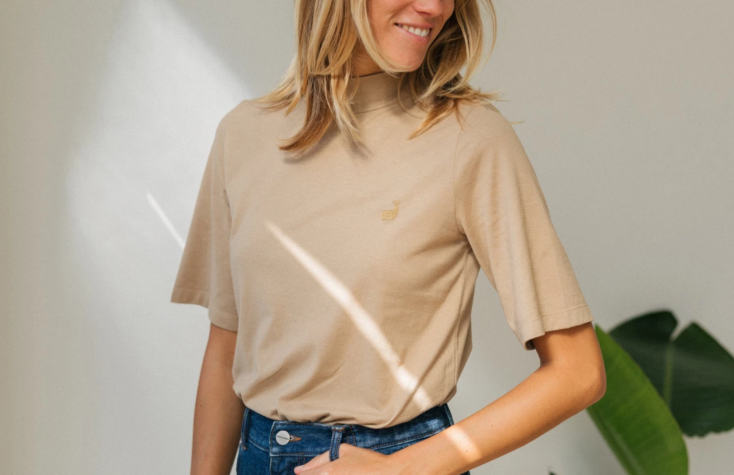 Slow fashion for a sustainable lifestyle, meet the Clare top. The tee is designed with medium length sleeves, a high neckline and whale embroidery on the chest in a matching colour. It comes in a fairly oversized fit and hip-length cut.Â