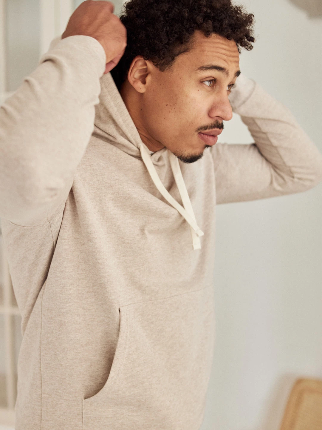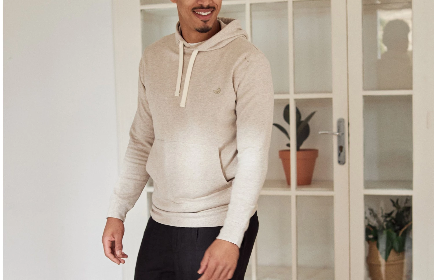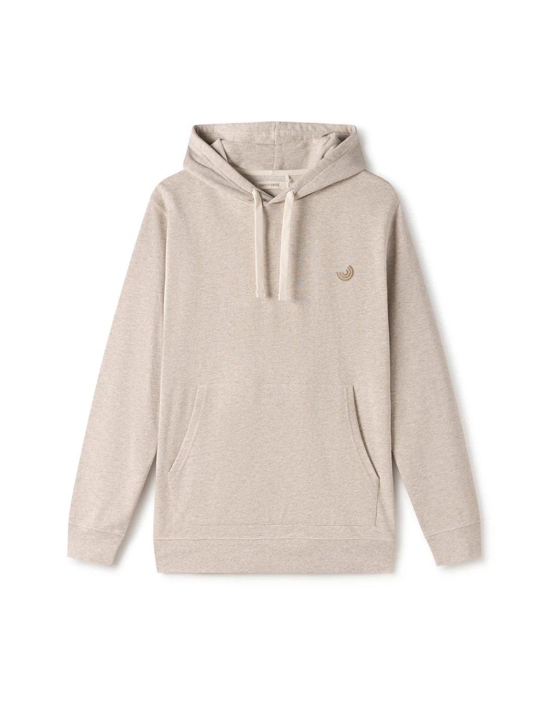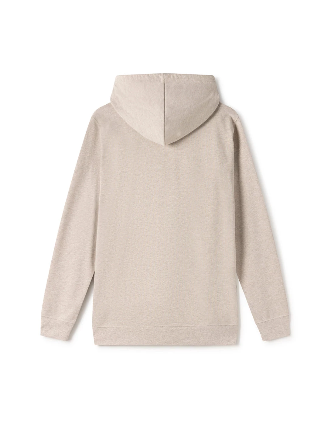 A sustainable hoodie designed in a beautiful, soft linen colour, with a cord to adjust the hood, ribbed edges, a kangaroo pocket and wave embroidery detail on the end of its left sleeve.Â