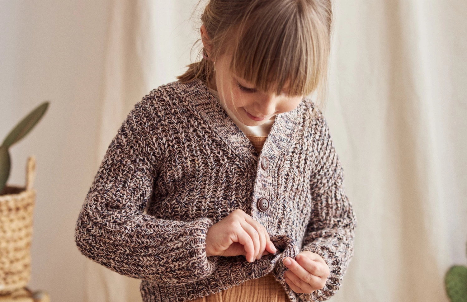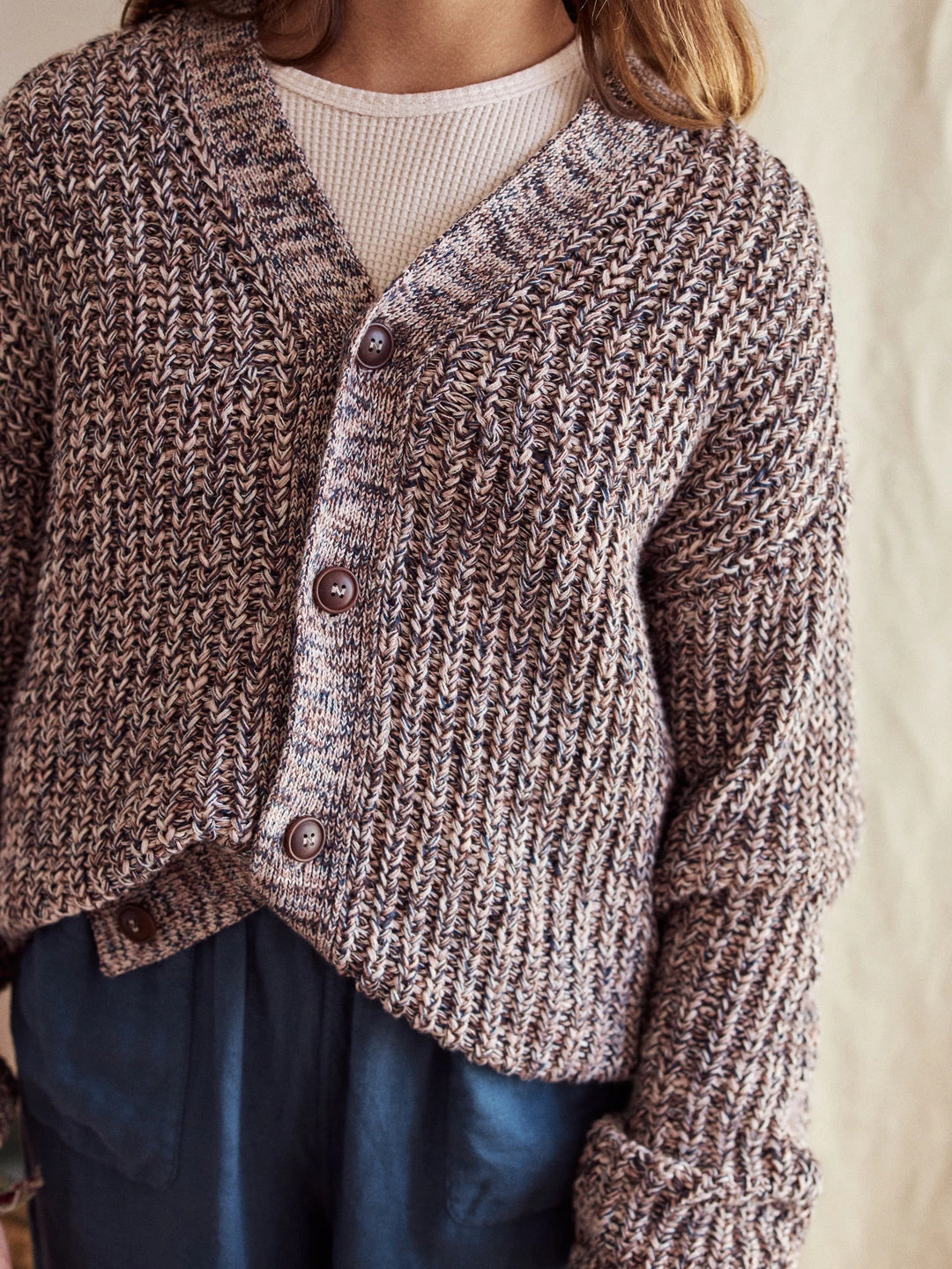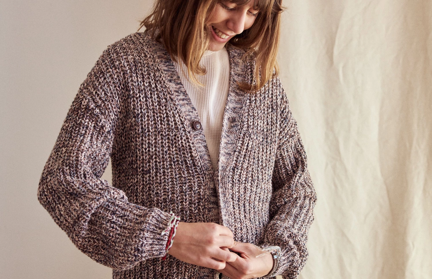 This garment is wonderfully cosy! A beautifully ribbed cardigan, with naturally sourced corozo buttons – it will feel gentle and soft on the skin and comes in a fairly oversized fit.Â