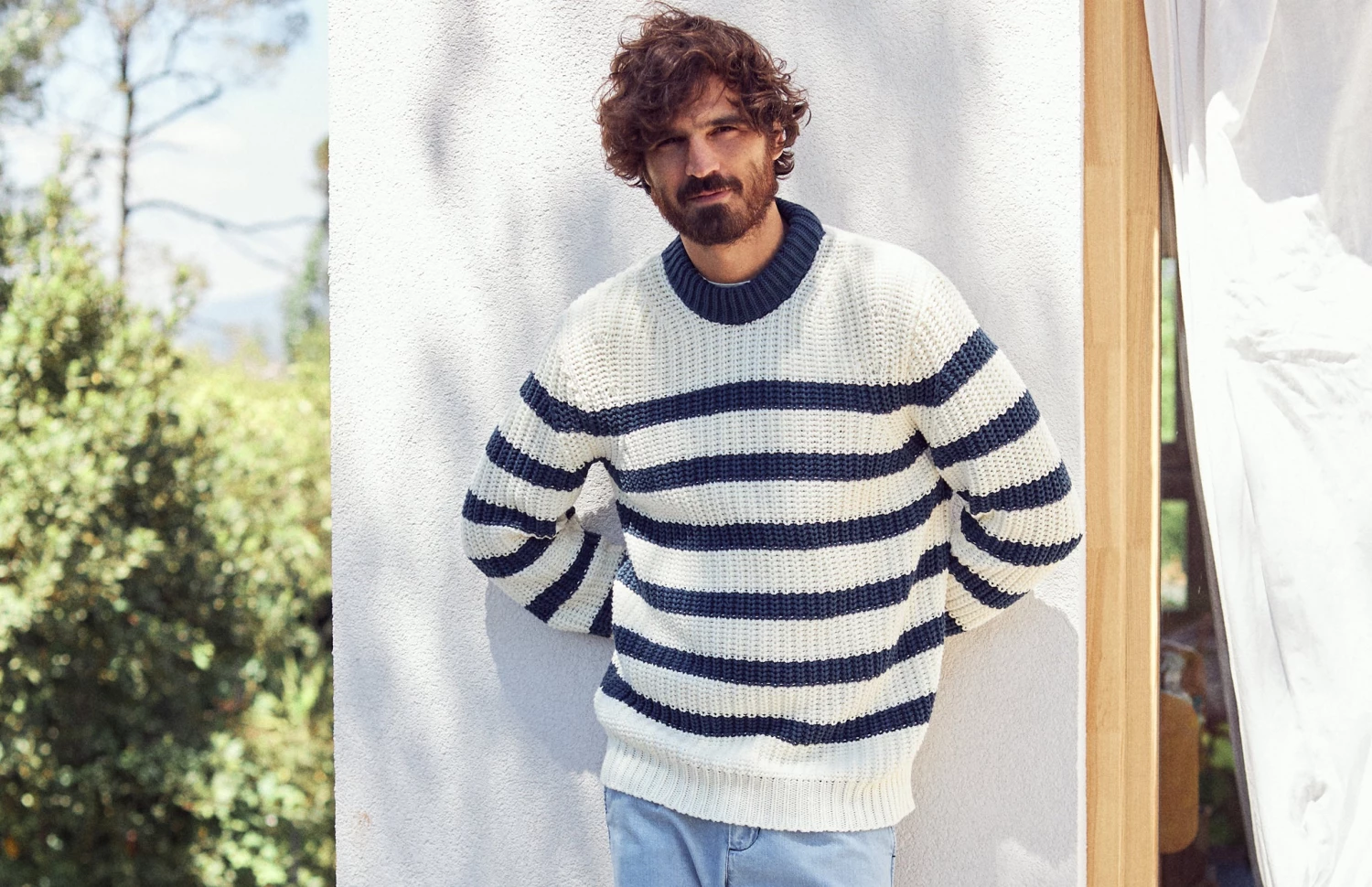 A knitted stitch fabric combined with deep navy blue stripes: the Walker. In a fairly loose fit, hip length and ribbed edges for comfort. Also, a soft fabric that’s great for sensitive skin as there are no pesticides used at the raw material phase.