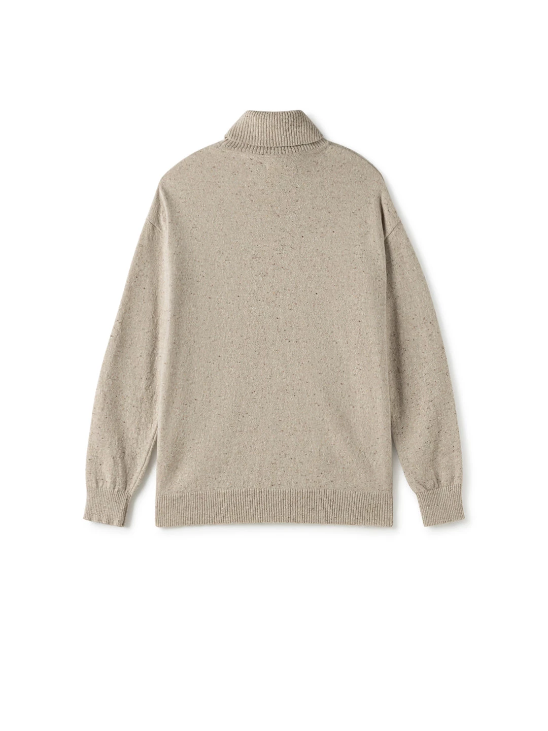 A 100% recycled and nepped design means this knit comes with a sprinkle of colour. The Wha is as sustainable as it comes – drawing down emissions and resource use by recycling existing materials. With ribbed edges and a folded turtleneck. The garment has a regular fit and hip-length.