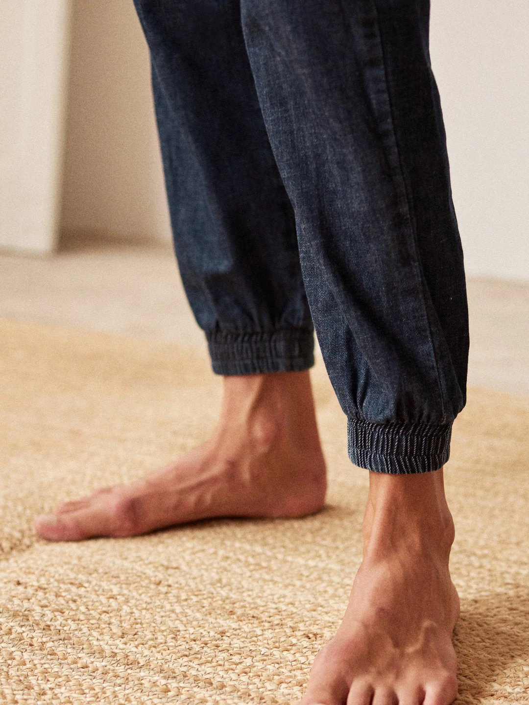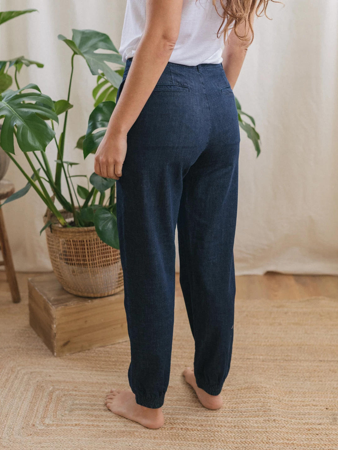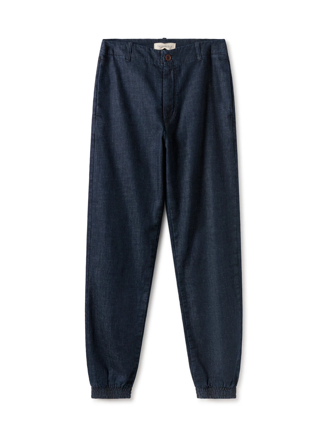 A bold take on regular jeans, the Chirpoy. Made of a lightweight fabric that feels soft and breathable on your skin. Featuring a naturally sourced corozo button, elastic cuffs and 4 pockets in total.