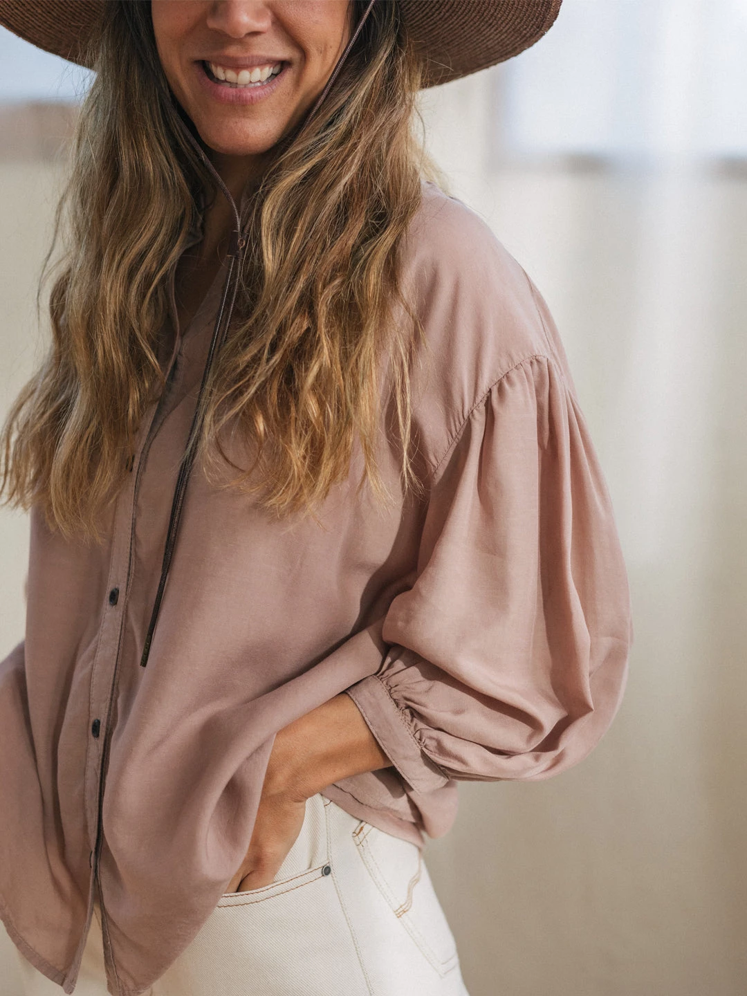 The Gabriela shirt, one of our personal favourites! With dropped puff sleeves and naturally sourced corozo buttons. This shirt will feel extremely light, silky and soft against your skin due to the highly breathable eco fabric. It has a rather loose fit.Â