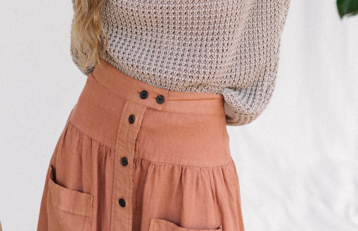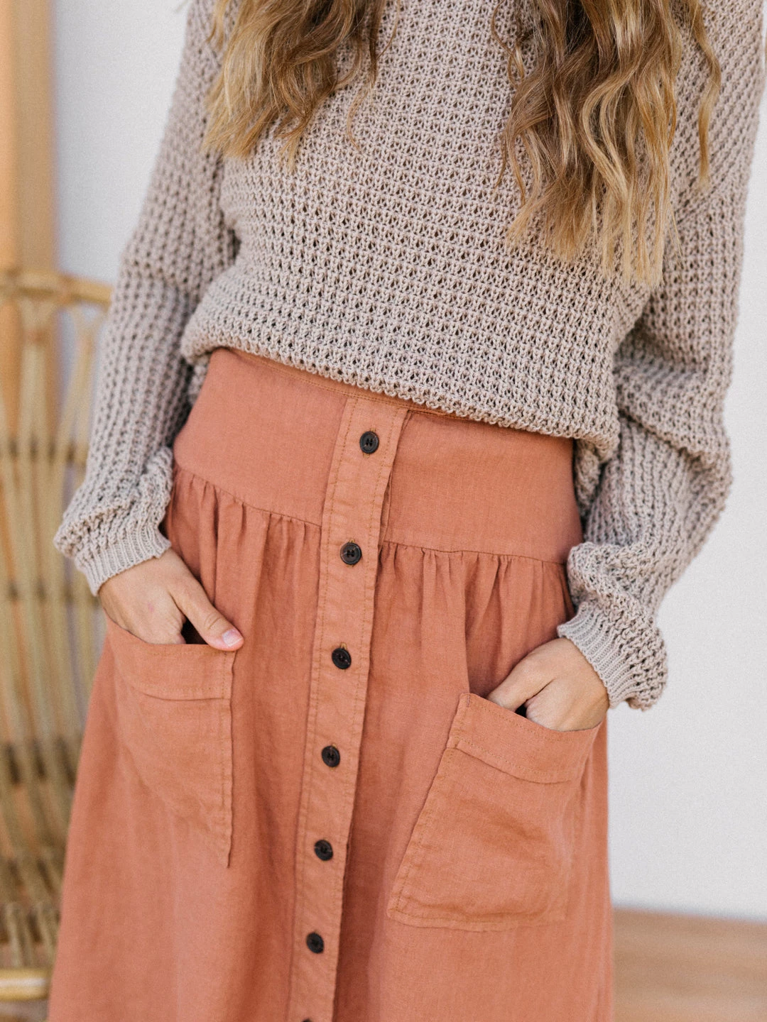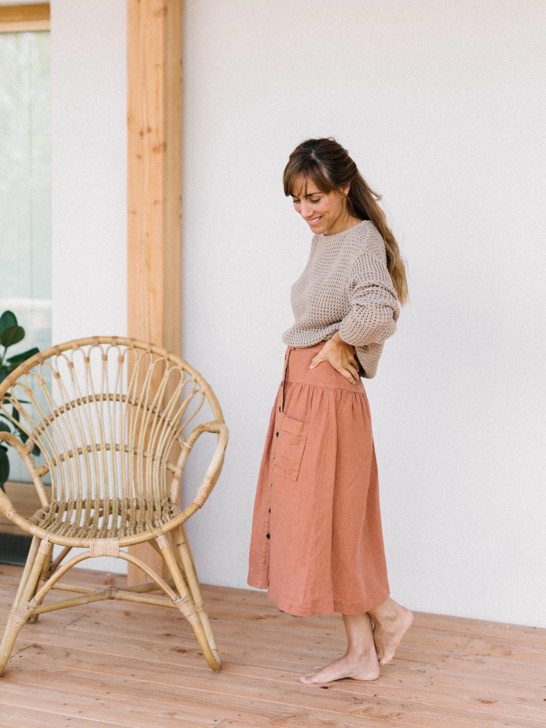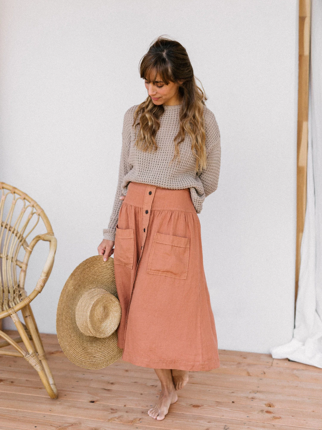 A bolder take on fashion brought us to the Damang skirt. The length falls below the knees. It has a yoke in the front and back and the pockets are not sideways but patched on the front part. For the 70s style front-closure, we opted for corozo buttons that are naturally sourced.