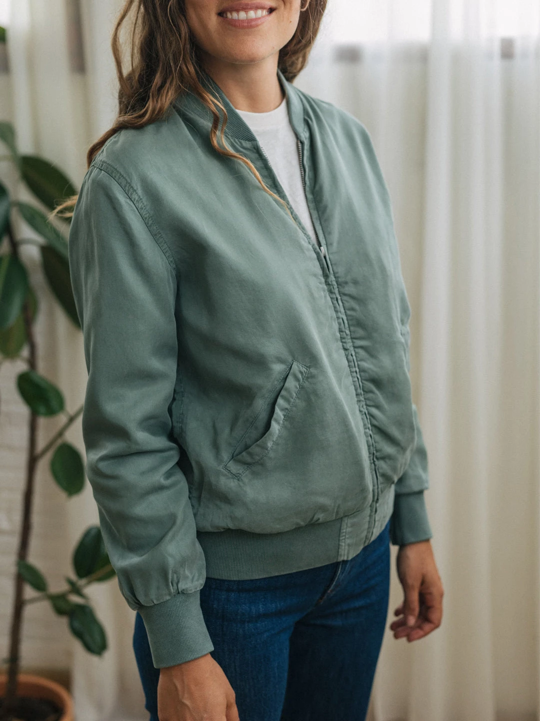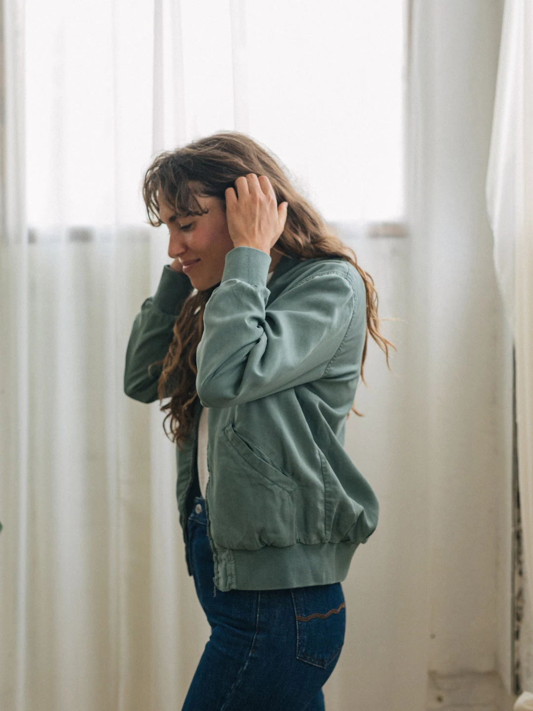 Our Vulcano is a beautiful, lightweight bomber jacket made of TENCELâ„¢ Lyocell fibers. It’s designed in a regular fit, but the shape of the jacket gives it a rather oversized look. The Vulcano has ribbed hems and cuffs for extra comfort and falls slightly below the hips.Â