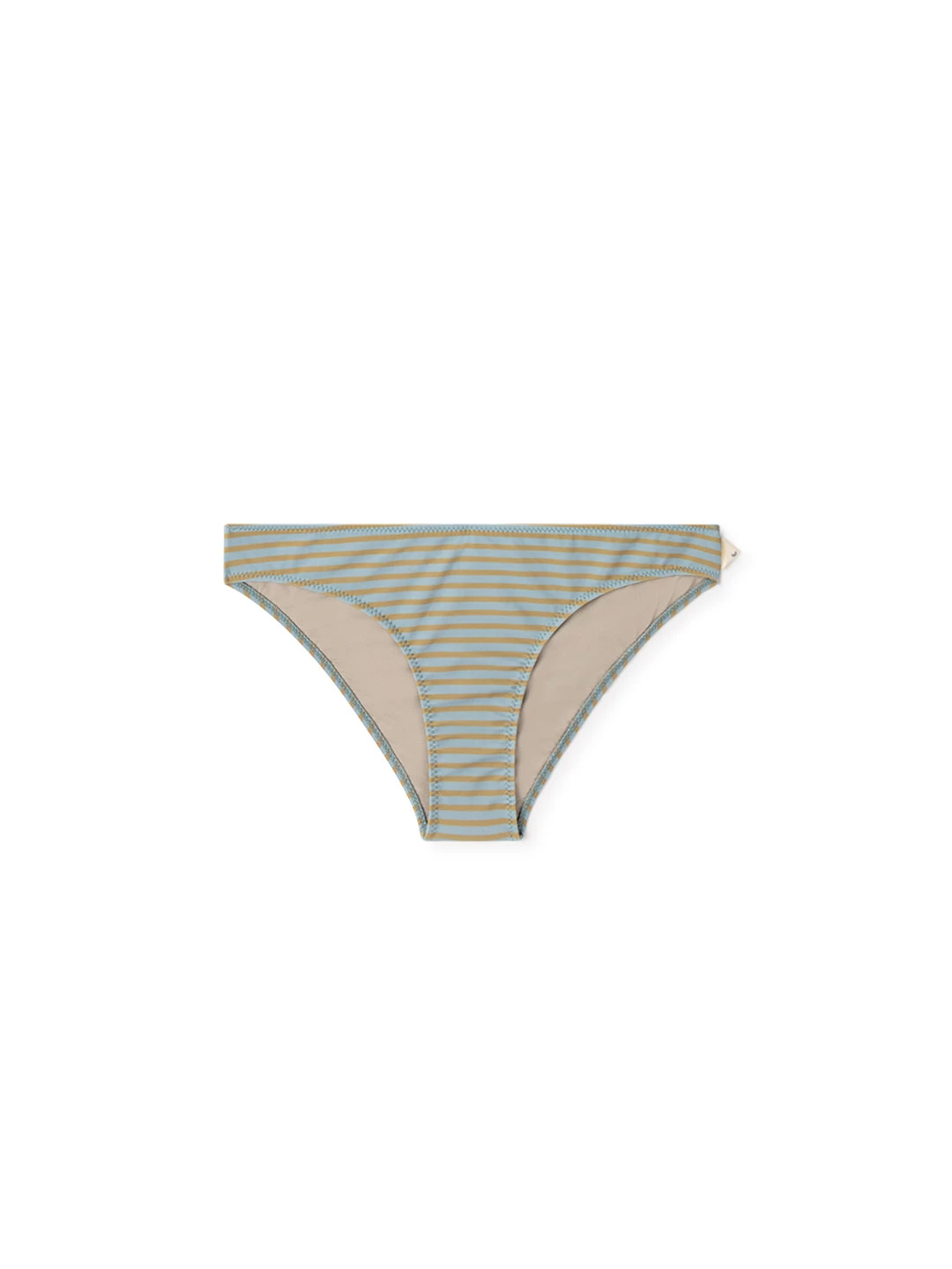 A classic bikini style in striking blue and mustard colour stripes: the Vernon swimwear bottom. Designed with a thin waistband in a regular V form. It has a slim fit.