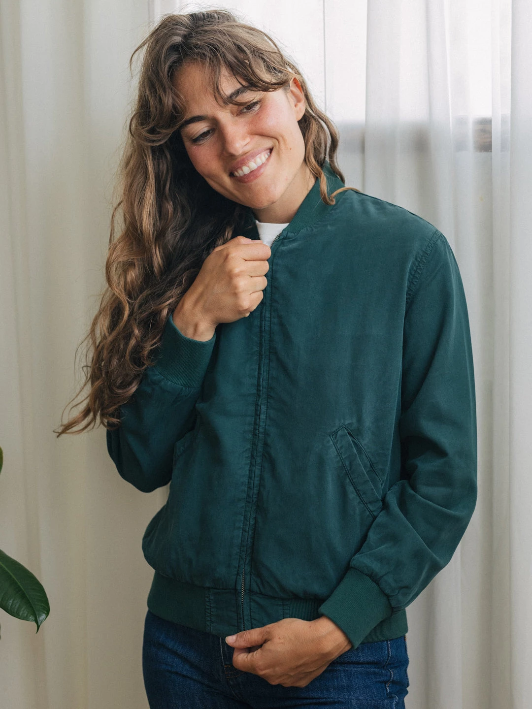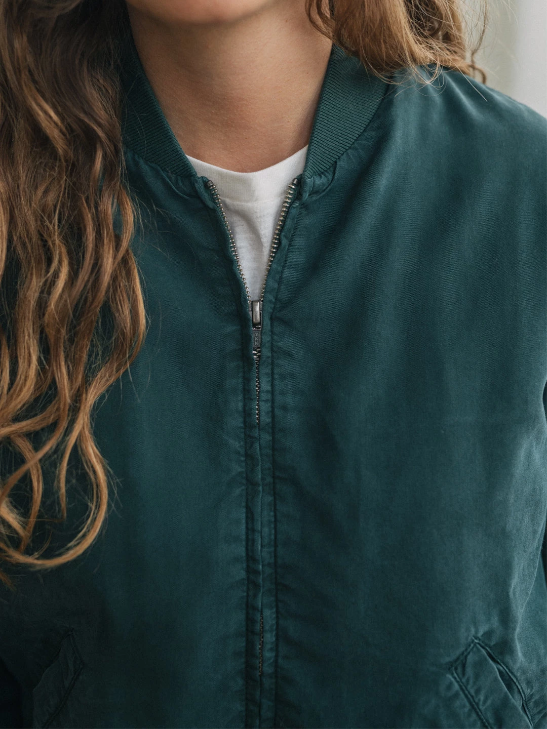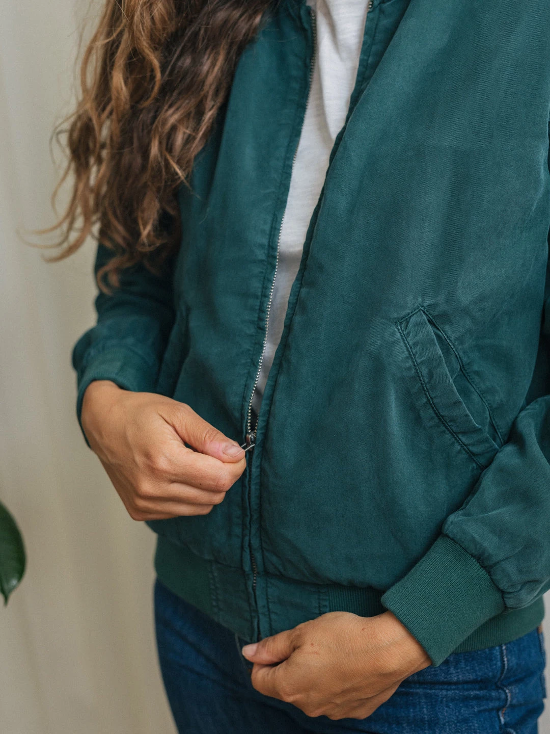 Our Vulcano is a beautiful, lightweight bomber jacket made of TENCELâ„¢ Lyocell fibers. It’s designed in a regular fit, but the shape of the jacket gives it a rather oversized look. The Vulcano has ribbed hems and cuffs for extra comfort and falls slightly below the hips.Â