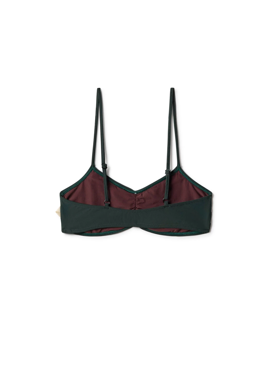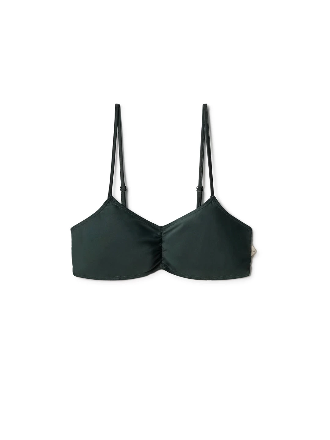A retro bikini top, the Amini. Designed with a gathered chest and adjustable spaghetti straps. Made of a mix of recycled polyamide to salvage plastic waste and elastane to give just the right amount of stretch. Also featuring a small triangular label with our logo.