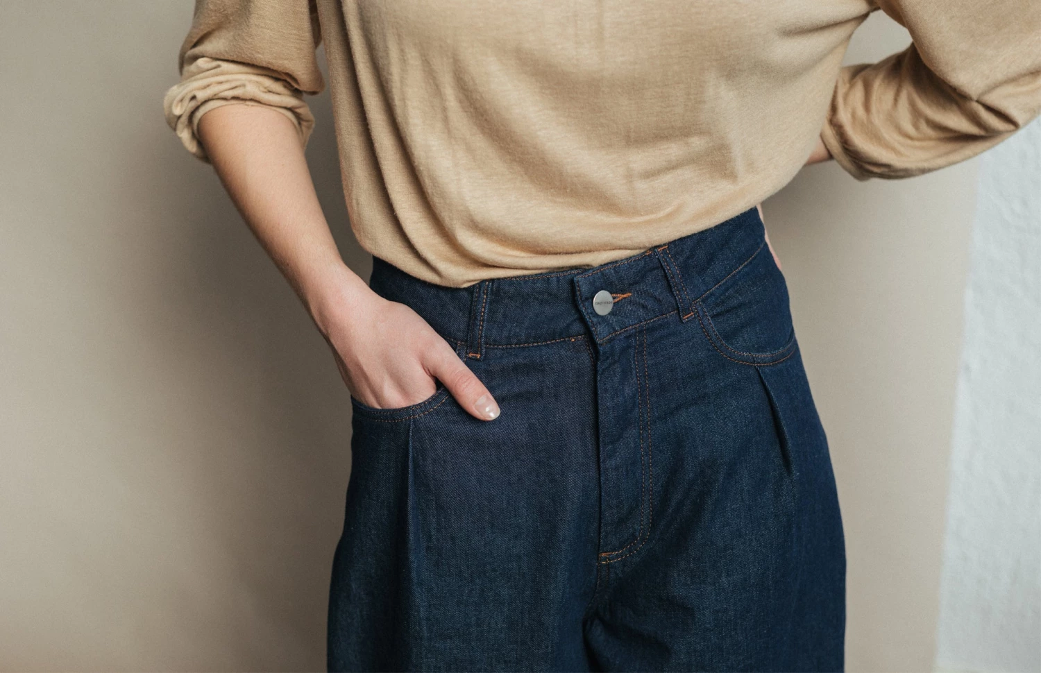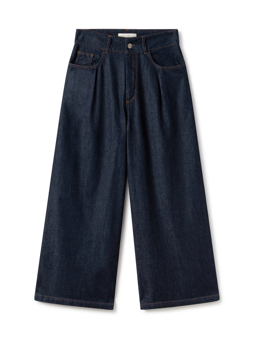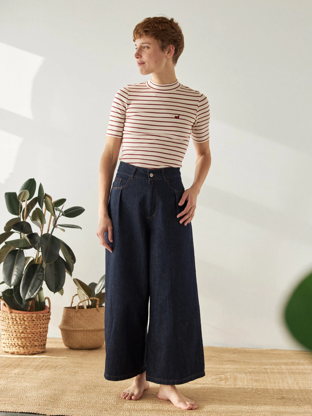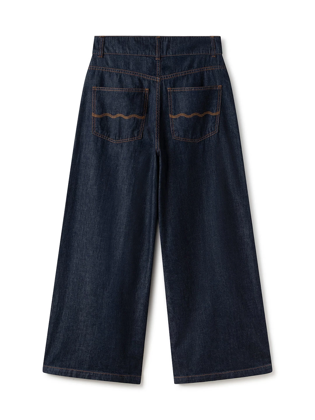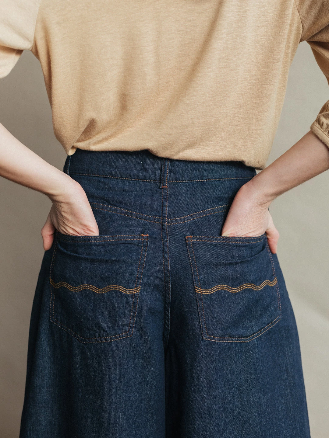 We are excited to bring these new bell style jeans to our denim collection: the Angel! Designed in a beautiful dark blue, with 4 pockets in total – featuring wave detail on the back ones. They come with pleats on the front, wide-leg cut and in a high-waisted fit.Â