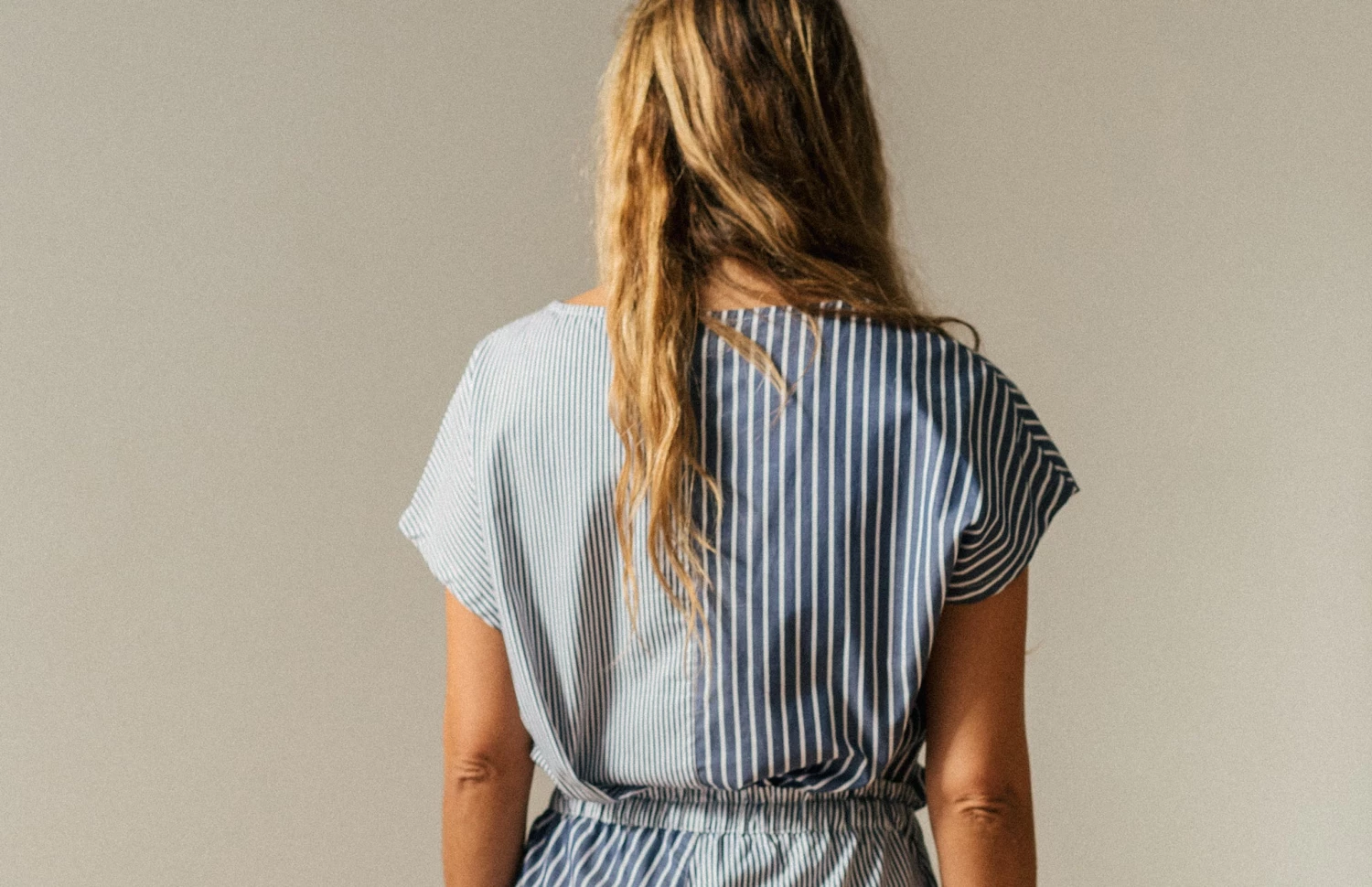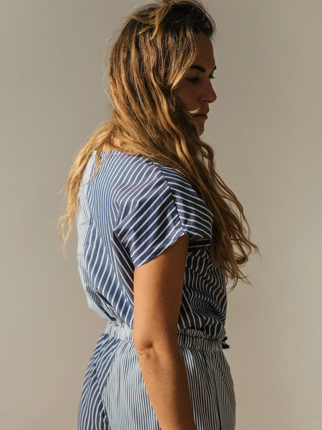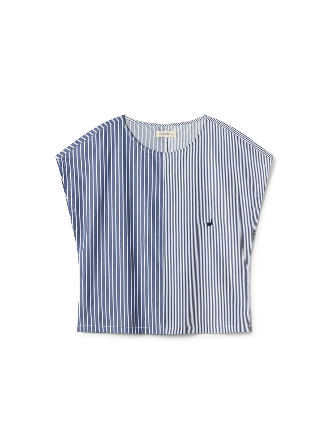 A playful striped style, with its own matching shorts. The Aua comes in contrasting blue stripes on each side and features whale embroidery on the chest. Designed with no sleeves, a regular fit and hip-length cut.