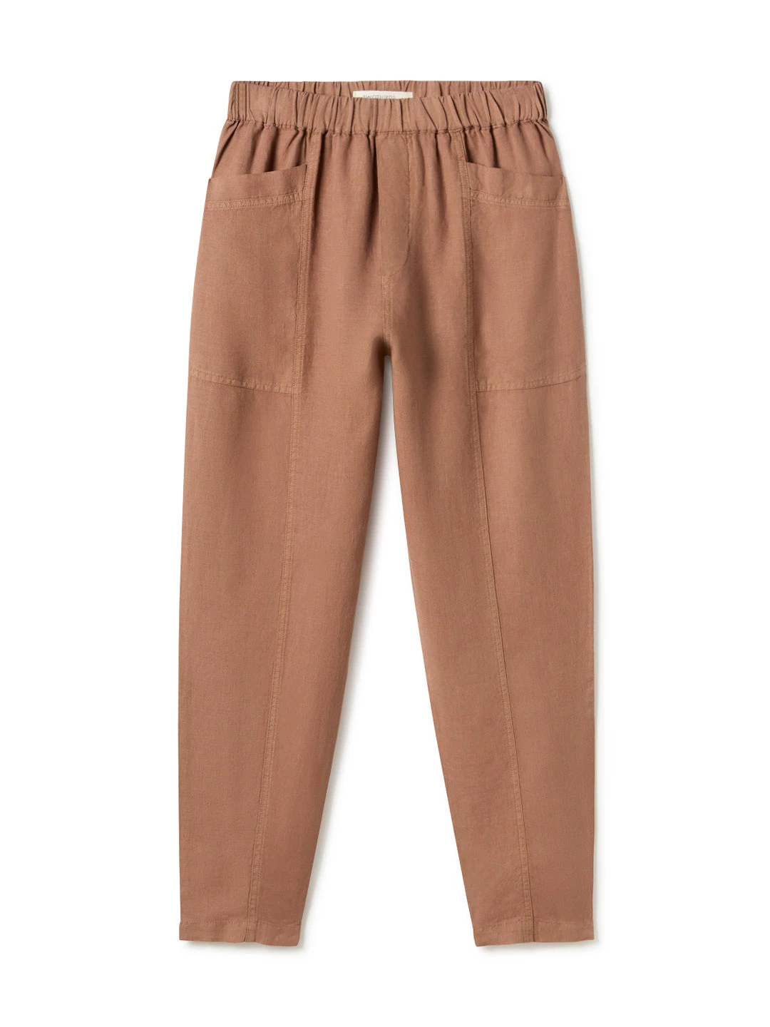 The Bacalar are a breathable pair of pants that are light on the skin. They are designed with a linen fabric, a rubber waistband, folded edges and 2 large, conveniently designed pockets on the front, two more on the back. These trousers come in a fairly loose fit, are high-waisted and fall around the ankles.Â