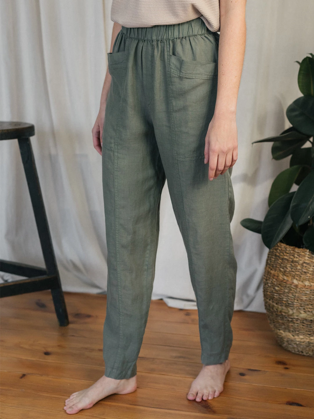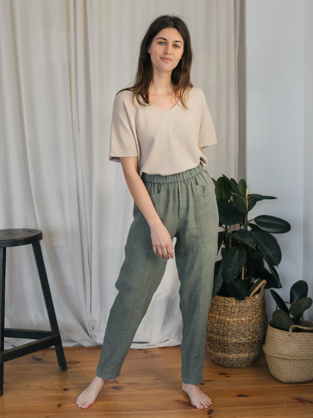 The Bacalar are a breathable pair of pants that are light on the skin. They are designed with a linen fabric, a rubber waistband, folded edges and 2 large, conveniently designed pockets on the front, two more on the back. These trousers come in a fairly loose fit, are high-waisted and fall around the ankles.Â