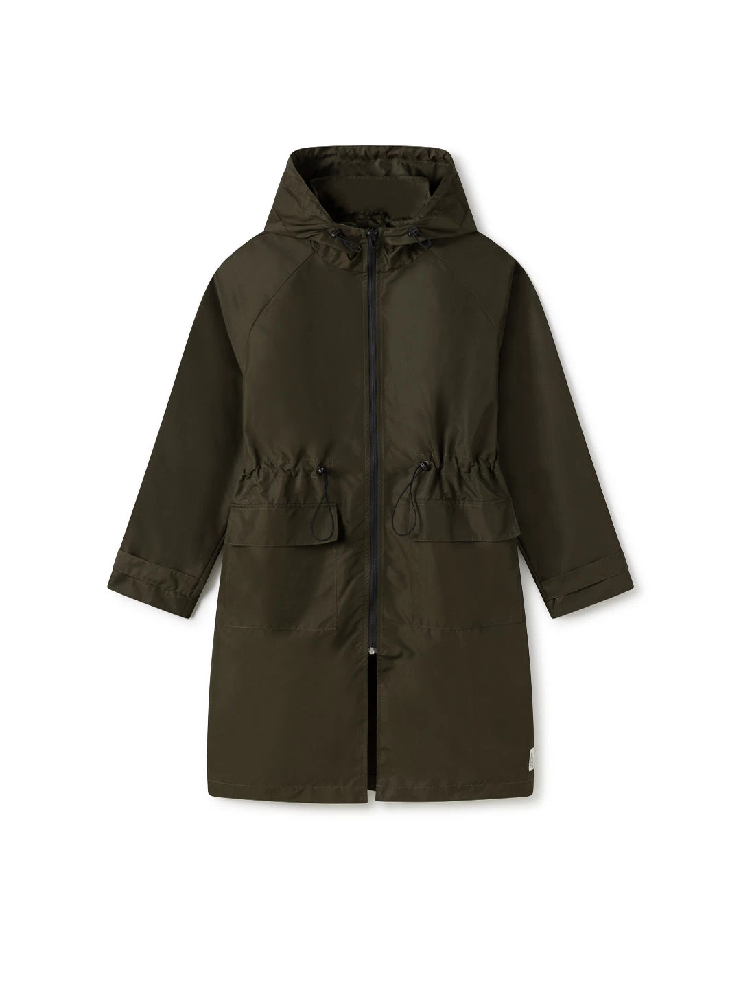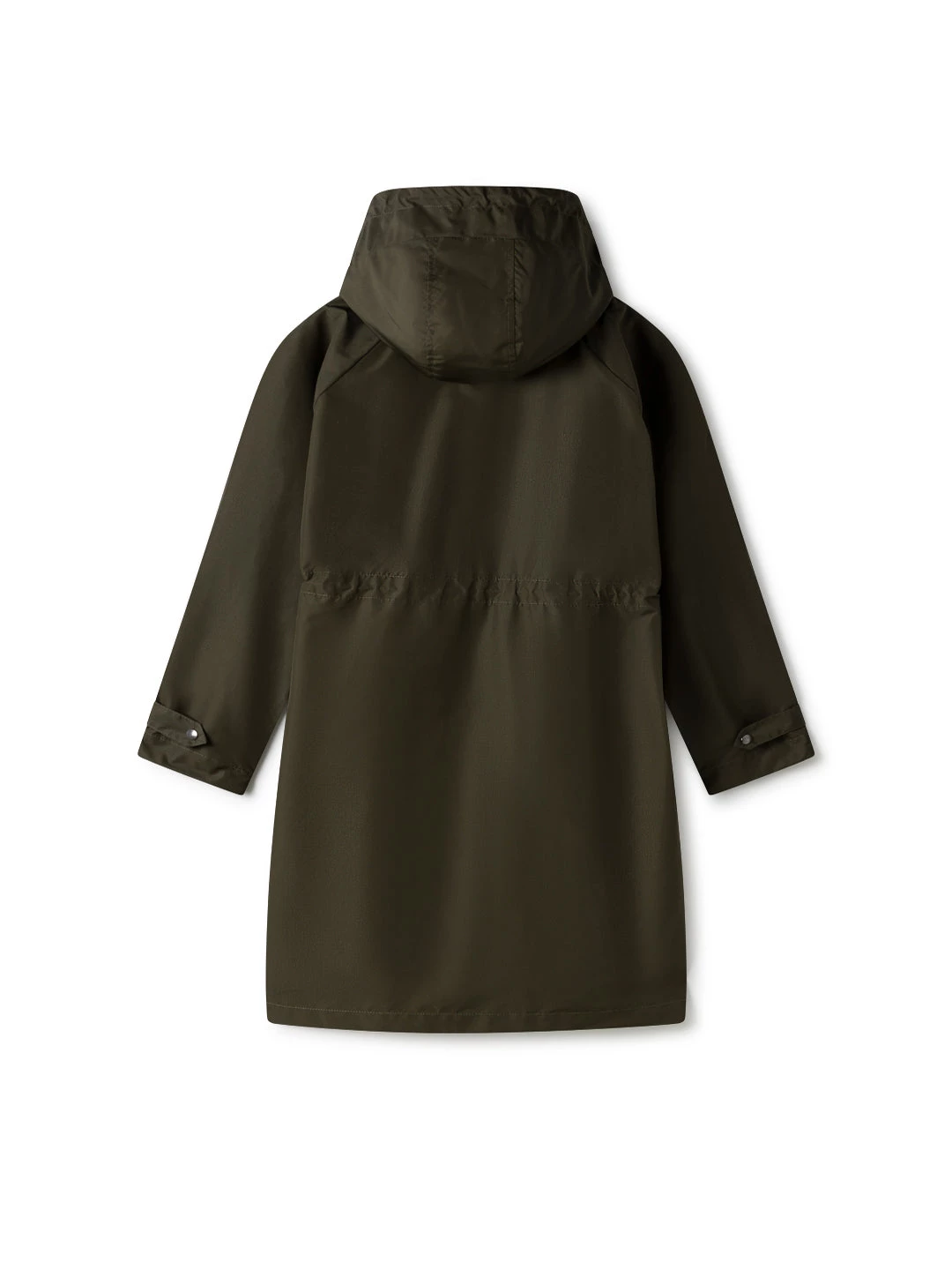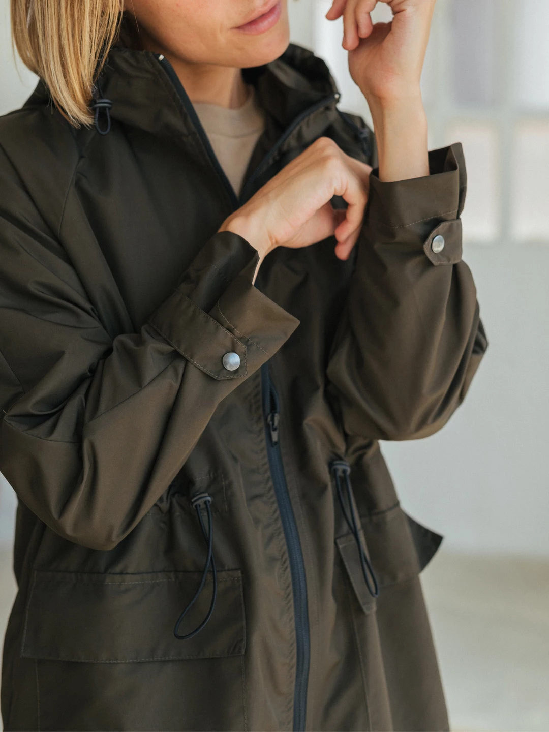 For mild weather conditions: the Bazett parka. This lightweight, year-round style features a gathered hood and waistband to adjust, cuffs with snap buttons and falls below the hips. Comes in a regular fit, with raglan sleeves, two pockets and a zipper that stops above the bottom to lend greater movement and comfort on the go.Â