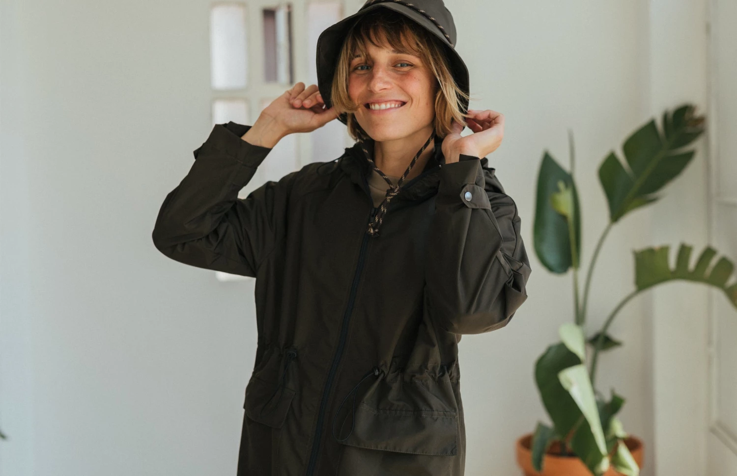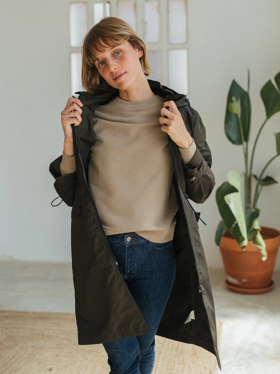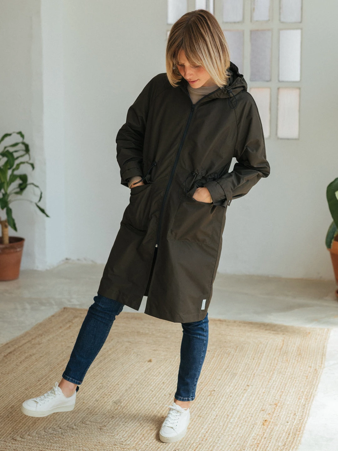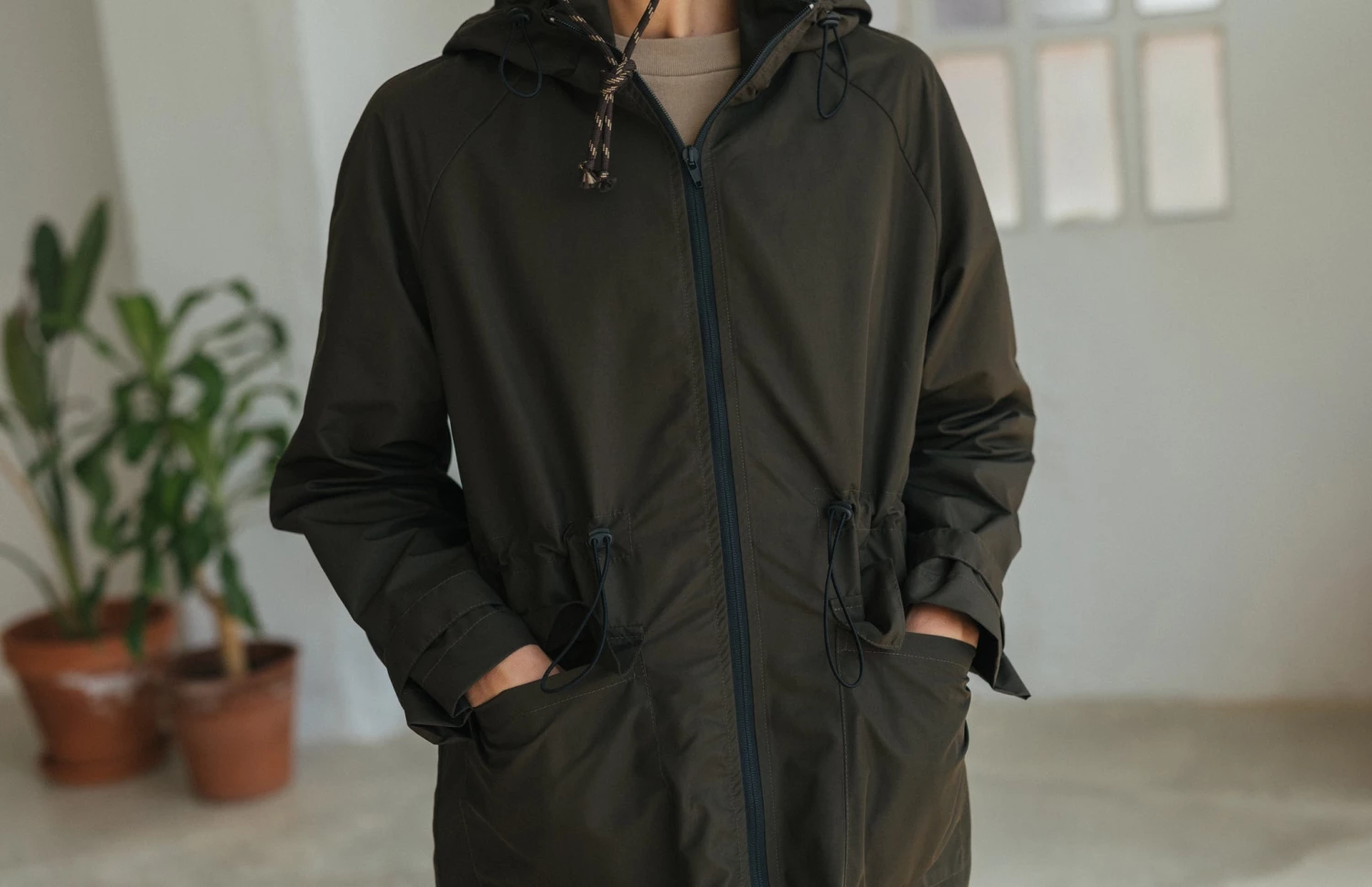For mild weather conditions: the Bazett parka. This lightweight, year-round style features a gathered hood and waistband to adjust, cuffs with snap buttons and falls below the hips. Comes in a regular fit, with raglan sleeves, two pockets and a zipper that stops above the bottom to lend greater movement and comfort on the go.Â