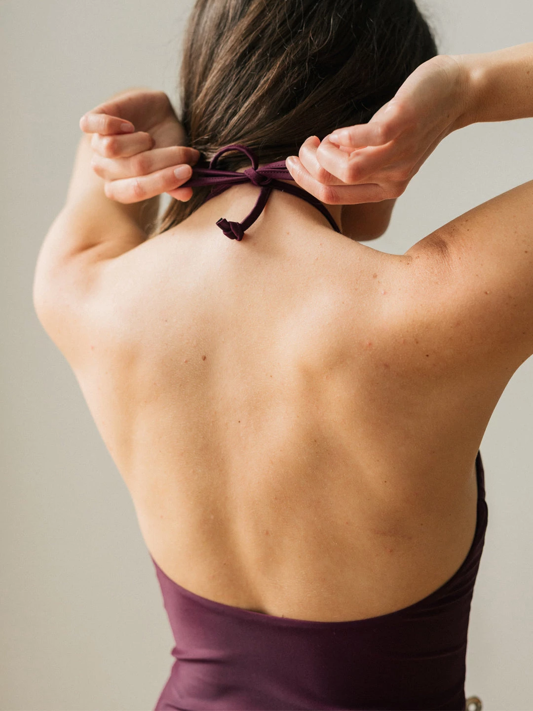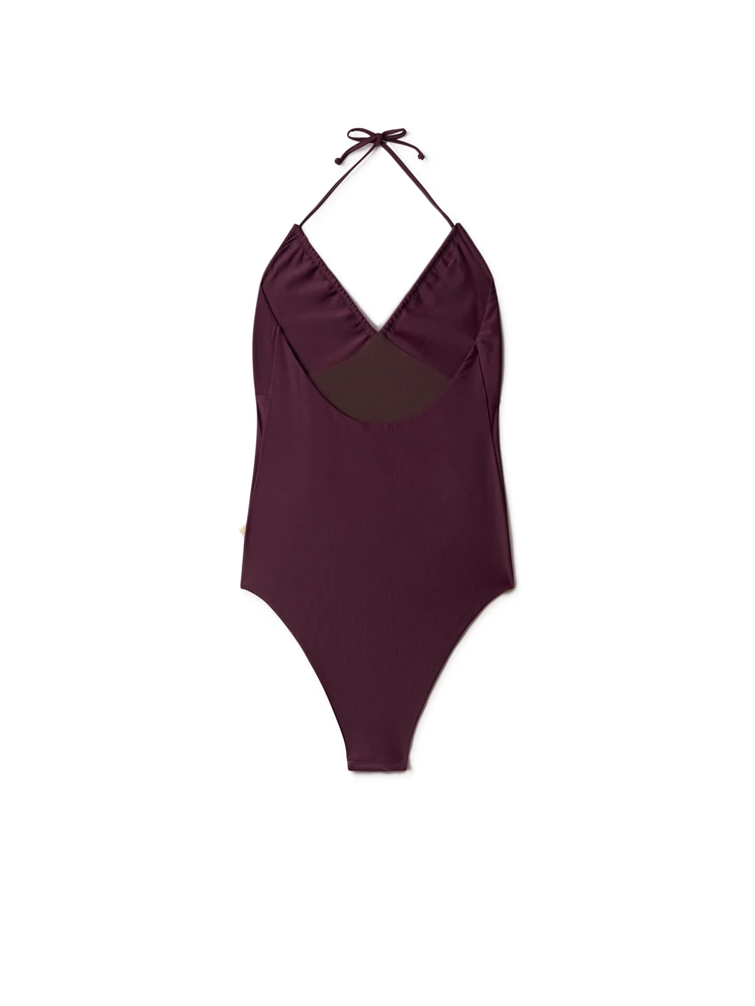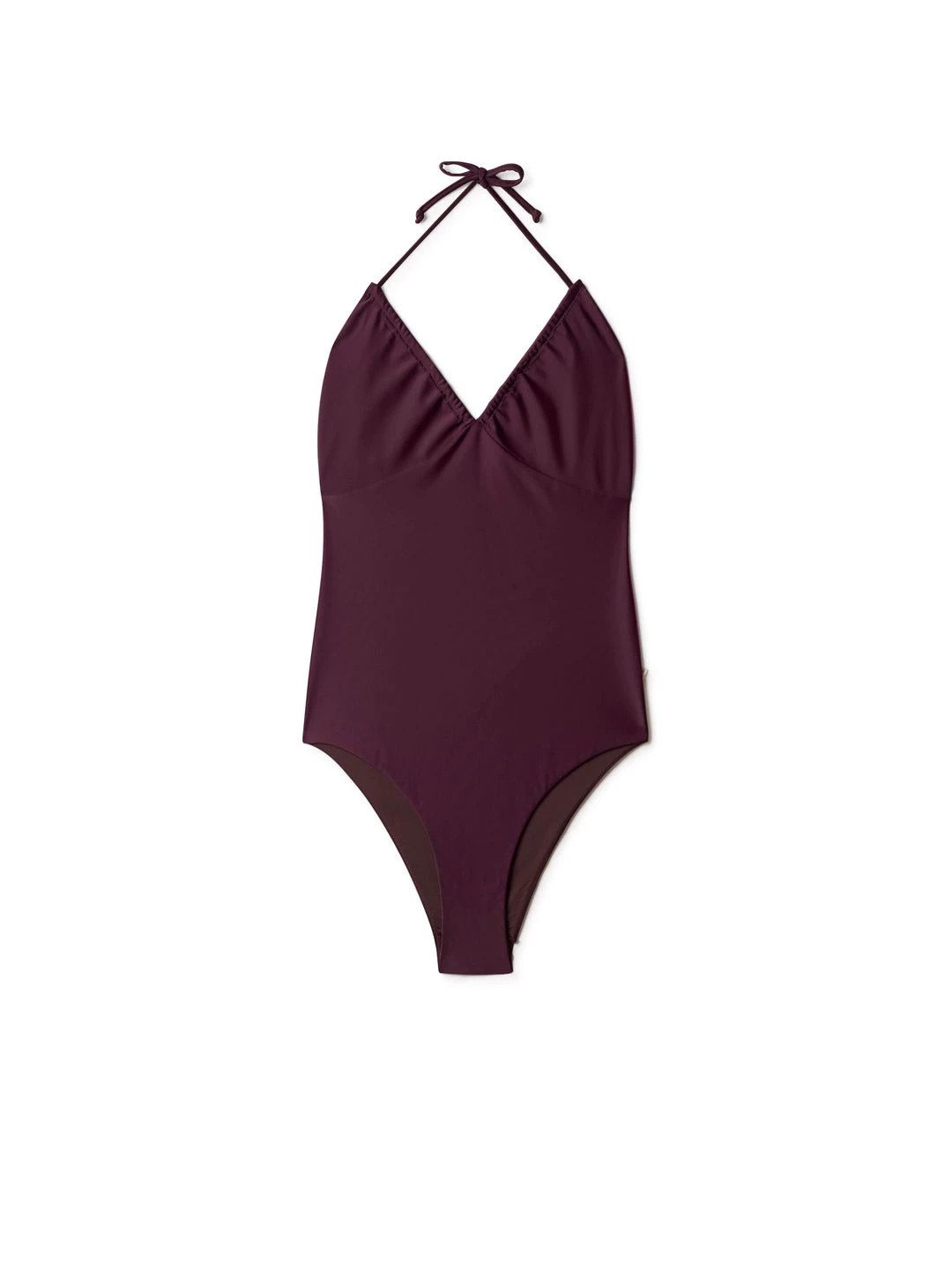 The Bisa is a striking, grape-coloured swimsuit designed with a gathered V-neckline – which adjusts to your liking – and ties, that you can knot on the nape of your neck. Also featuring a small triangular label with our logo.Â