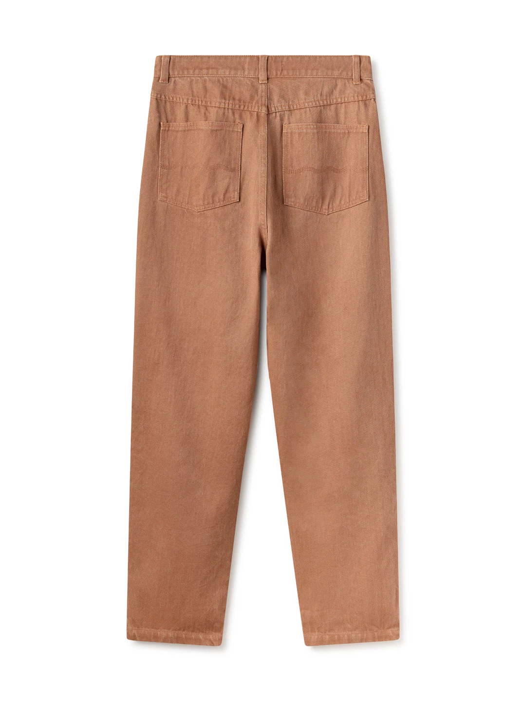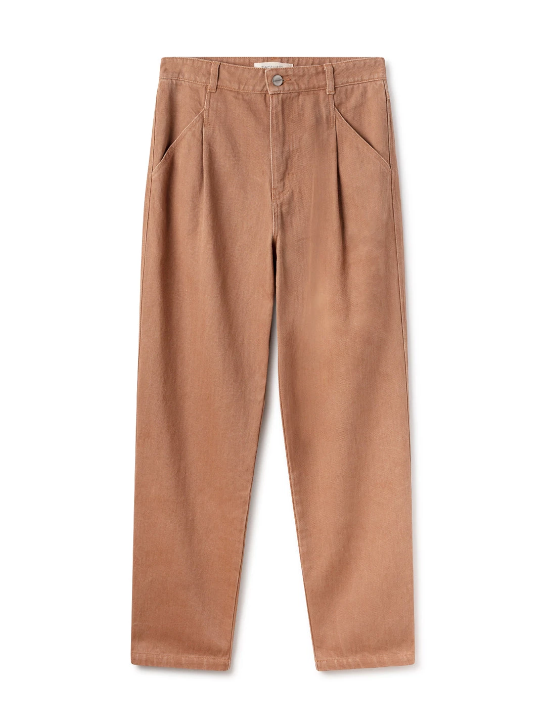We are very excited to bring the Buck to our newest collection! A soft brown pair of straight cut trousers, featuring pleats on the front and a matt silver button. 4 pockets in total, with wave detailing across the back ones. The pants have a mom-fit design and fall around the ankles.