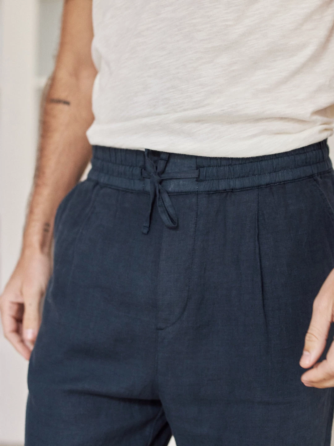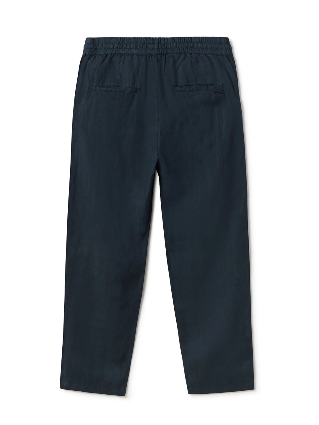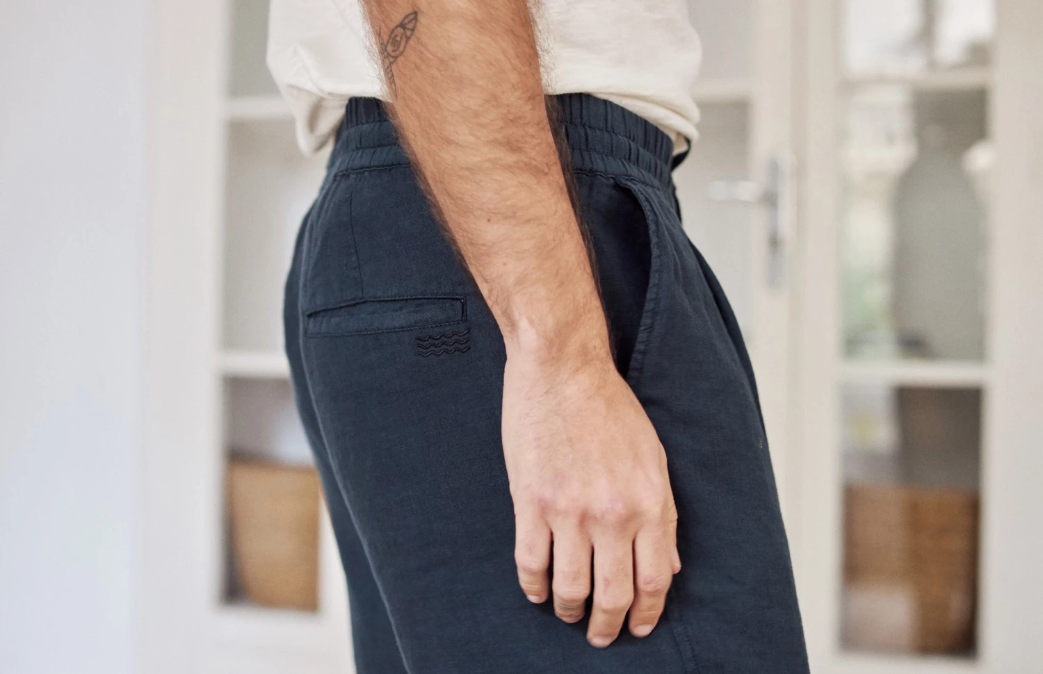 Cool comfort with the pleated Cabezo linen trousers. Designed with an elastic waistband with a cord to adjust and 4 pockets in total, featuring a wave detail on the right back one.Â