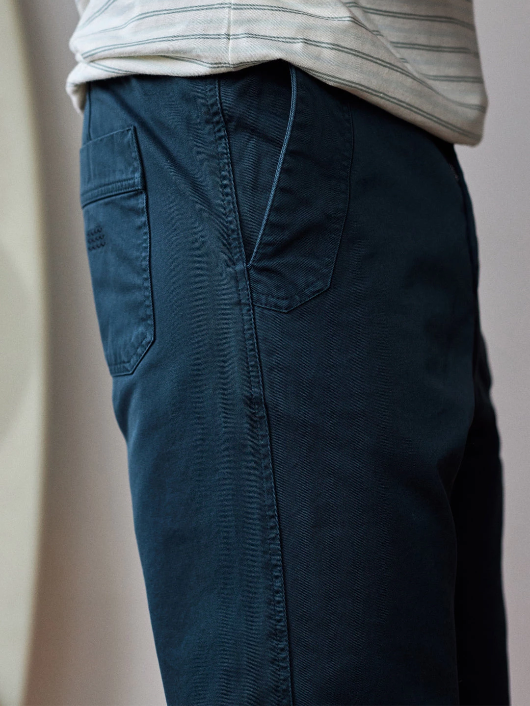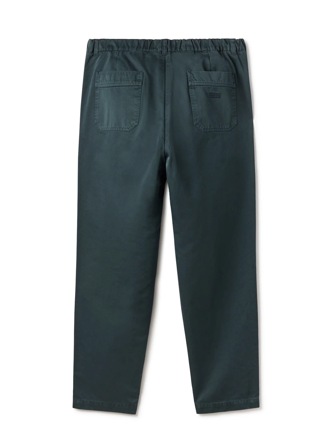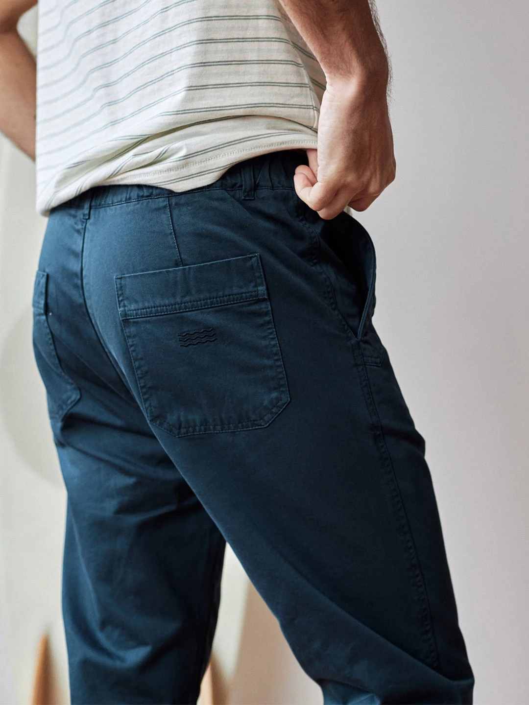 Meet our chino style, straight-cut pants with a comfy elastic waistband around the back. Featuring 2 stylish patch pockets on the front and 2 pockets at the back, one with wave embroidery. It comes with a hidden snap instead of a button and falls around the ankles.