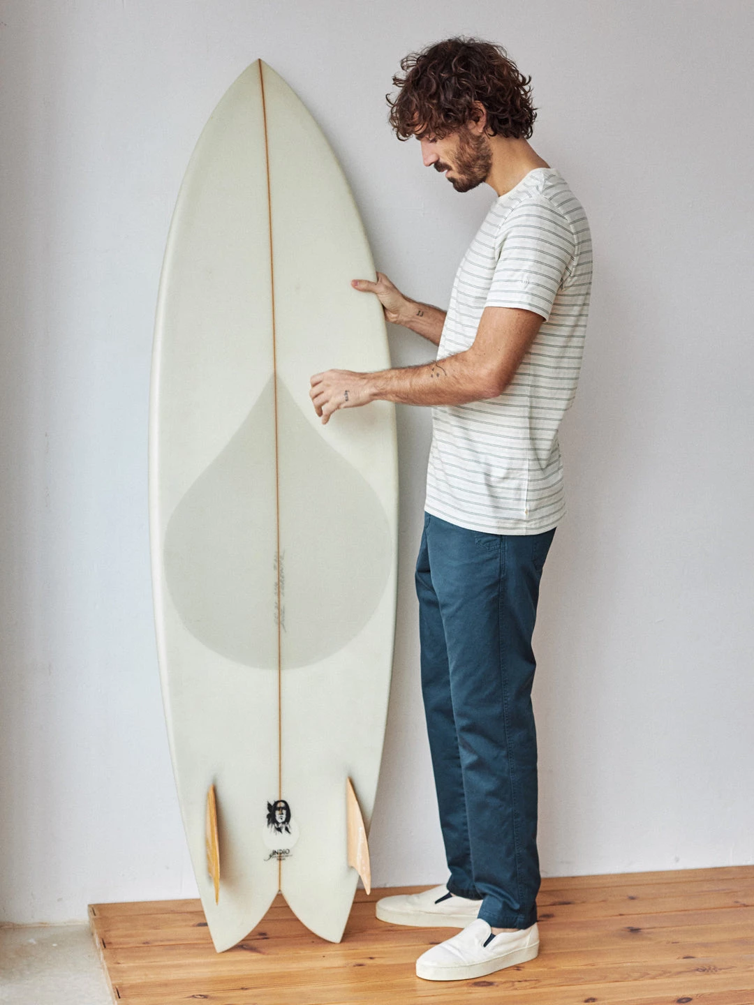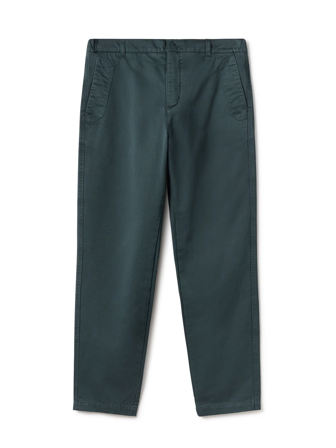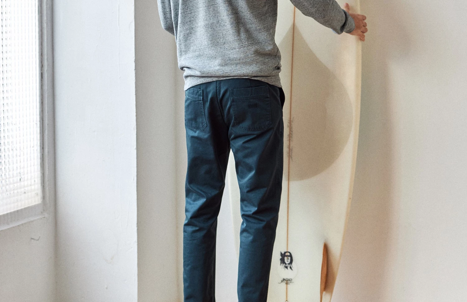 Meet our chino style, straight-cut pants with a comfy elastic waistband around the back. Featuring 2 stylish patch pockets on the front and 2 pockets at the back, one with wave embroidery. It comes with a hidden snap instead of a button and falls around the ankles.