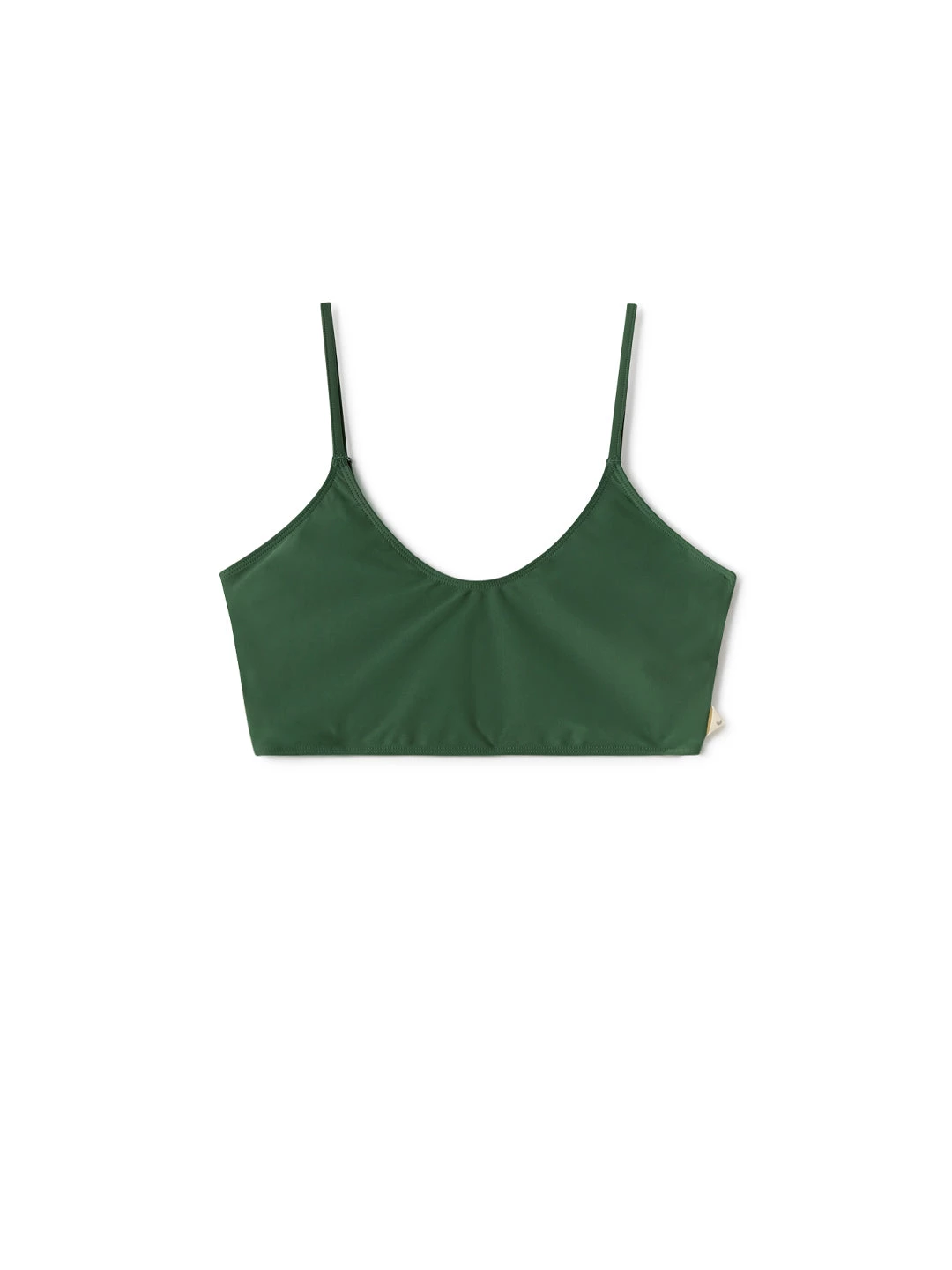 In a beautiful green colour, the Cuvier is made with a “peachskin” suede texture that is a joy to wear. It has soft gathered sides, a triangular neckline and adjustable shoulder straps.