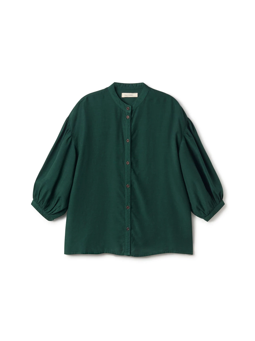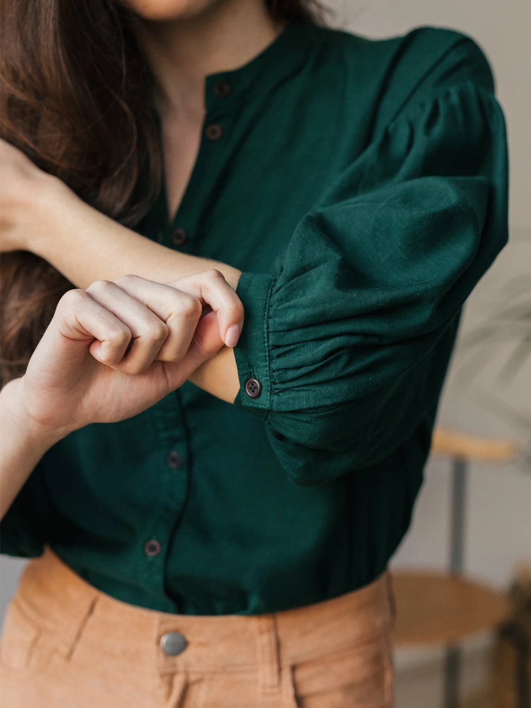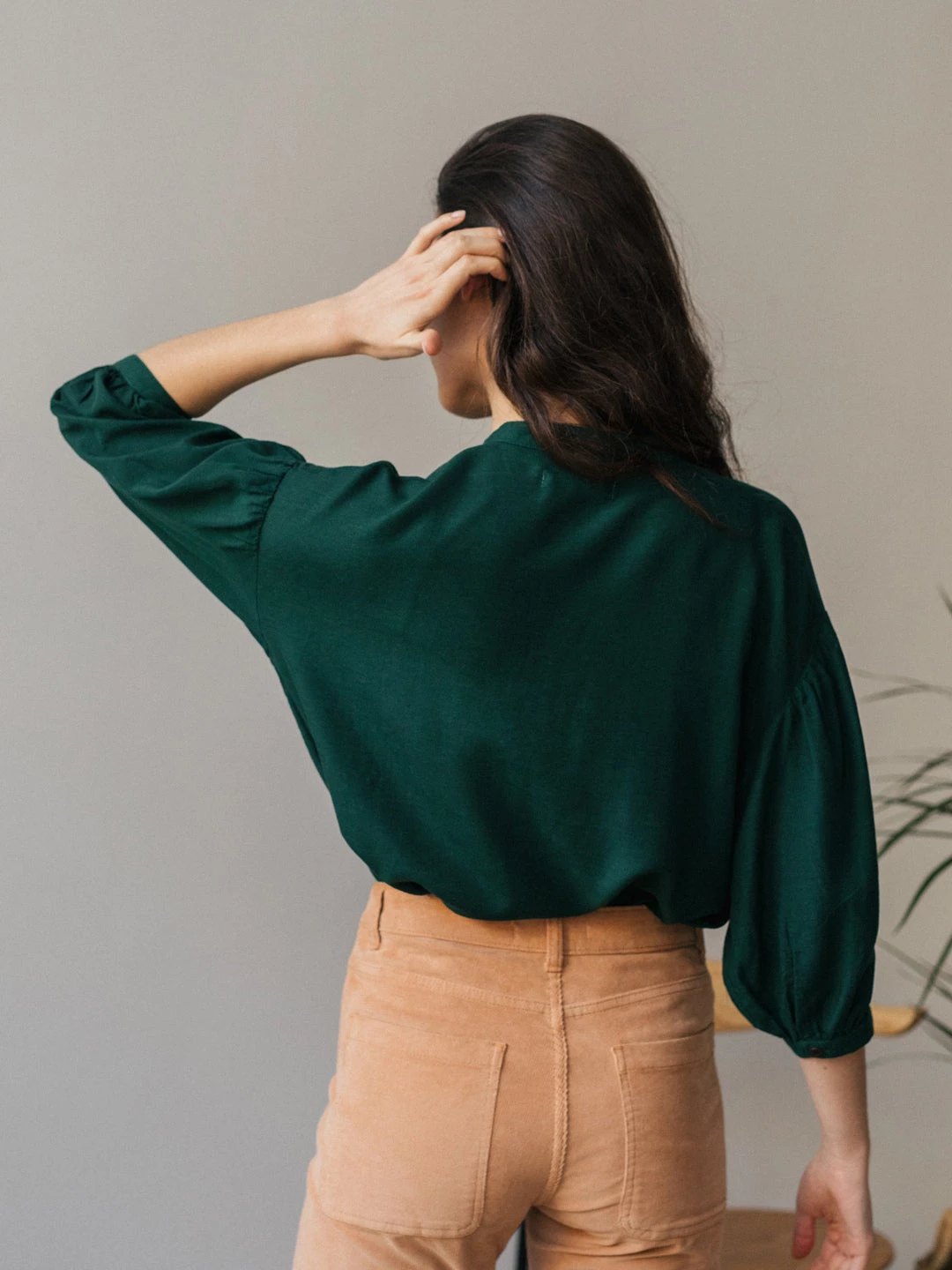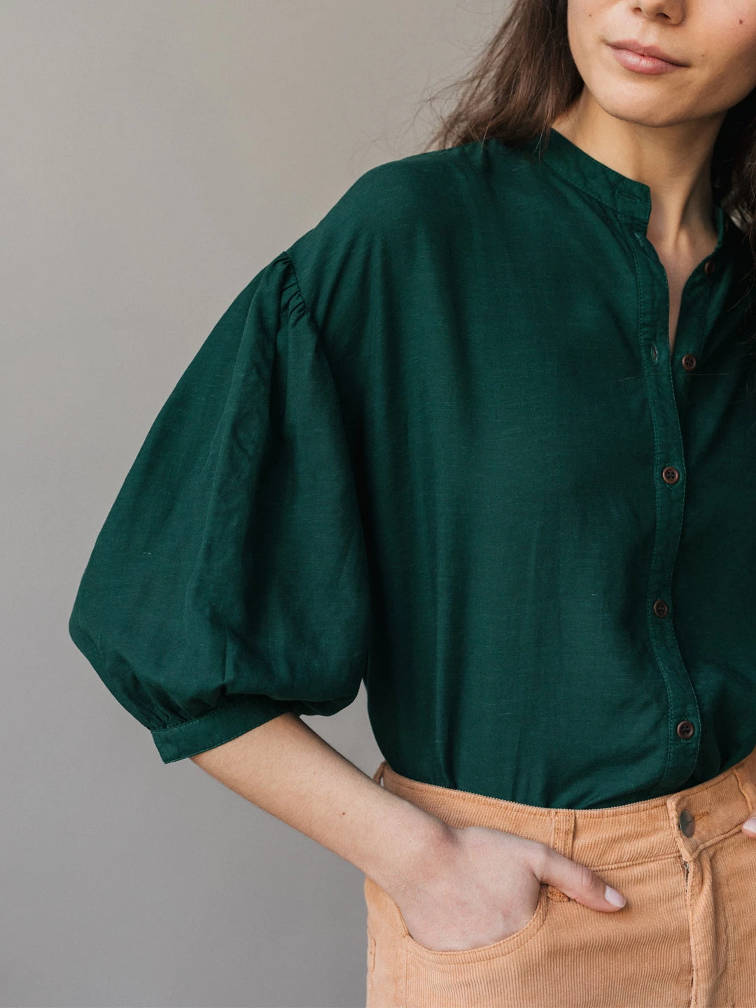 The Gabriela shirt, one of our personal favourites! With dropped puff sleeves and naturally sourced corozo buttons. This shirt will feel extremely light, silky and soft against your skin due to the highly breathable eco fabric. It has a rather loose fit.Â