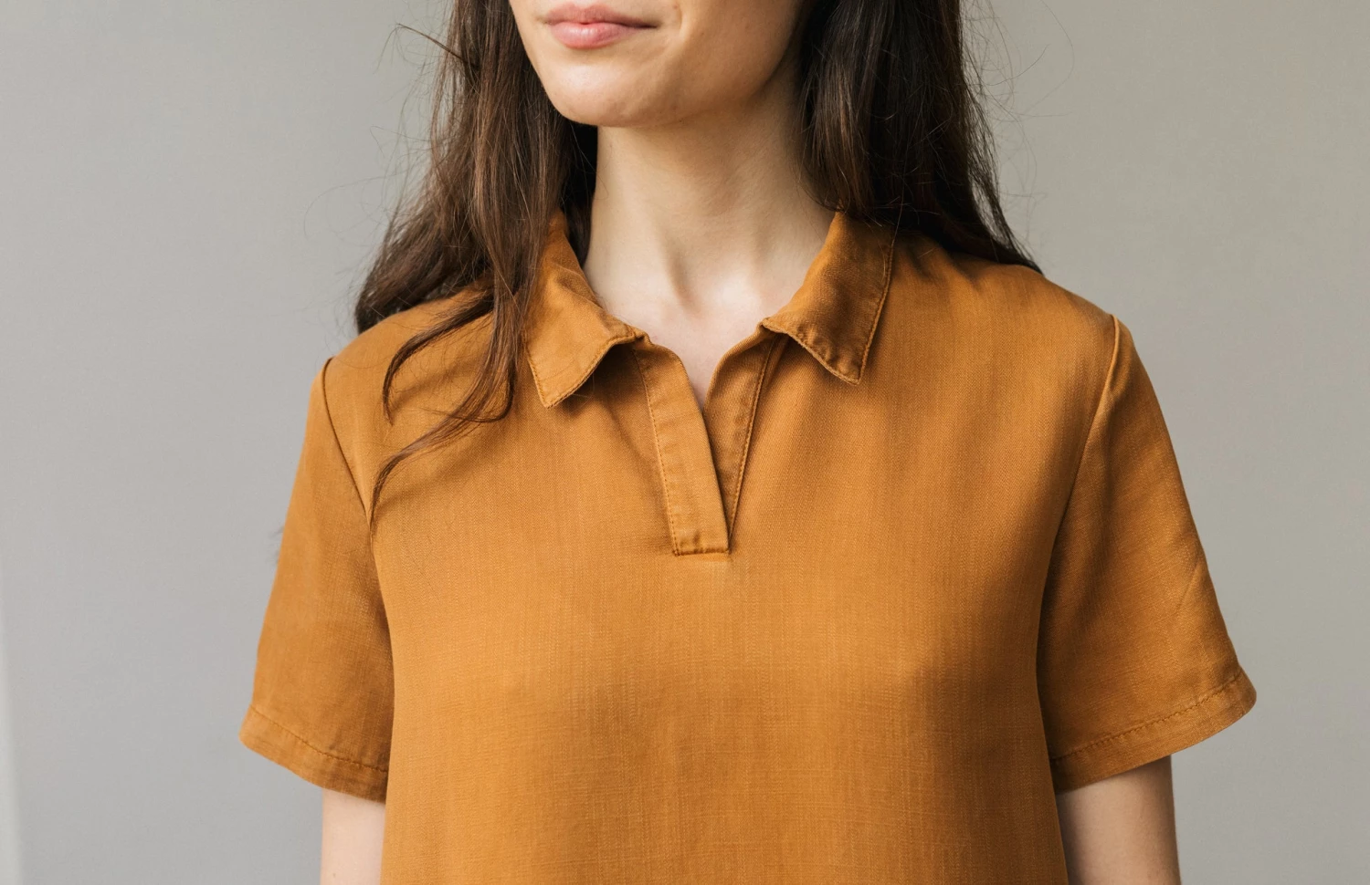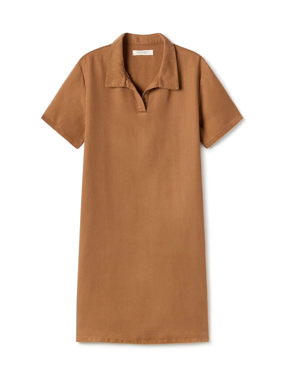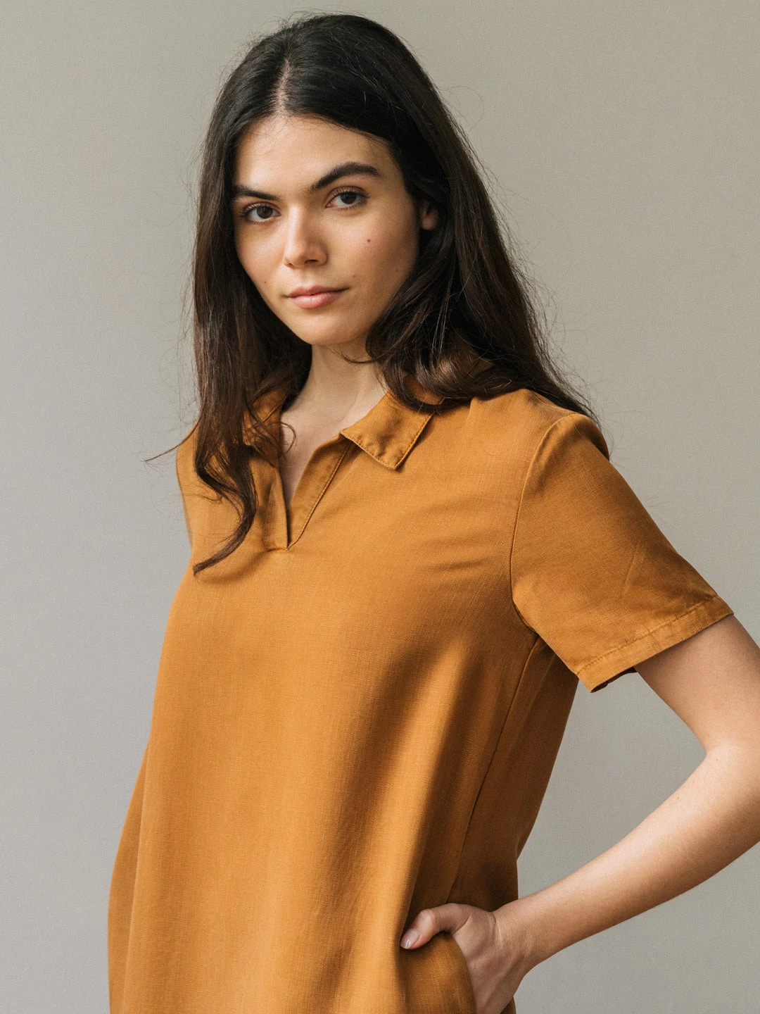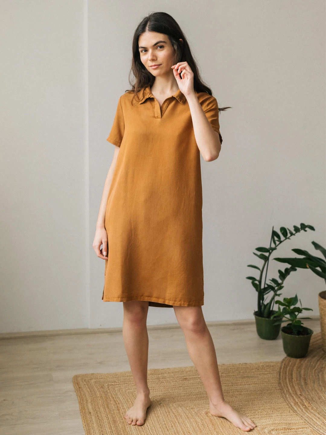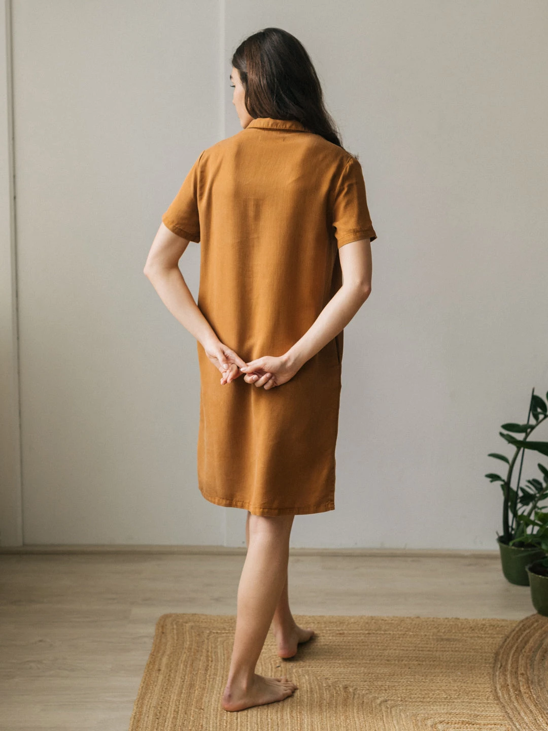 A shirt style dress, made in a soft and breathable fabric that is also sustainable. The Ginger is designed with side pockets, a regular opened collar and bottom side cuts. It comes in a regular fit and loosens up at the bottom, falling above the knees.