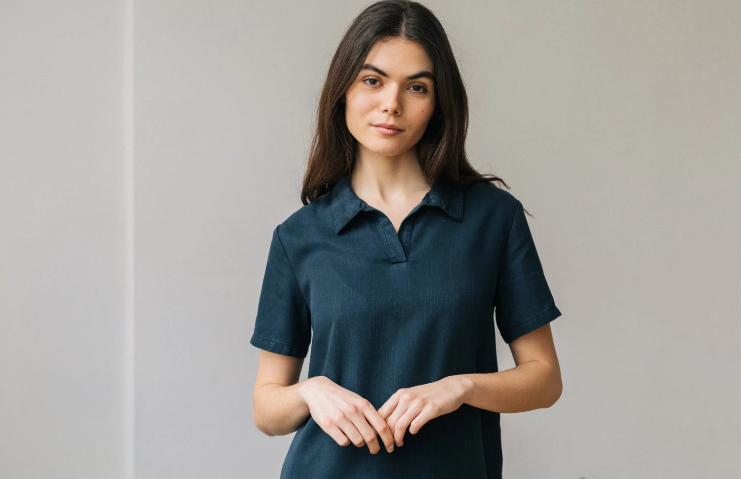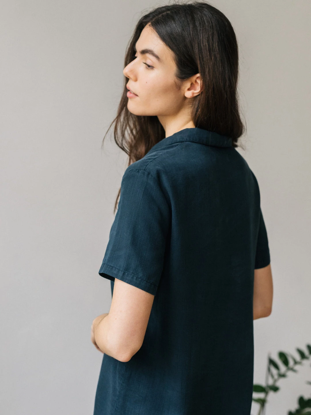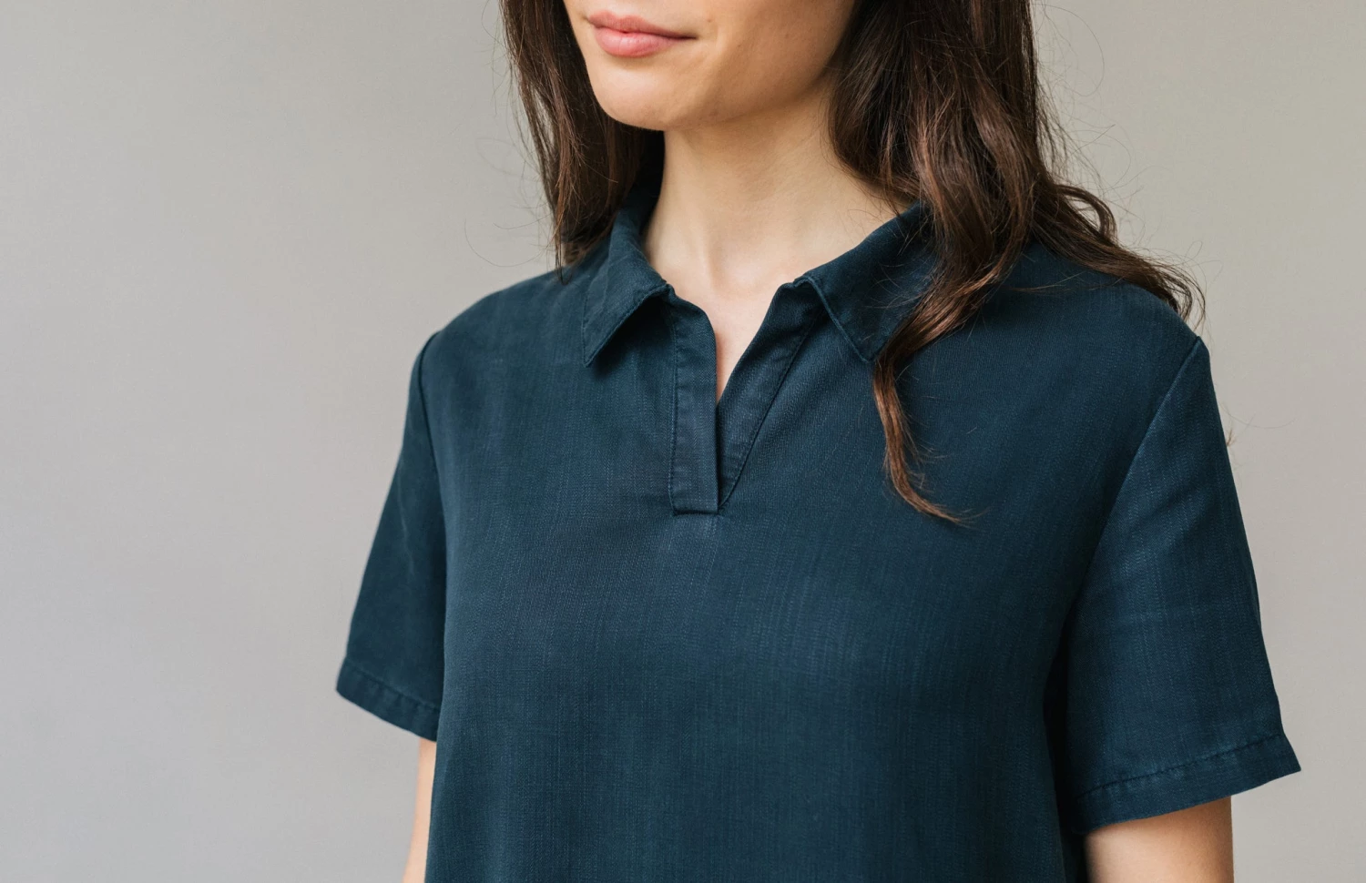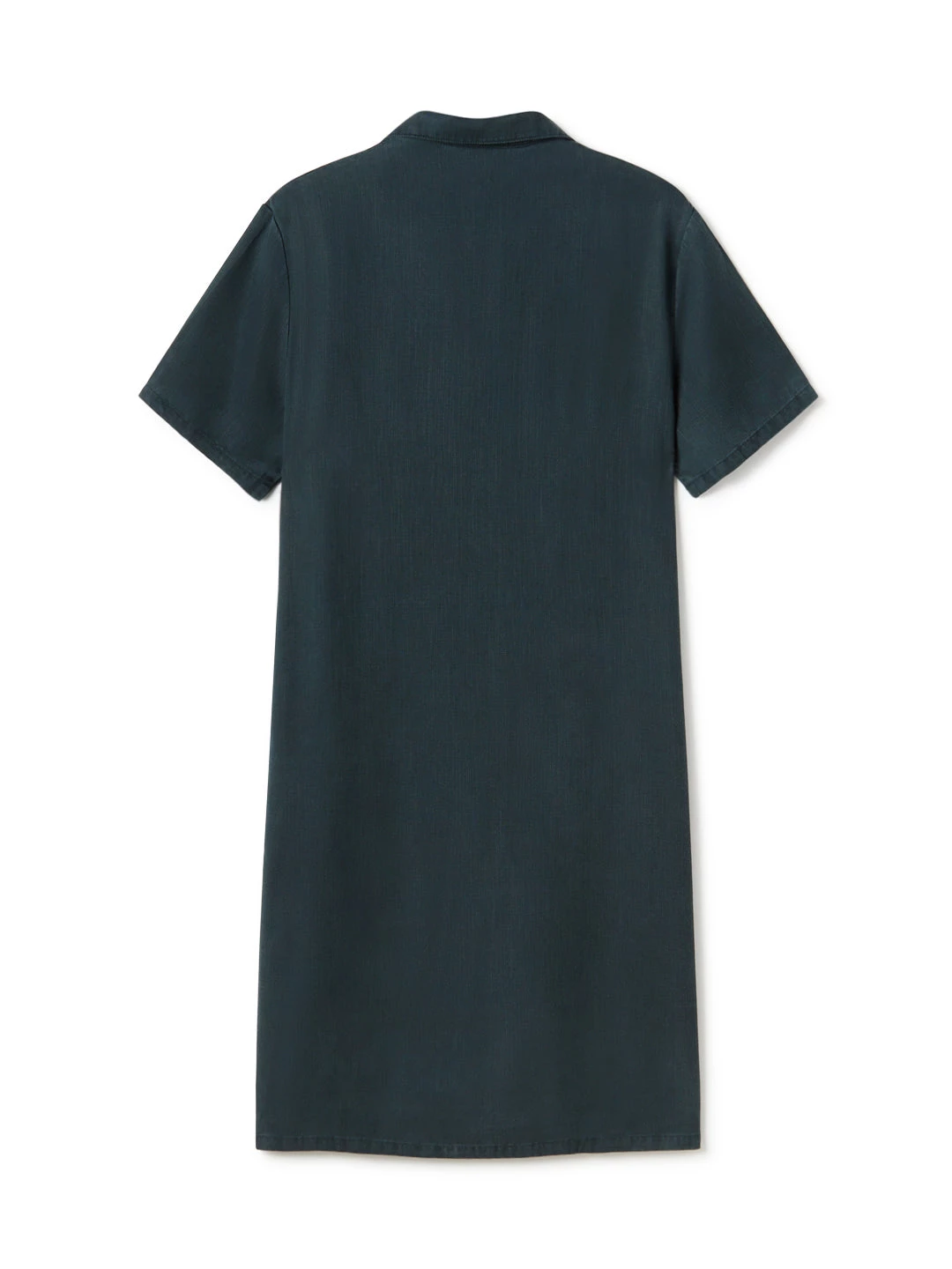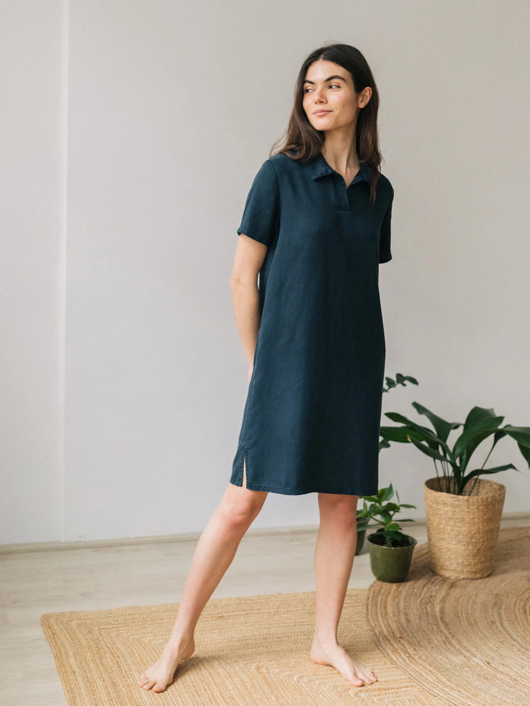 A shirt style dress, made in a soft and breathable fabric that is also sustainable. The Ginger is designed with side pockets, a regular opened collar and bottom side cuts. It comes in a regular fit and loosens up at the bottom, falling above the knees.