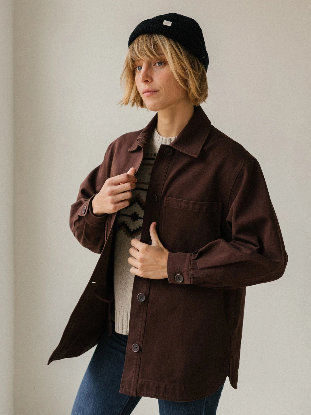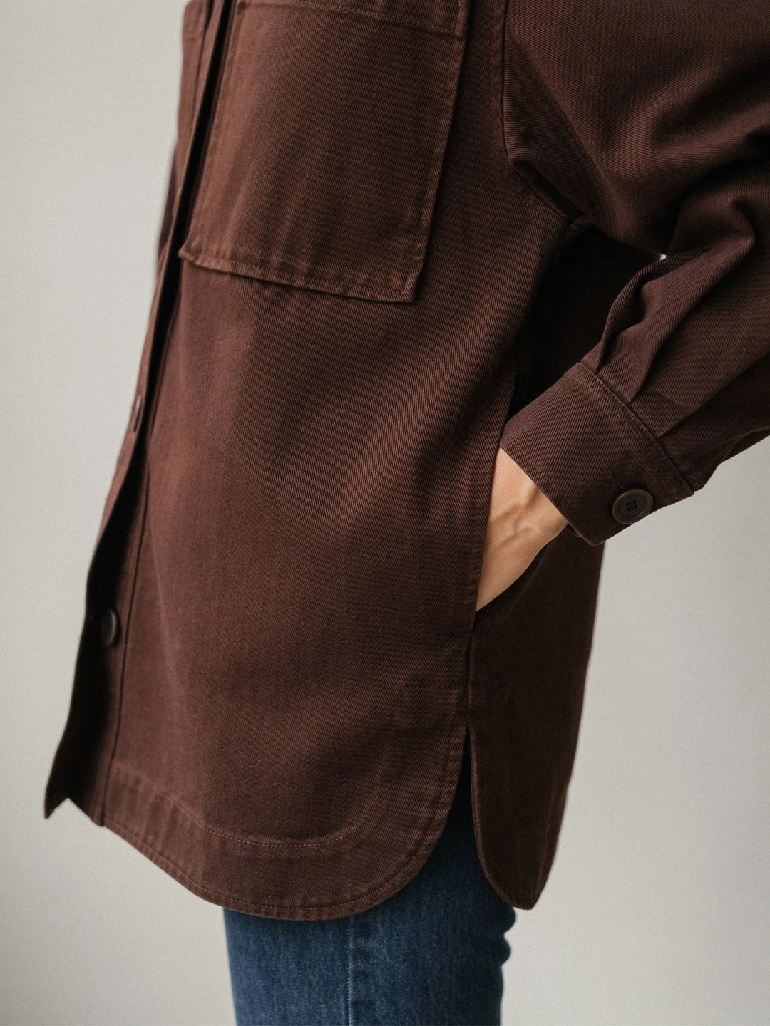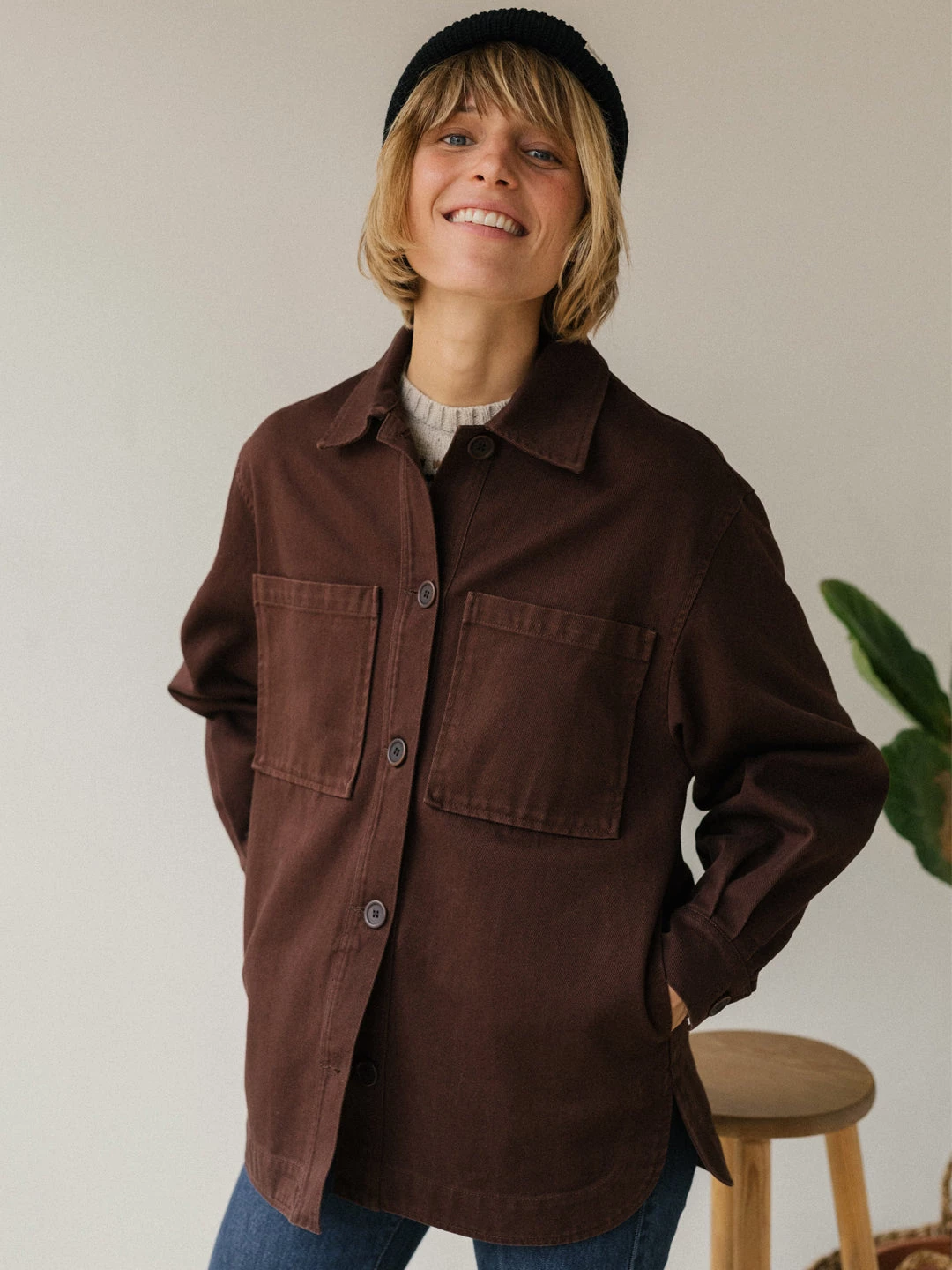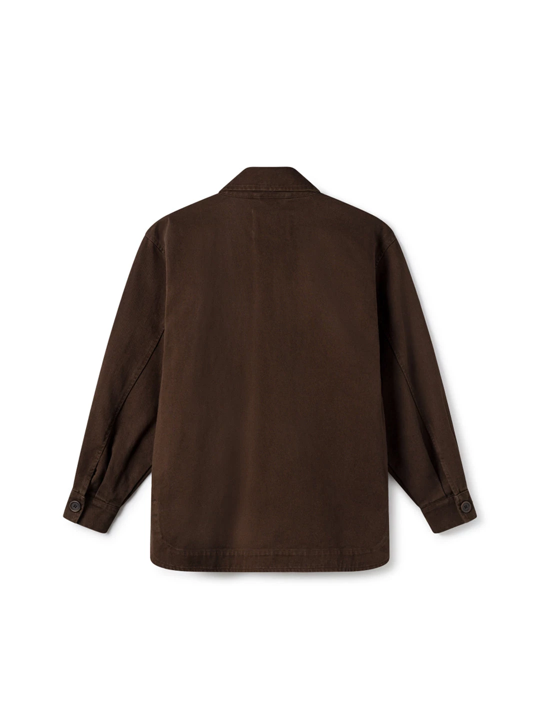 A soft and comfy shirt jacket, the Kril can enhance any sustainable collection. The jacket comes with side cuts, stylish bishop sleeves and dropped shoulders. Designed with a regular collar, naturally sourced corozo buttons and 4 pockets in total – two large ones on the chest and two on the sides. The garment has a fairly oversized fit and falls below the hips.