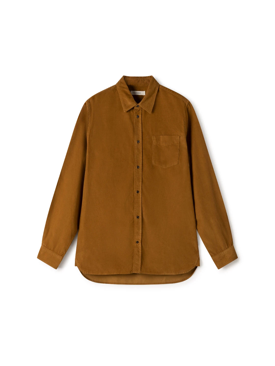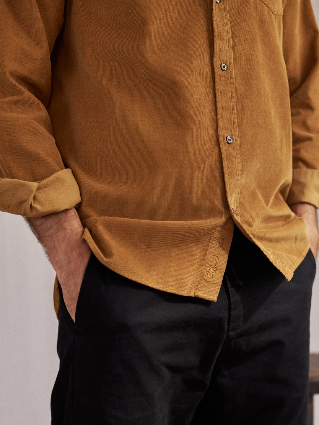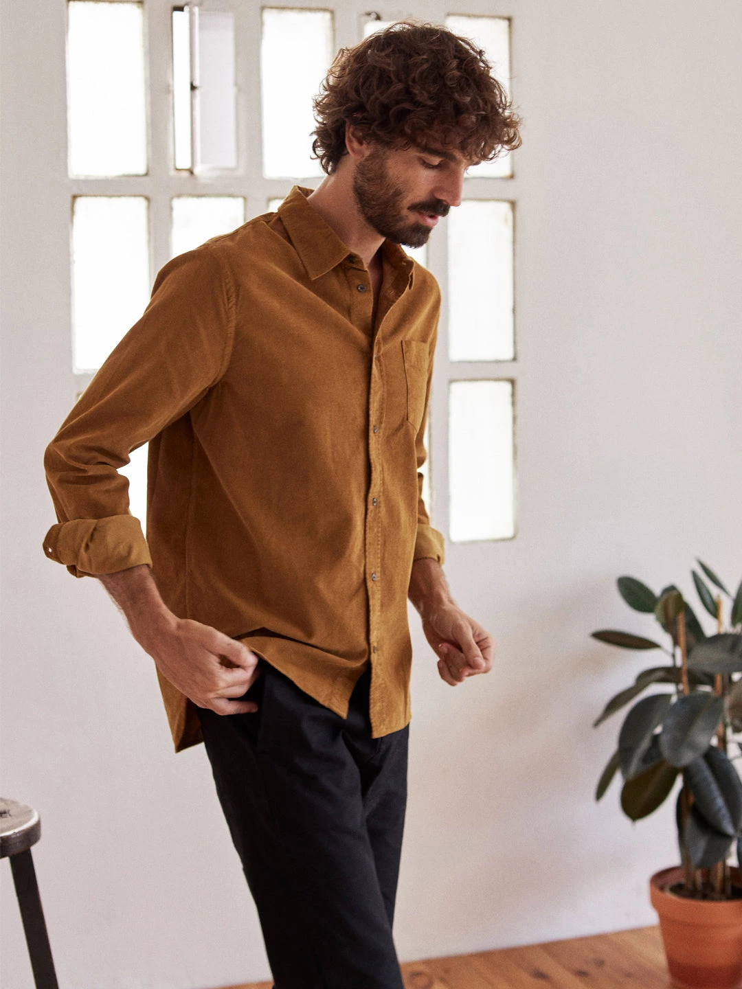 Warmer than your usual shirt thanks to its organic micro corduroy fabric, here’s the Cook. Designed with long sleeves, recycled horn buttons, a pocket on the chest with a triangular detail and “Twothirds” embroidered along the placket. The shirt comes in a regular fit and hip-length cut.