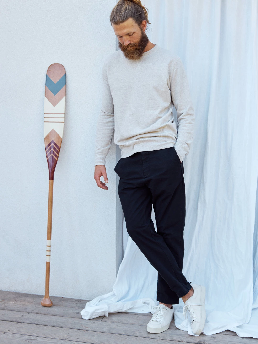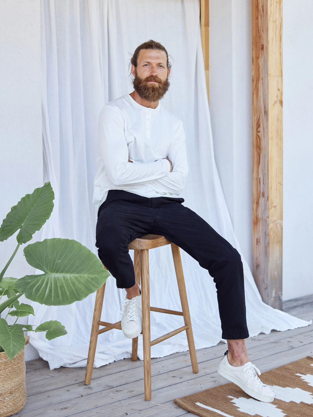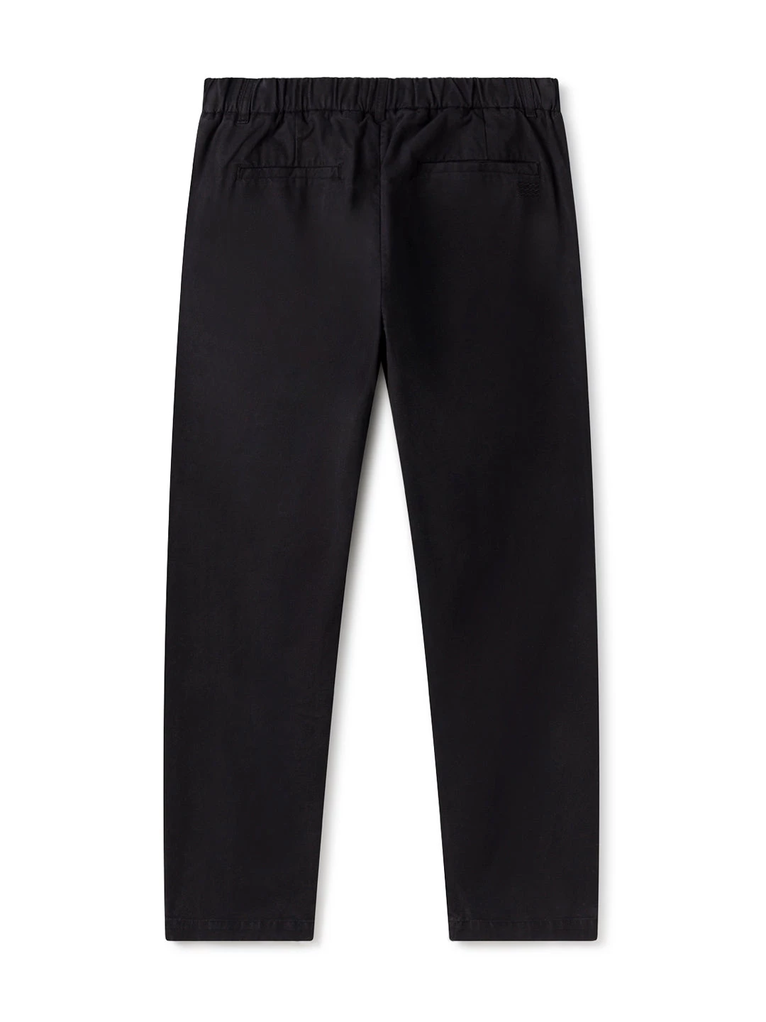 We are excited to bring the Tuvalu trousers to our collection: a classic chino style. Straight cut with 4 pockets in total – featuring wave detailing on the back ones. For greater ease, the pants come with elastic on the back and close with a fastener and snap button. Finished with an internal drawstring to adjust. They have a regular fit and fall around the ankles.Â