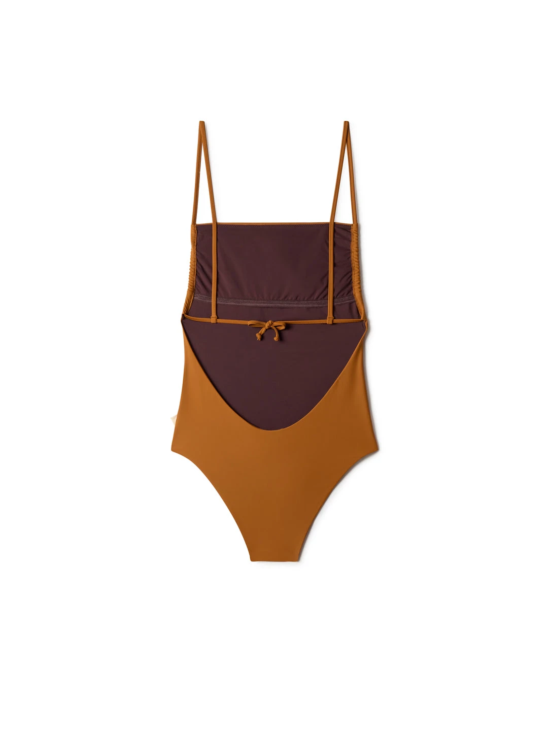 In a beautiful mustard colour and sustainable stretchy fabric: here’s the Comet swimsuit. With gathered edges at the chest and thin shoulder straps that tie on the back for comfort.Â